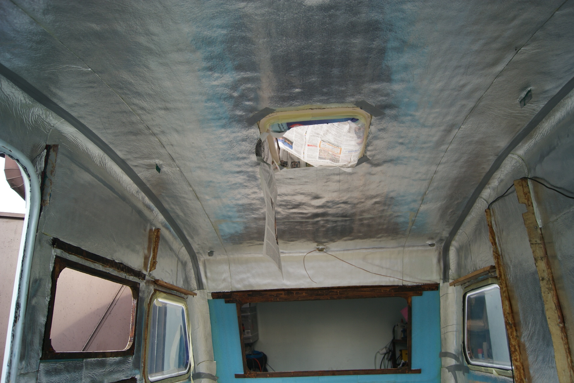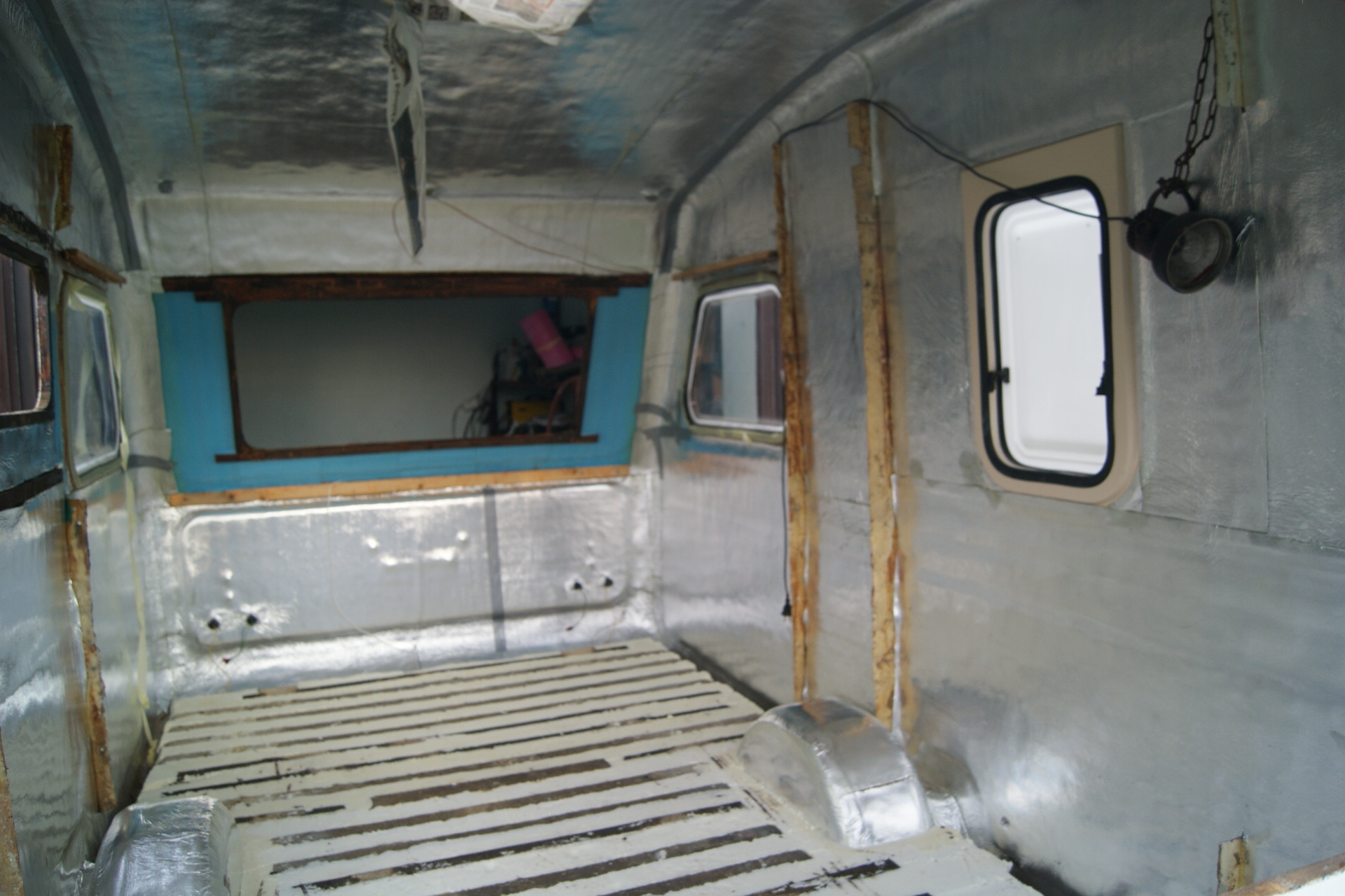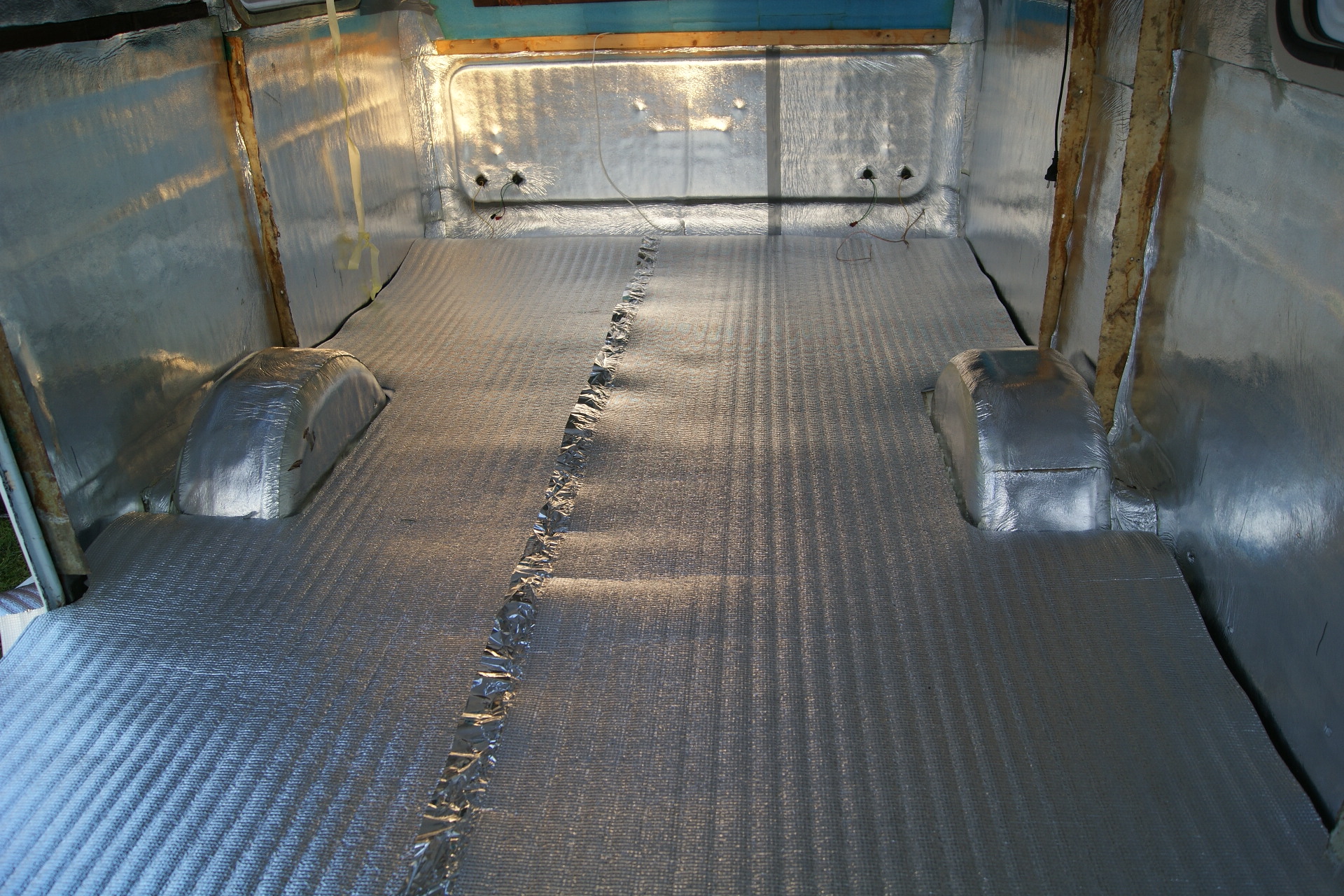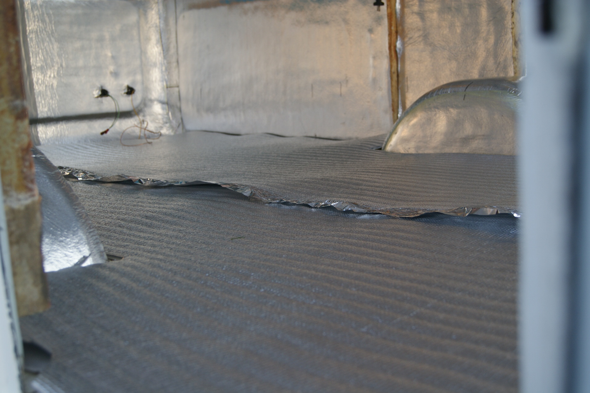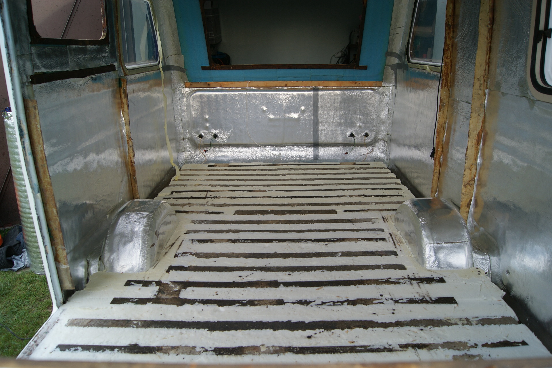 Pomysł na wypełnienie przestrzeni pomiędzy wręgami podłogi pianką zgapiłem od kolegi mannt, położyłem na podłogę dwie warstwy pianki z folią alu (w założeniu ma to pełnić funkcję izolacyjną) i przykryłem podłogą z OSB. Dookoła podłogi, przy ścianach nie aplikowałem pianki, te przestrzenie pozostawiłem w pełni drożne coby w razie "W" woda mogła jakoś spłynąć w okolice nadkoli i dalej otworkami fi8 na trawkę (mam nadzieję, że wojny jednak nigdy nie będzie i otworki na czas pokoju zaślepię jakimiś koreczkami).