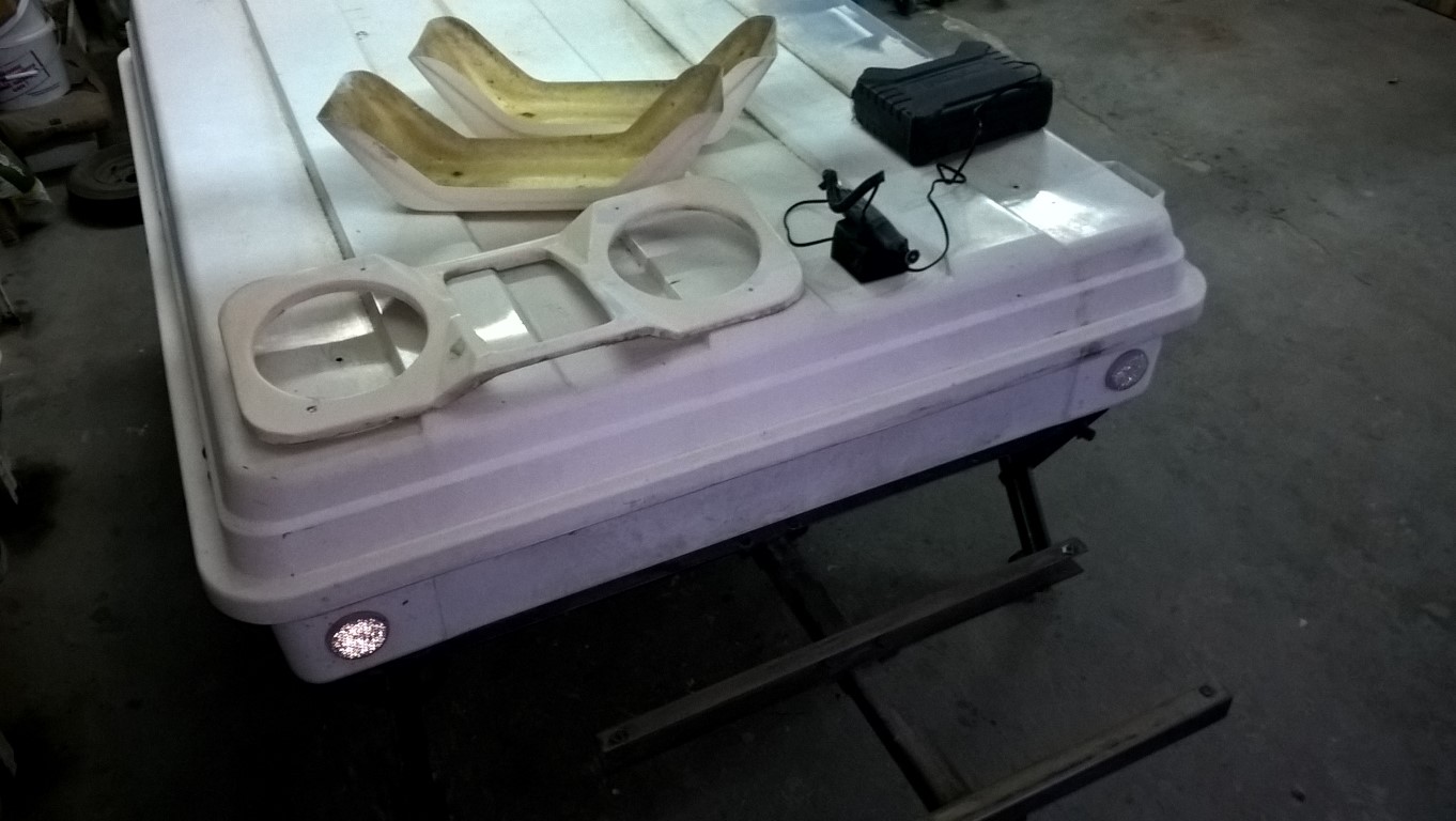 Zdemontowane zostały wszystkie elementy z laminatu poza główną bryłą przyczepy, tj. błotniki (te elementy zdemontowane zostały przy okazji demontażu osi) oraz kufer, który to został rozmontowany na dwie części.