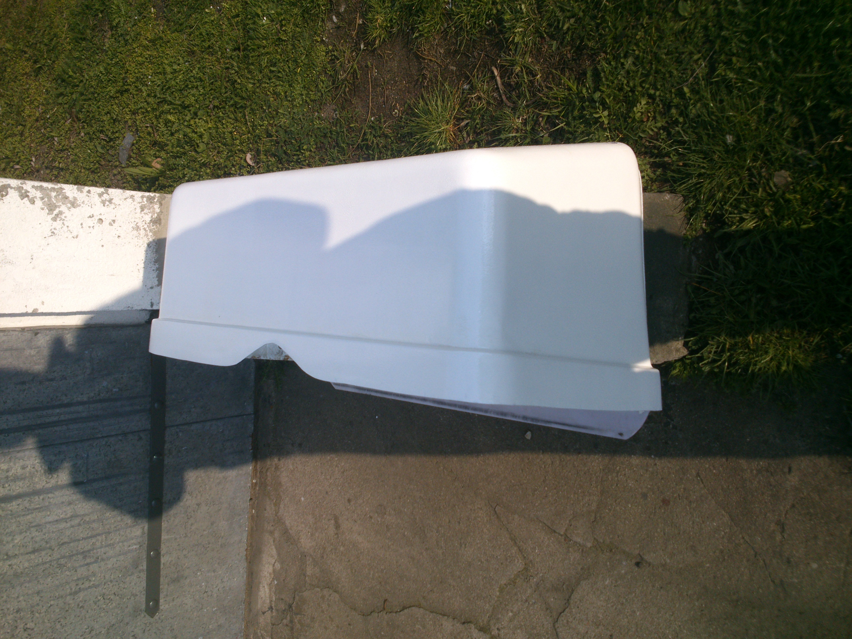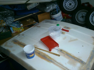 Dziś odnowiłem drzwi,podłączyłem nowe lampy i całe oświetlenie zewnętrzne przyczepy,wykleiłem daszek otwierany ekranem i remontówką,następnie pojechałem do mieszalni lakierów samochodowych,kupiłem 0.8l białej farby i do tego 0,4 litra utwardzacza,pomalowałem jeden raz daszek i naprawiony kufer zewnętrzny,malowałem wałkiem suszyłem na daszku od garażu i schowałem do całkowitego wyschnięcia do środka przyczepki.Oczywiście pomoc kolegów była dziś niezastąpiona.Niestety mało miejsca w garażu ale jakoś dałem radę.