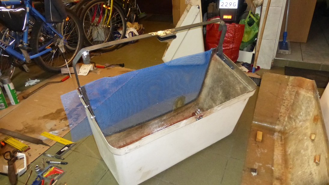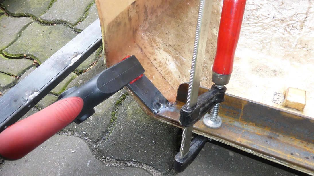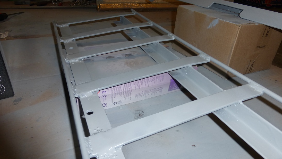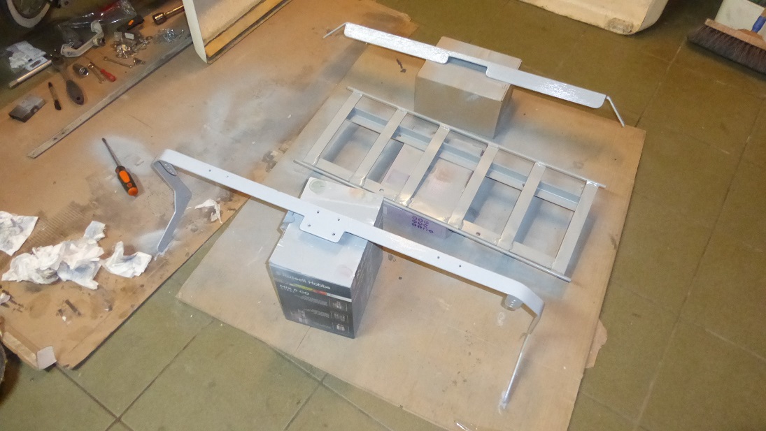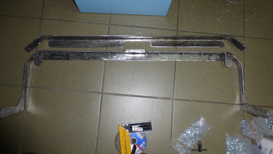 Wczorajsza robota to ostatnia już zabawa z żelastwem czyli stelaż pod butle. Jak wspomniałem wcześniej, ma on zapewnić delikatne pochylenie butli aby w górnej części nie znajdowała się niebezpiecznie blisko ściany przyczepy no i nie kolidowała z wklejoną w kufer siatką. Do budowy posłużył płaskownik taki jak do górnego pałąka, kątownik (też 30mm) oraz pręt gładki fi 8mm. Wyszło coś takiego, tak jakby ruszt. Pręty są po to aby butle można było porządnie zamocować przy pomocy pasów. Dzięki takiej konstrukcji butlę można postawić i przymocować w dowolnym miejscu kufra.