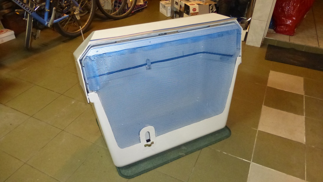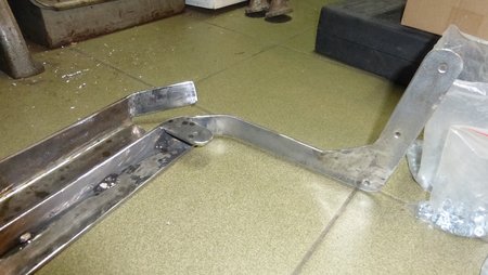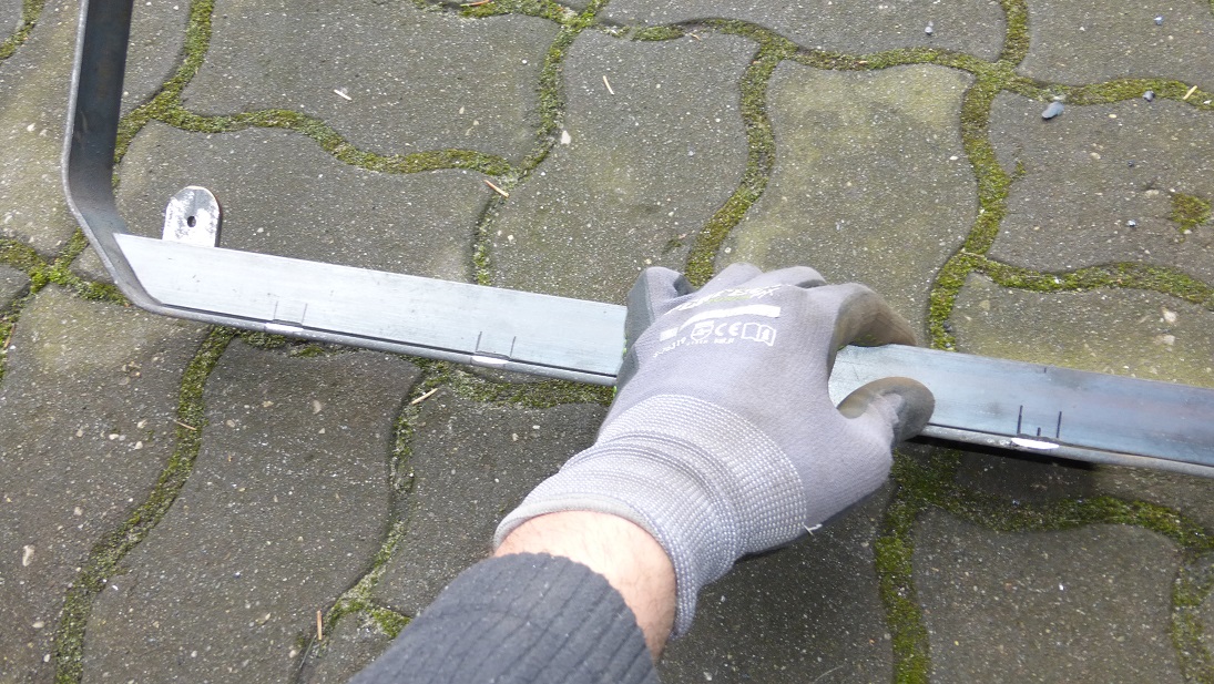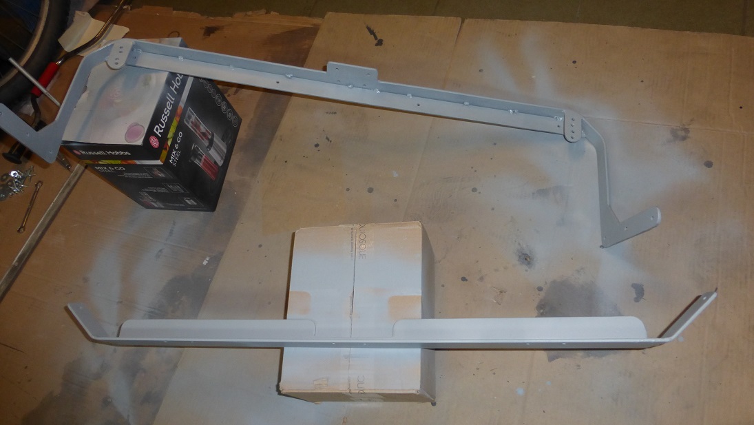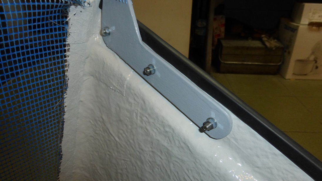 Wczorajsza robota to ostatnia już zabawa z żelastwem czyli stelaż pod butle. Jak wspomniałem wcześniej, ma on zapewnić delikatne pochylenie butli aby w górnej części nie znajdowała się niebezpiecznie blisko ściany przyczepy no i nie kolidowała z wklejoną w kufer siatką. Do budowy posłużył płaskownik taki jak do górnego pałąka, kątownik (też 30mm) oraz pręt gładki fi 8mm. Wyszło coś takiego, tak jakby ruszt. Pręty są po to aby butle można było porządnie zamocować przy pomocy pasów. Dzięki takiej konstrukcji butlę można postawić i przymocować w dowolnym miejscu kufra.