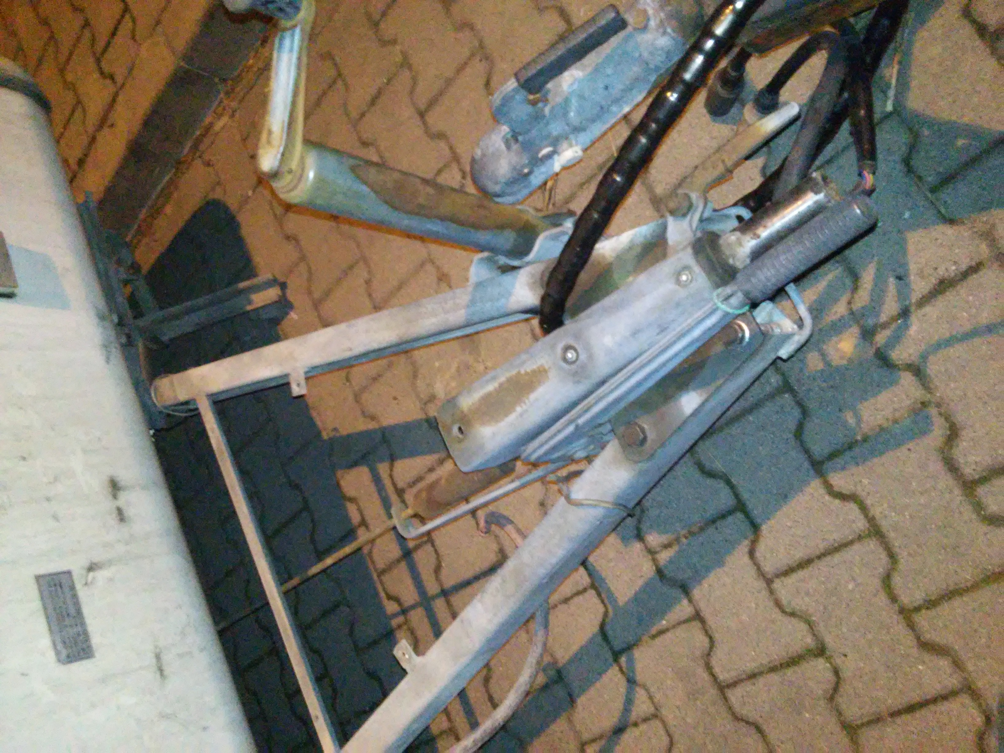 Skoro cały najazd nie chciał się odkręcić - śruby przyrdzewiały chyba na stałe i nawet palnik i klucz udarowy ich nie rusza..., to pomijając opcję cięcia i szukania nowych śrub i tulejek, nie pozostało nic innego jak rozbierać wszystko "na przyczepie". Do wyjęcia amortyzatora najazdu konieczne było jednak ściągnięcie całego kufra - i z tym chyba zeszło najdłużej, bo mało wygodny uchwyt dwóch kluczy jednocześnie