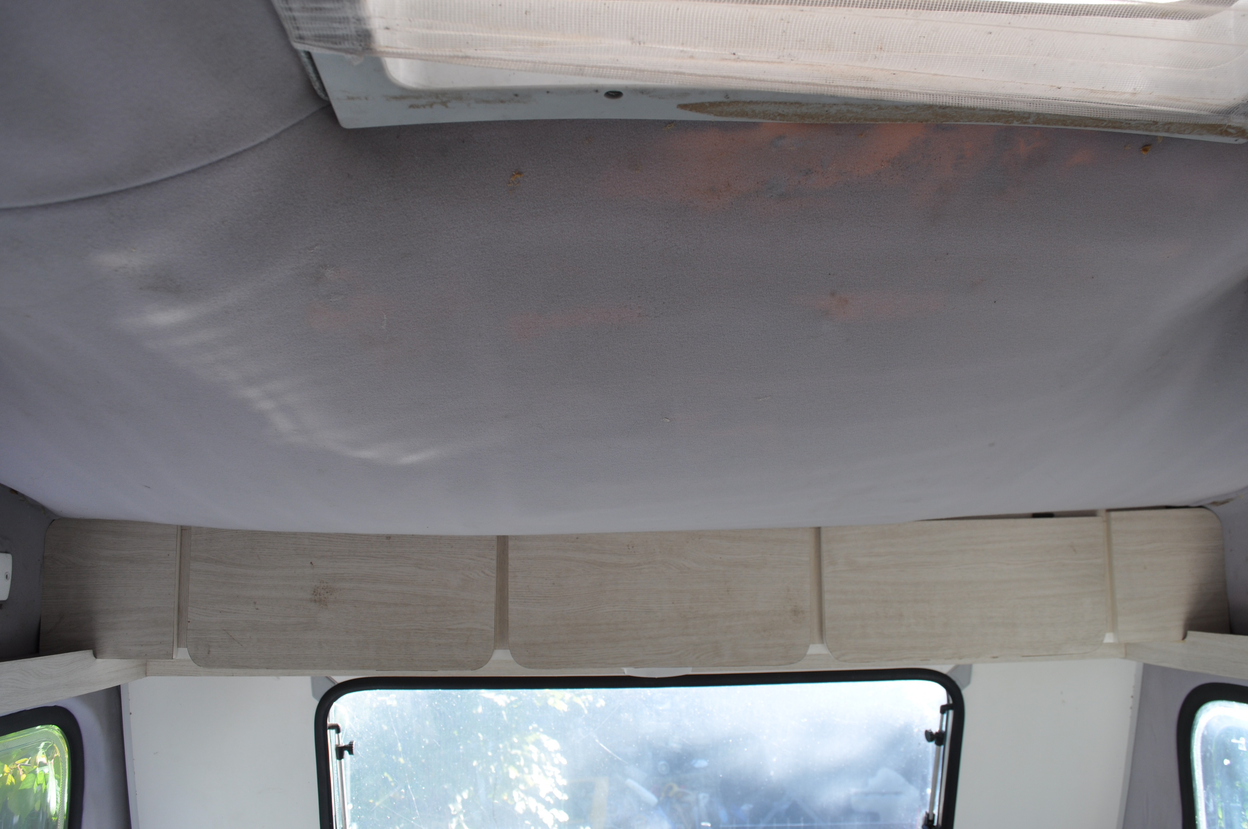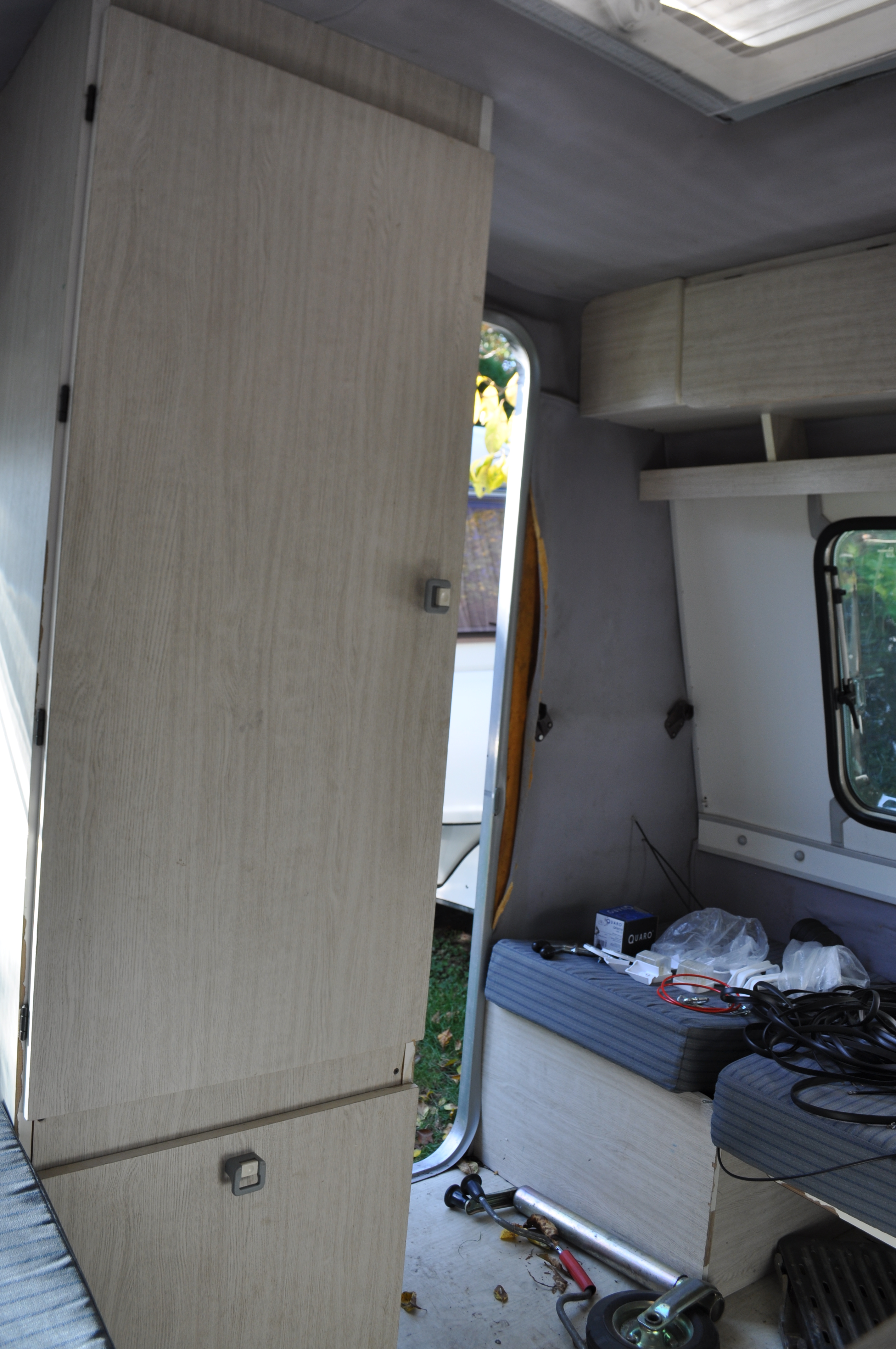 Tapicerka trafiła w kolorze miodowym, płyty okienne w kolorze buk w całości, nie dzielone jak to było fabrycznie. Wlaminowane zostały dodtkowe listwy pionowo pomiędzy oknami a ścianą boczną, płyta do tych listew została przyklejona na K+D aby pod wpływem wilgoci nie deformowała się za szybko. To samo robiłem w drugiej przyczepie.