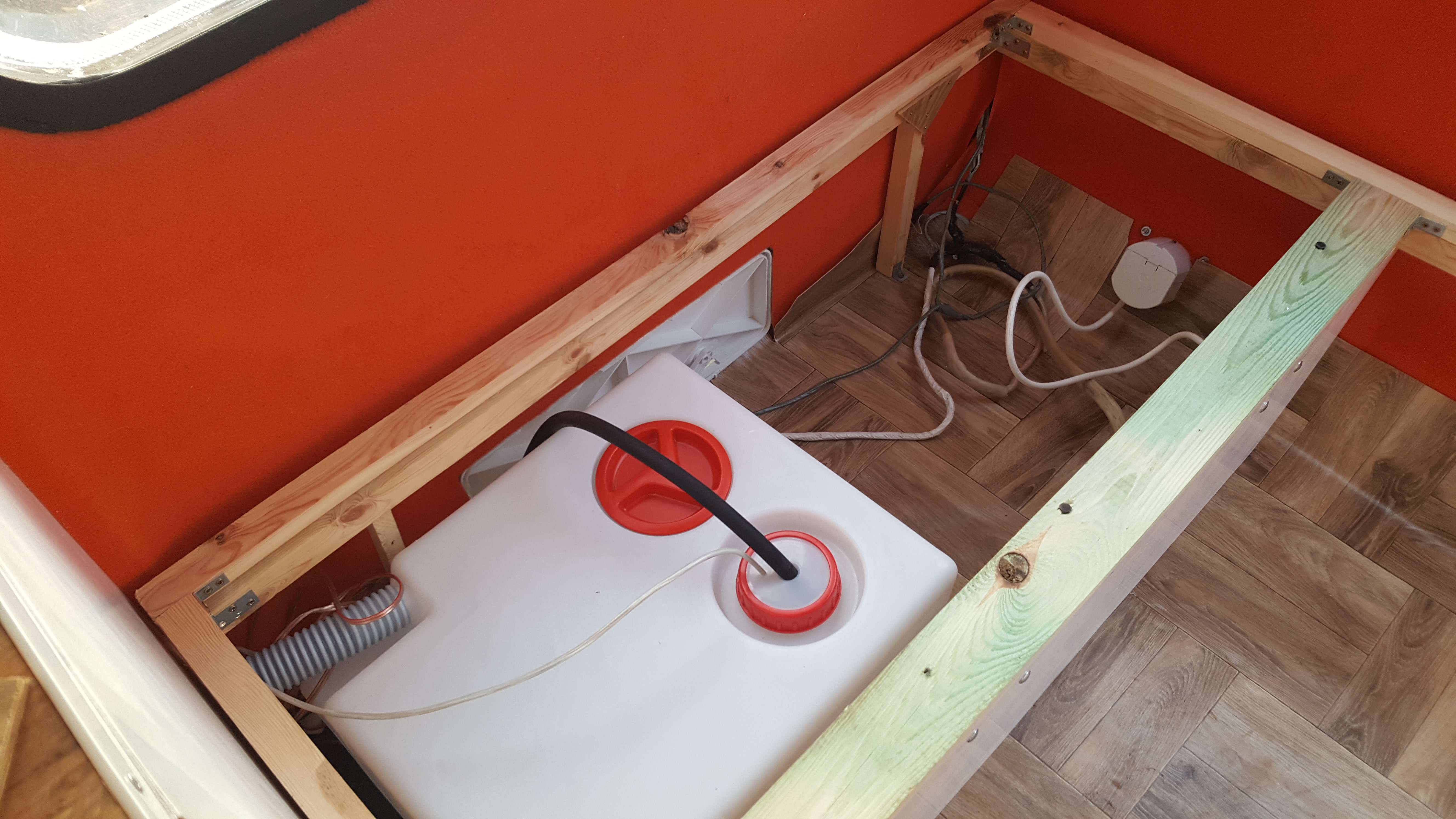 No to dalej z opowieścią. Efekt domina zmusił nas do przeniesienia zbiornika wody który był wcześniej w miejscu gdzie teraz stoi kubeł. Wpadł więc nowy zbiornik 50l wraz z zewnętrznym wlewem wody. Zbiornik zasłonił połowę drzwi serwisowych bakisty, ale trudno inaczej nie da się tego zrobić, dostęp jakiś jest, a nic ciężkiego i tak nie może już po tej stronie podróżować.