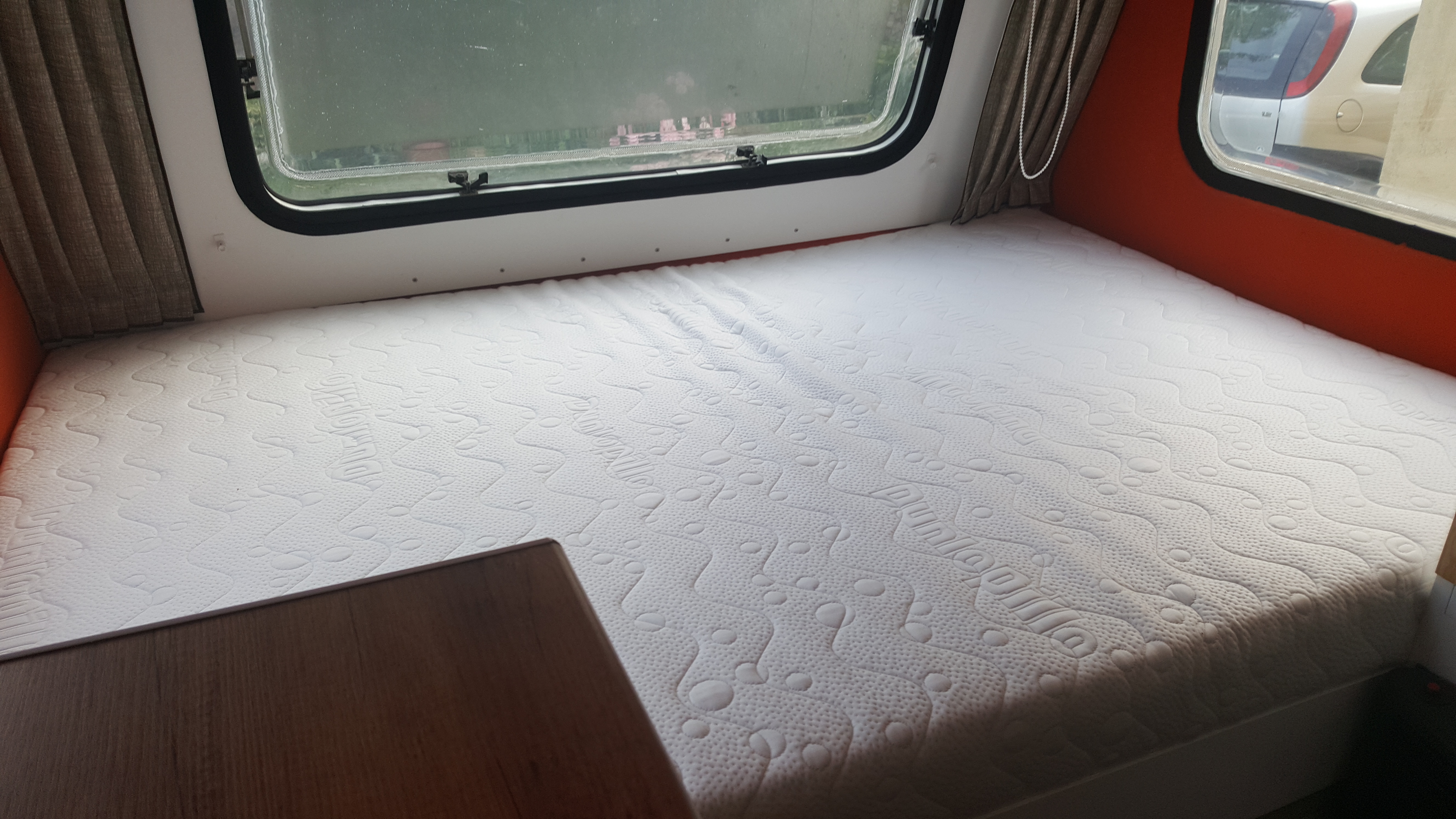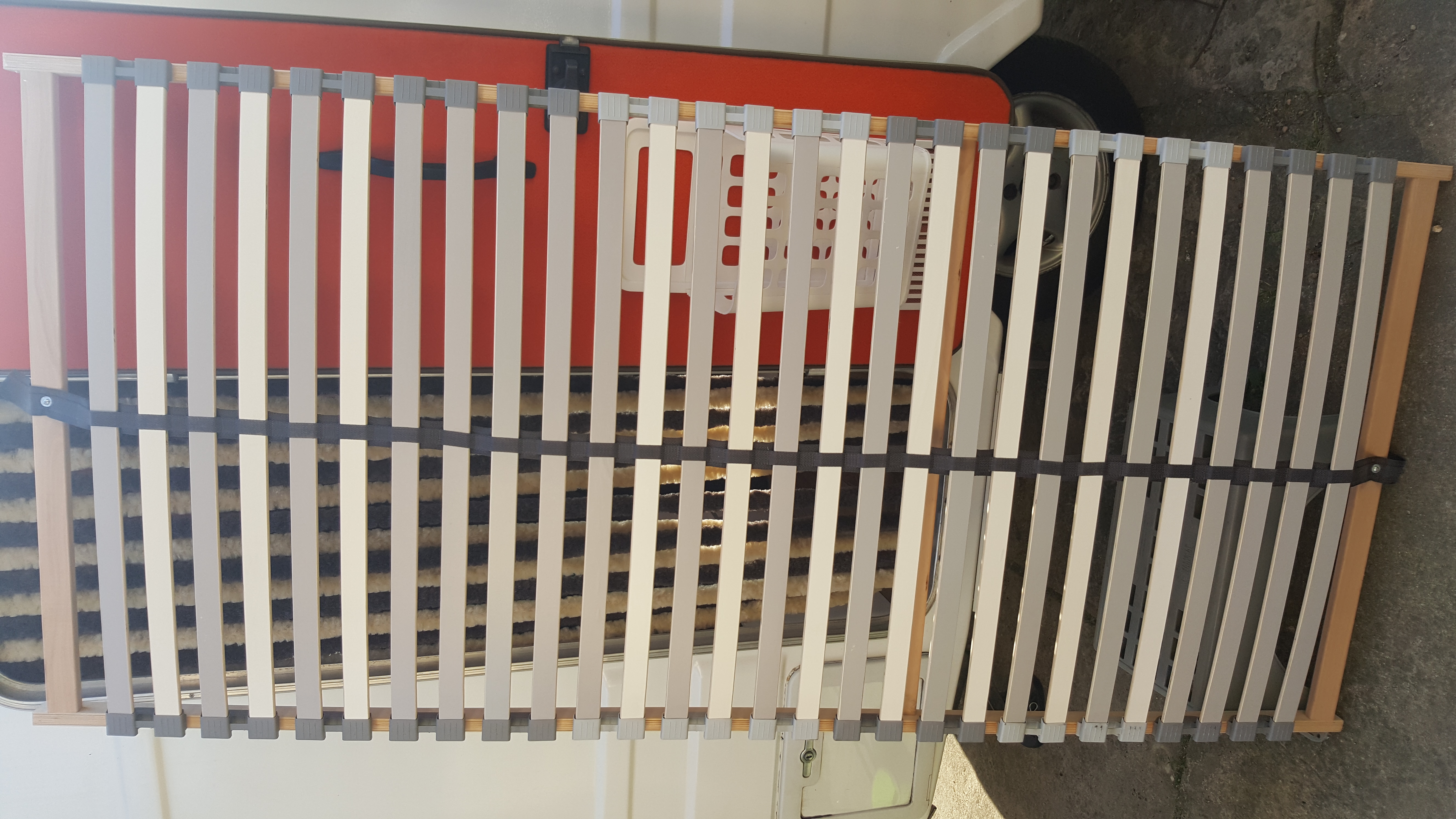 Materac w dwóch twardosciach, niestety źle sobie obliczyłem siłę sprężyn gazowych. 250N to trochę za mało i będę musiał wymienić na 500N. Niby jest ok, ale chciałbym żeby rama otwierała się samoczynnie po lekkim uniesieniu. Całość łóżka poszła lekko w górę, ale w niczym to nie przeszkadza. Wyro wydaje się być super wygodne i czeka na testy