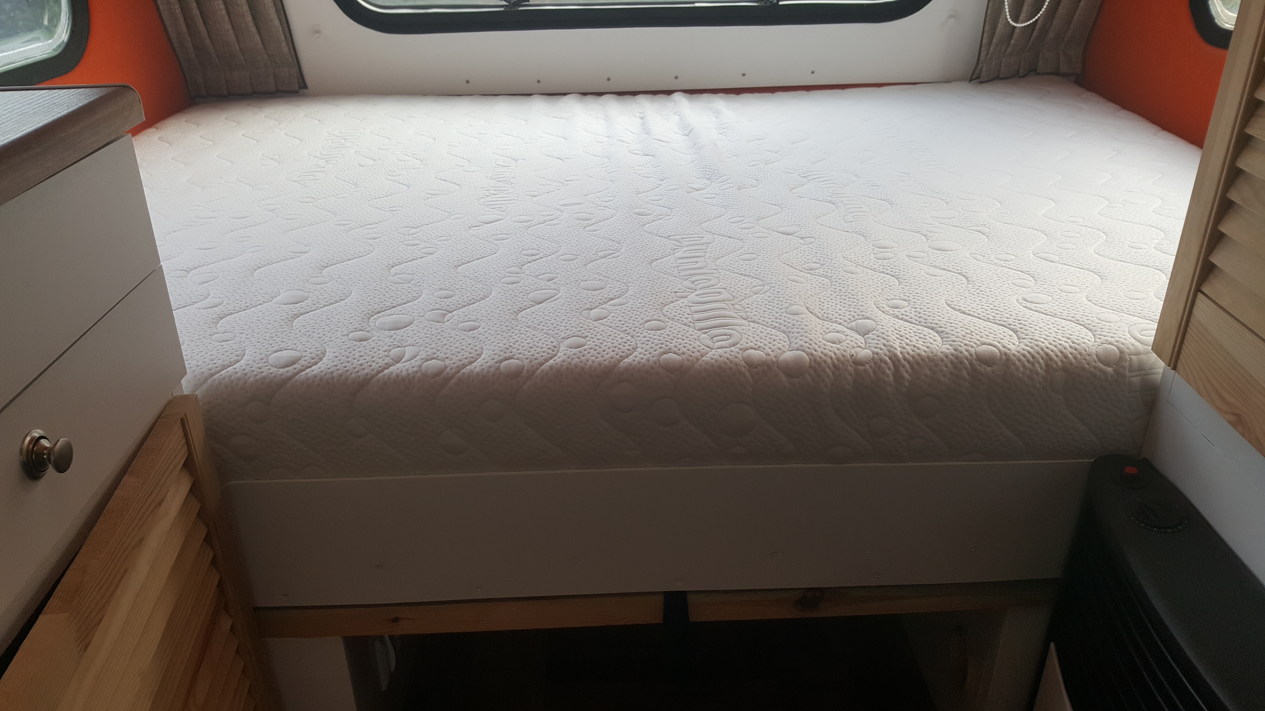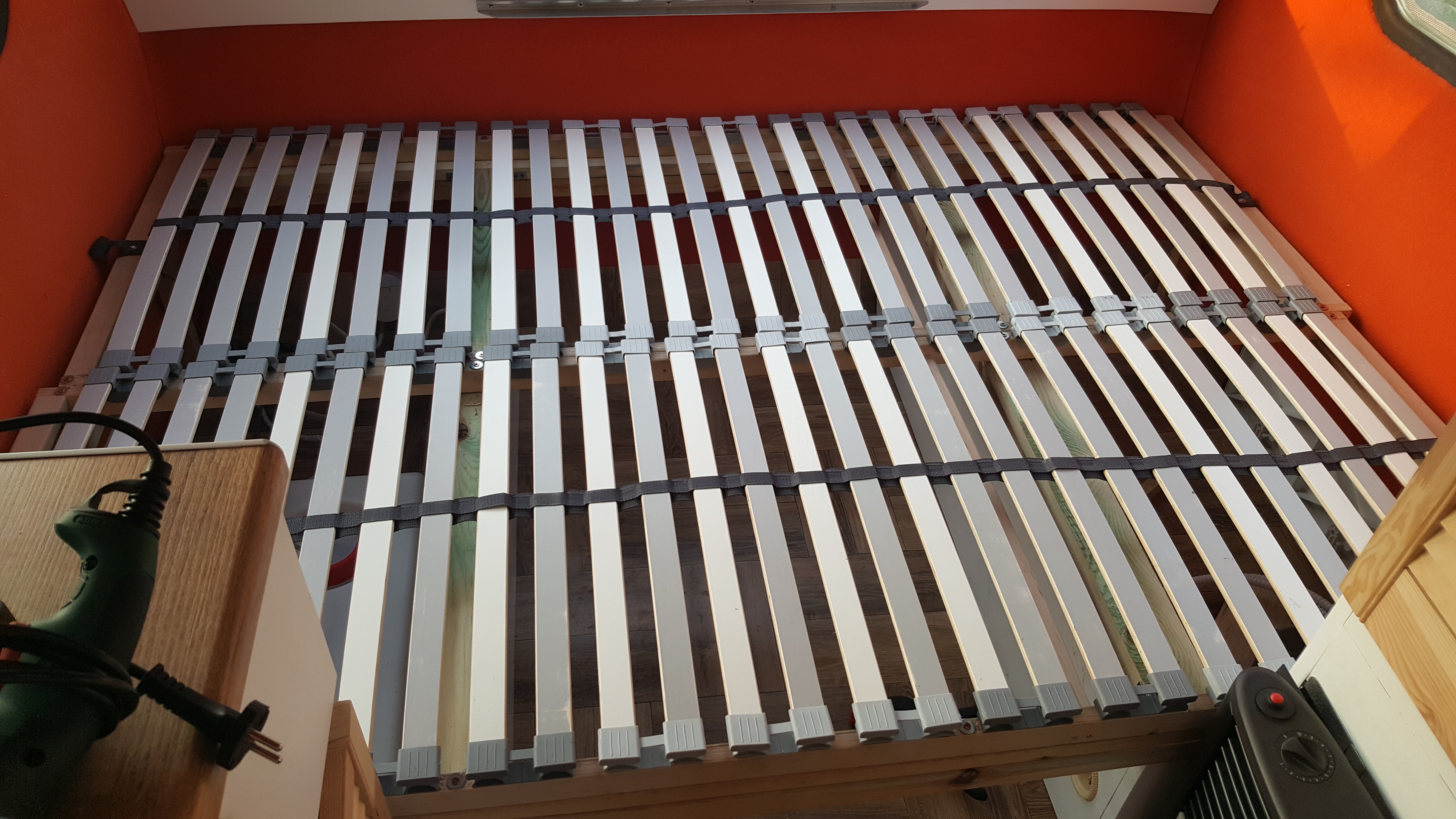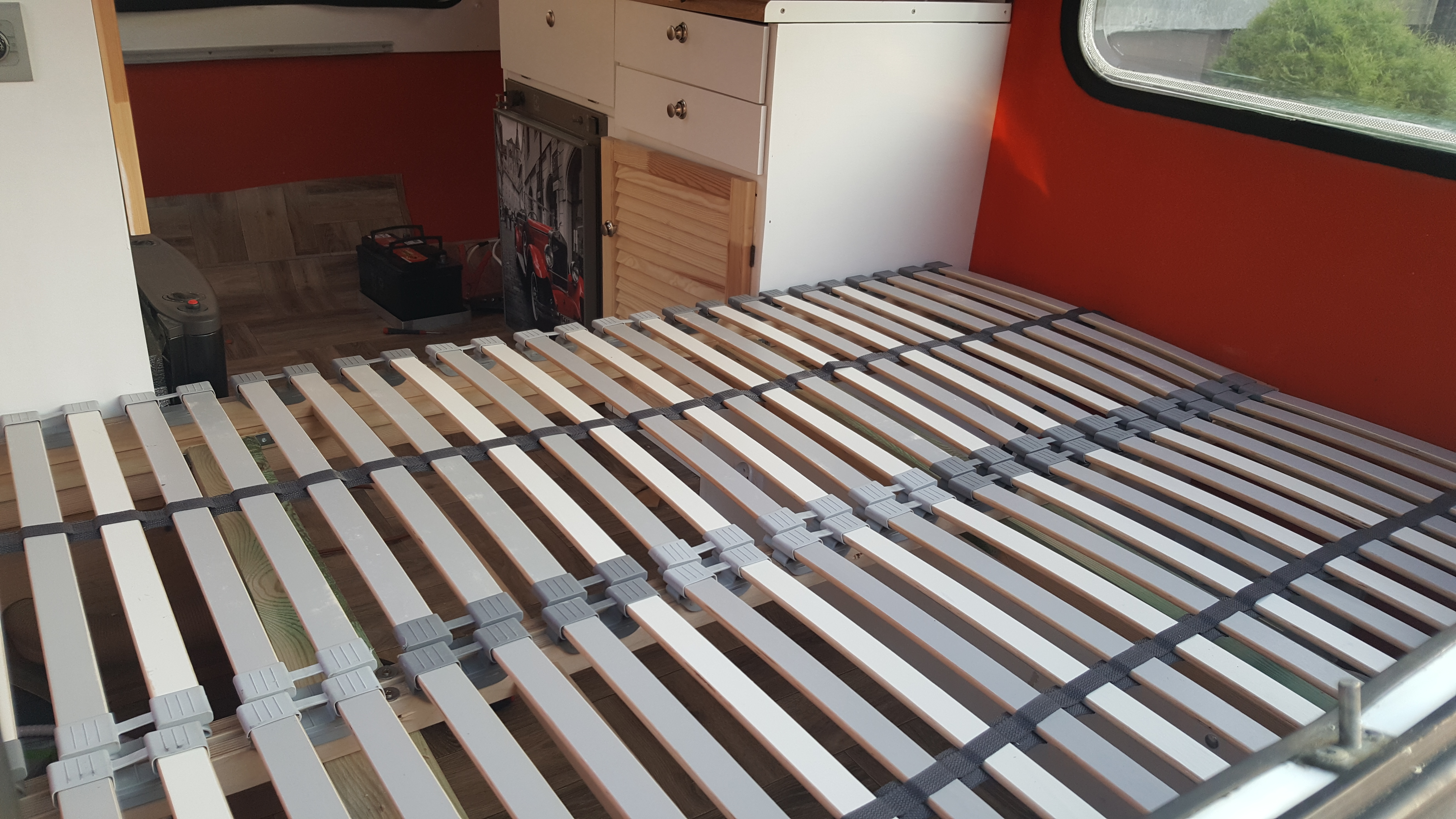 Teraz coś na co poświęciłem sporo czasu. Jeszcze w zapieksie nie spało nam się za wygodnie, niby ok ale coś jednak nie do końca, więc mieliśmy plan żeby zrobić sobie tutaj wygodne wyro. Po pierwszych nocach wyszło, że śpi się w ence całkiem wygodnie, ale jak się powiedziało A, to trzeba też powiedzieć następną cyfrę.
