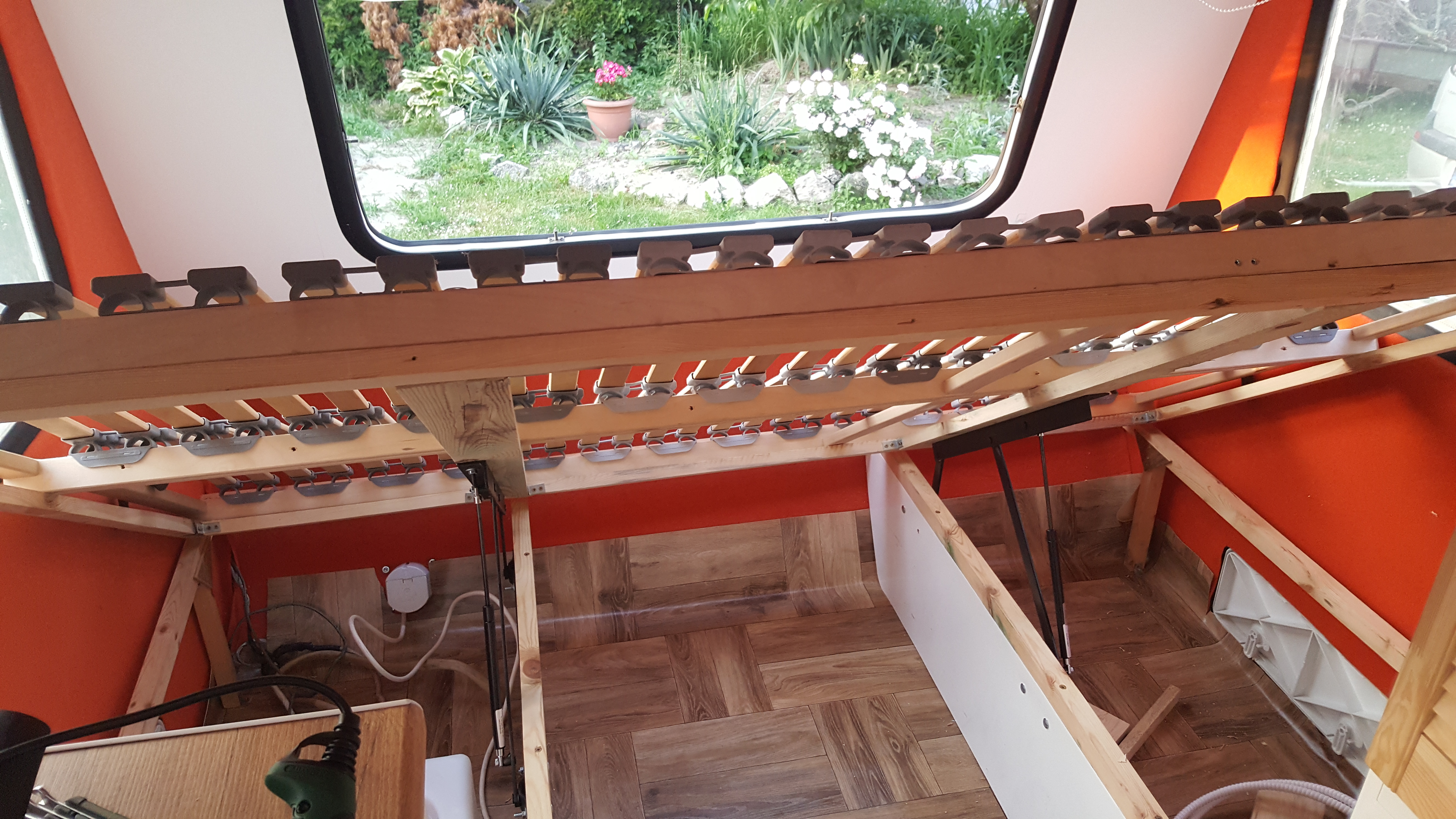 Bakistę pod kibelek zostawiłem w oryginale, podniosłem tylko o 2 cm wieko. Duże łóżko zrobiłem w ten sposób że mogę go zdemontować i założyć z powrotem oryginalne bakisty i stolik.