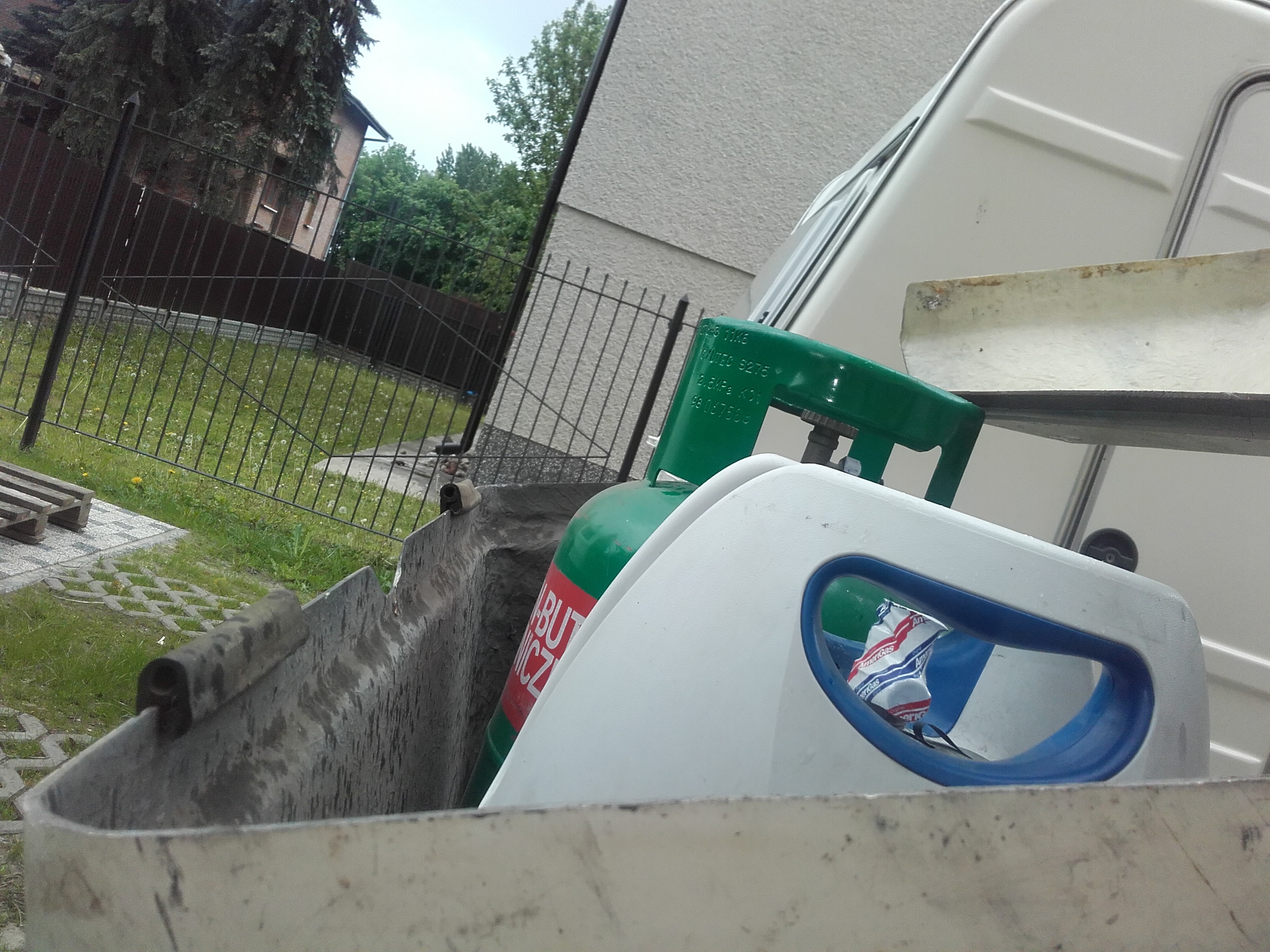 Z lewej strony od butli (patrząc od przodu) wywaliłem 2 pręty pionowe, żeby zyskać na miejscu i w to miejsce idealnie wszedł baniak 20l z Leroy Merlin. W kufrze przymocowany tylko na gumkę, bo nie wożę tam wody - nalewam na kempingu, albo w domu - ale jak w domu to baniak jedzie w aucie, bo by bardzo dociążył hak.