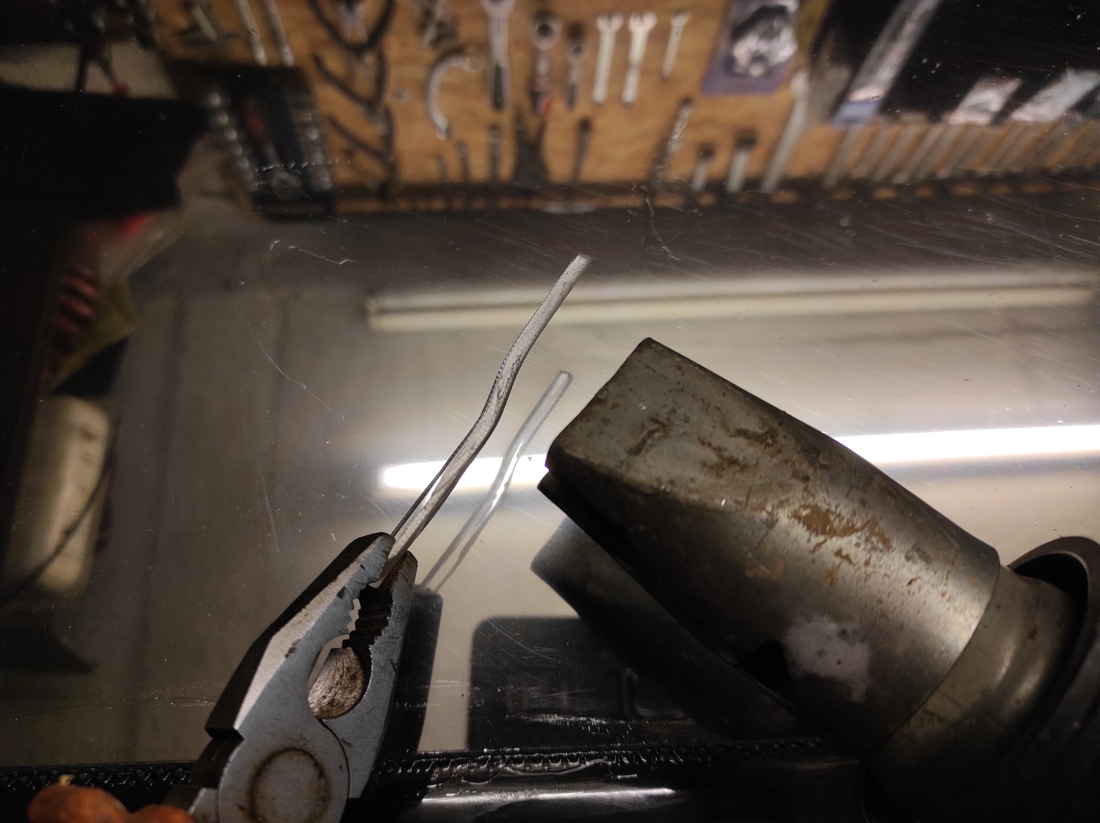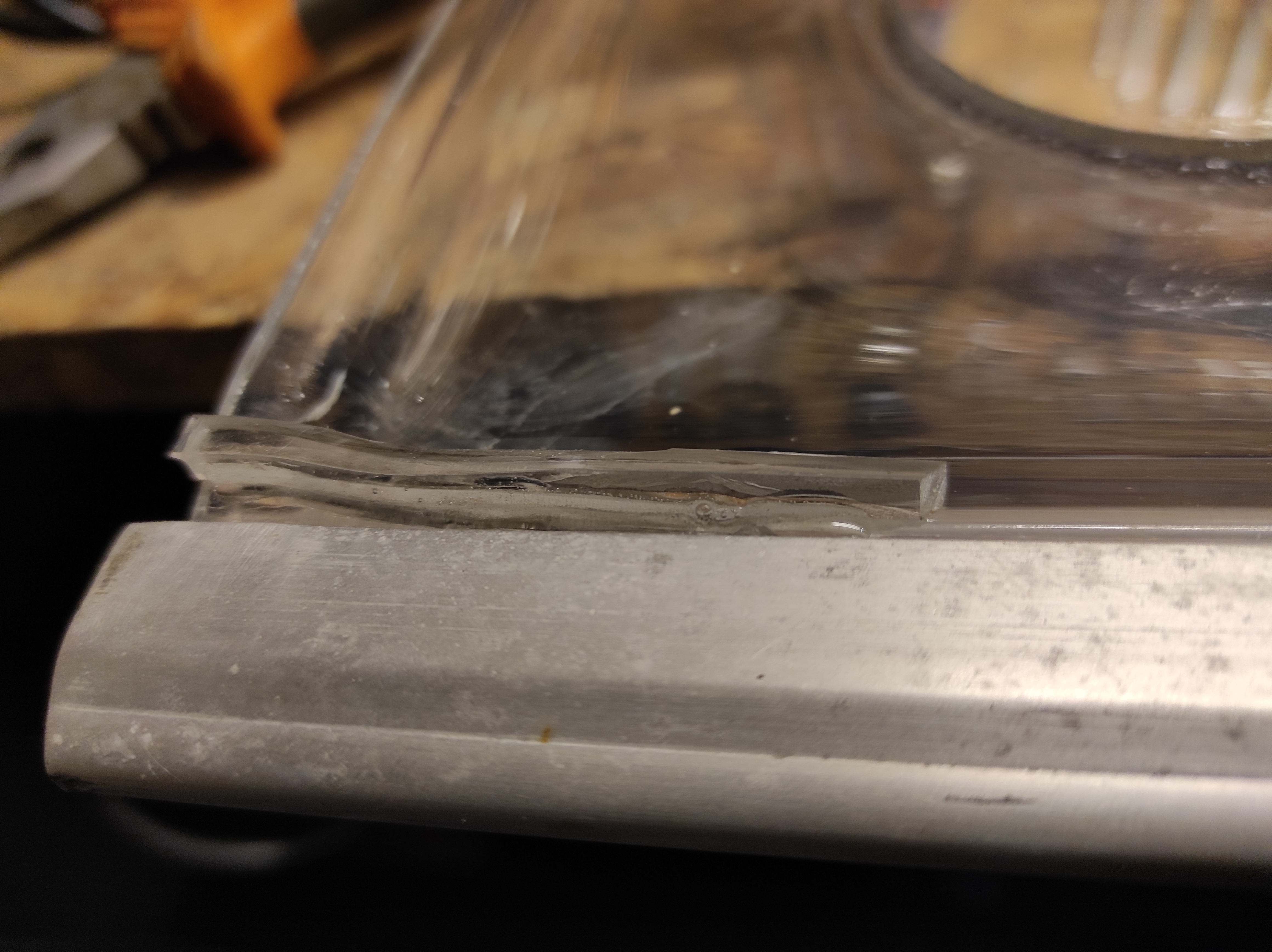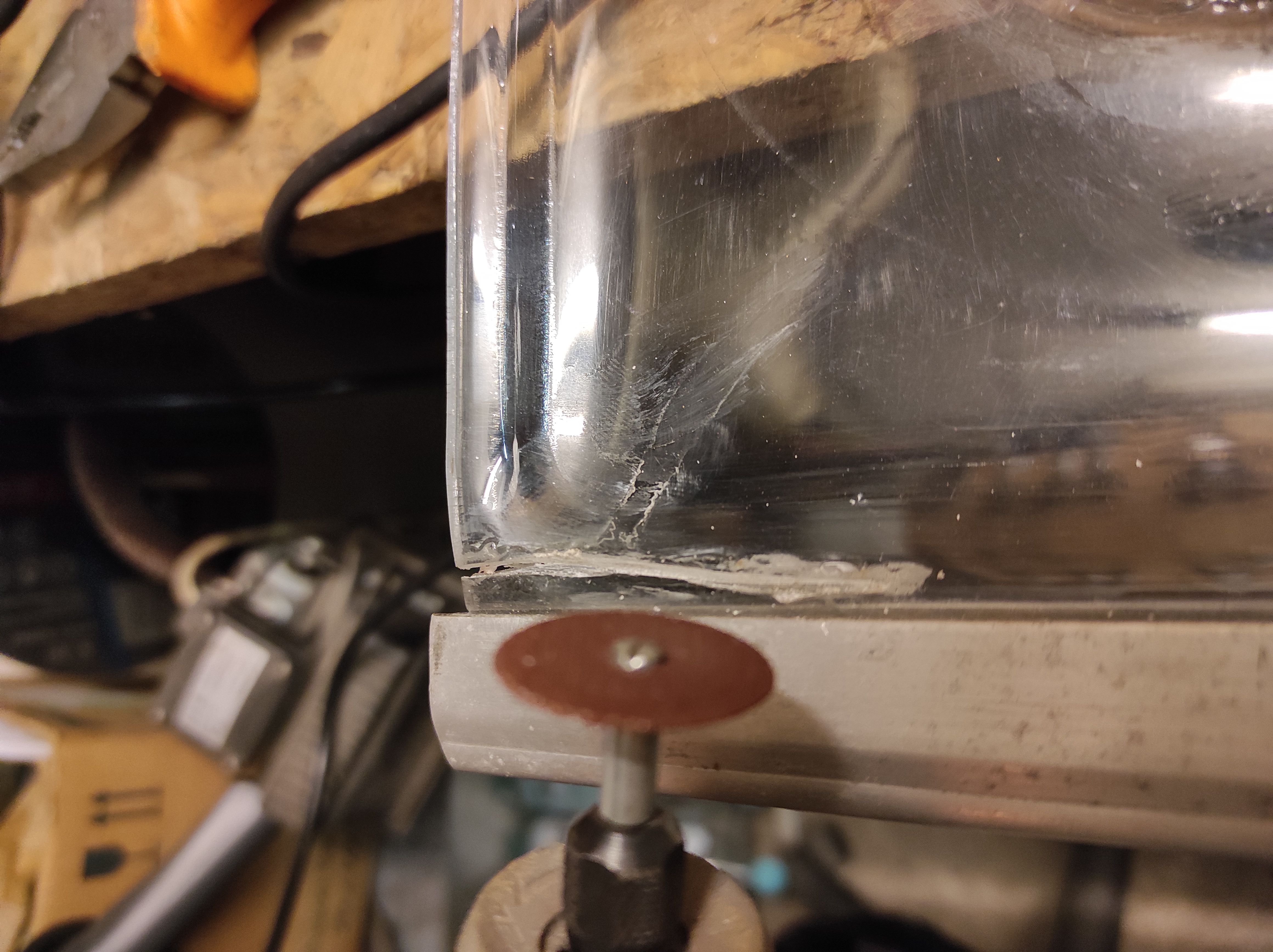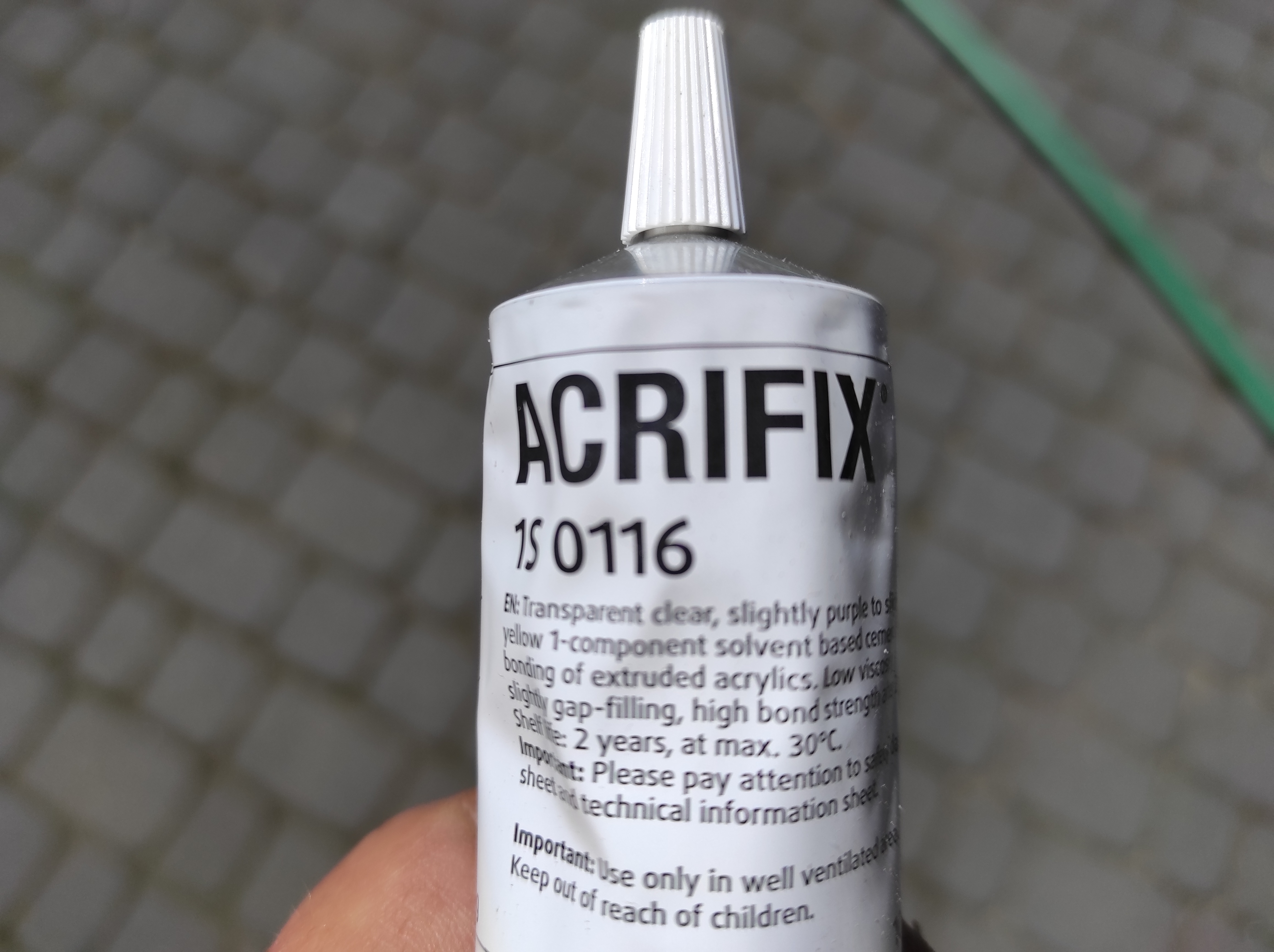 Naprawiłem też pęknięcie szyby przy zawiasie które już mam od dłuższego czasu. Przed klejeniem pogłębiłem delikatnie pęknięcie i uformowałem pasek pleksi za pomocą opalarki. Klej to przedyskutowany tutaj Acrifix 1S 0116. Jest wodnisty, łatwo się aplikuje i jedna tubka spokojnie wystarcza na dwie duże szyby. Zobaczymy jak ten klej się sprawdzi.