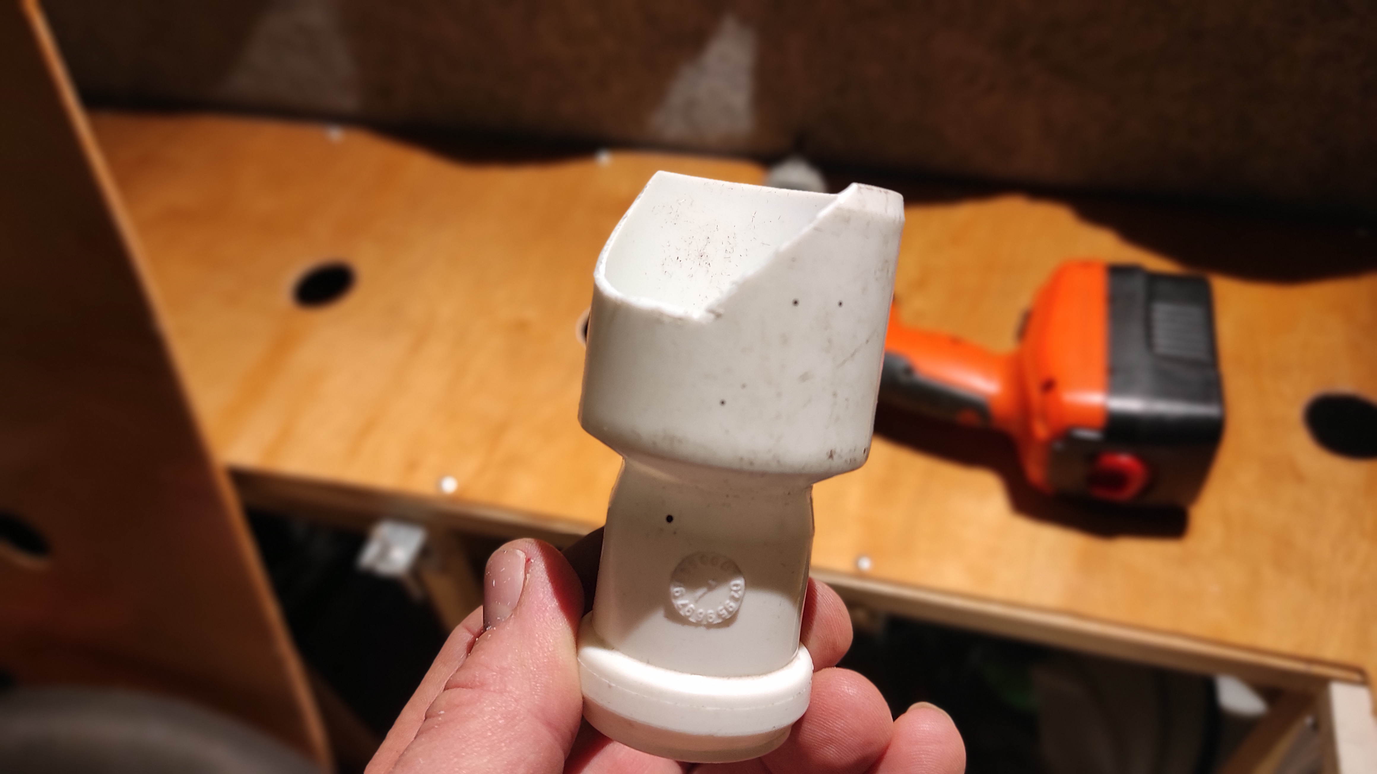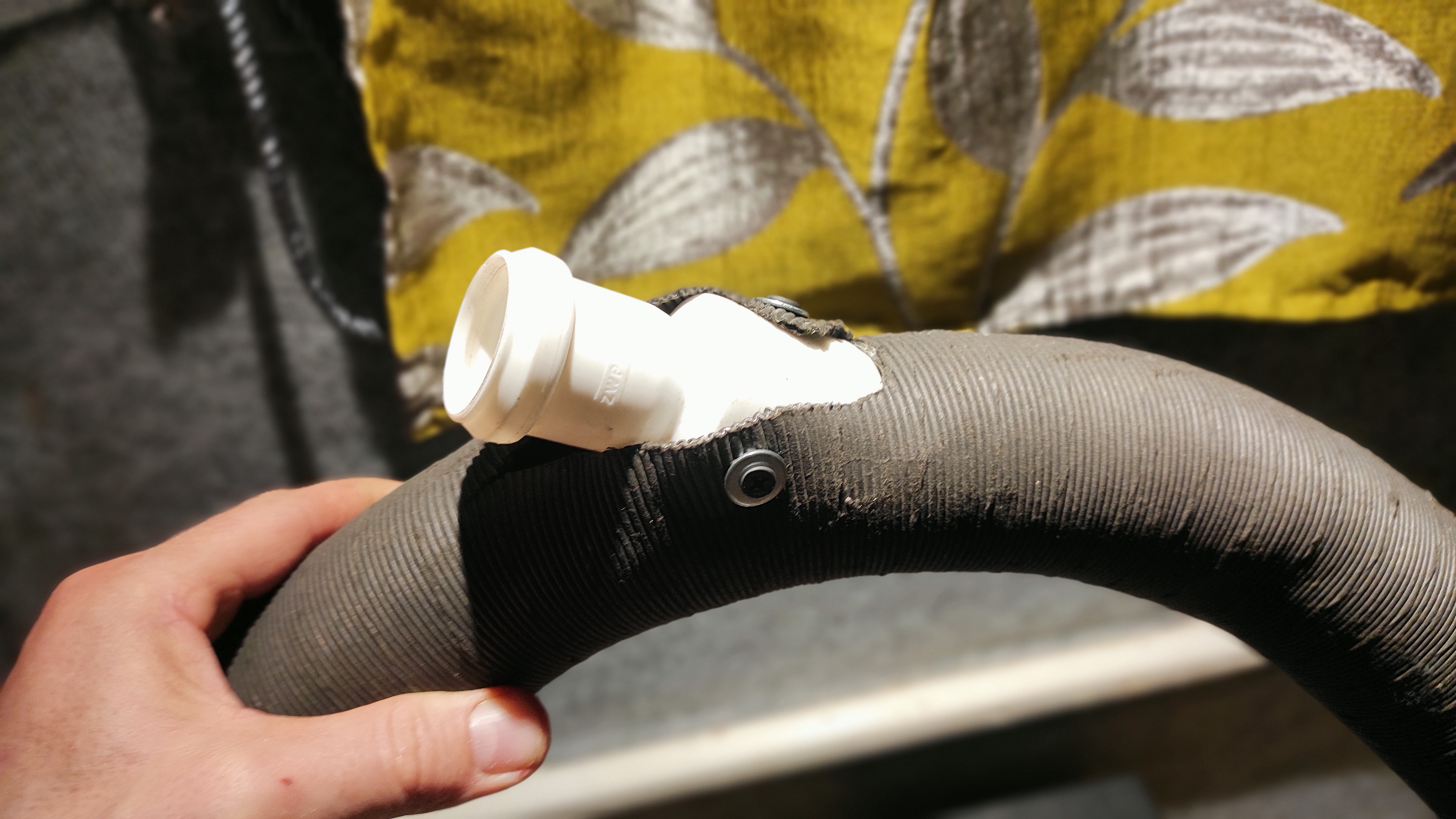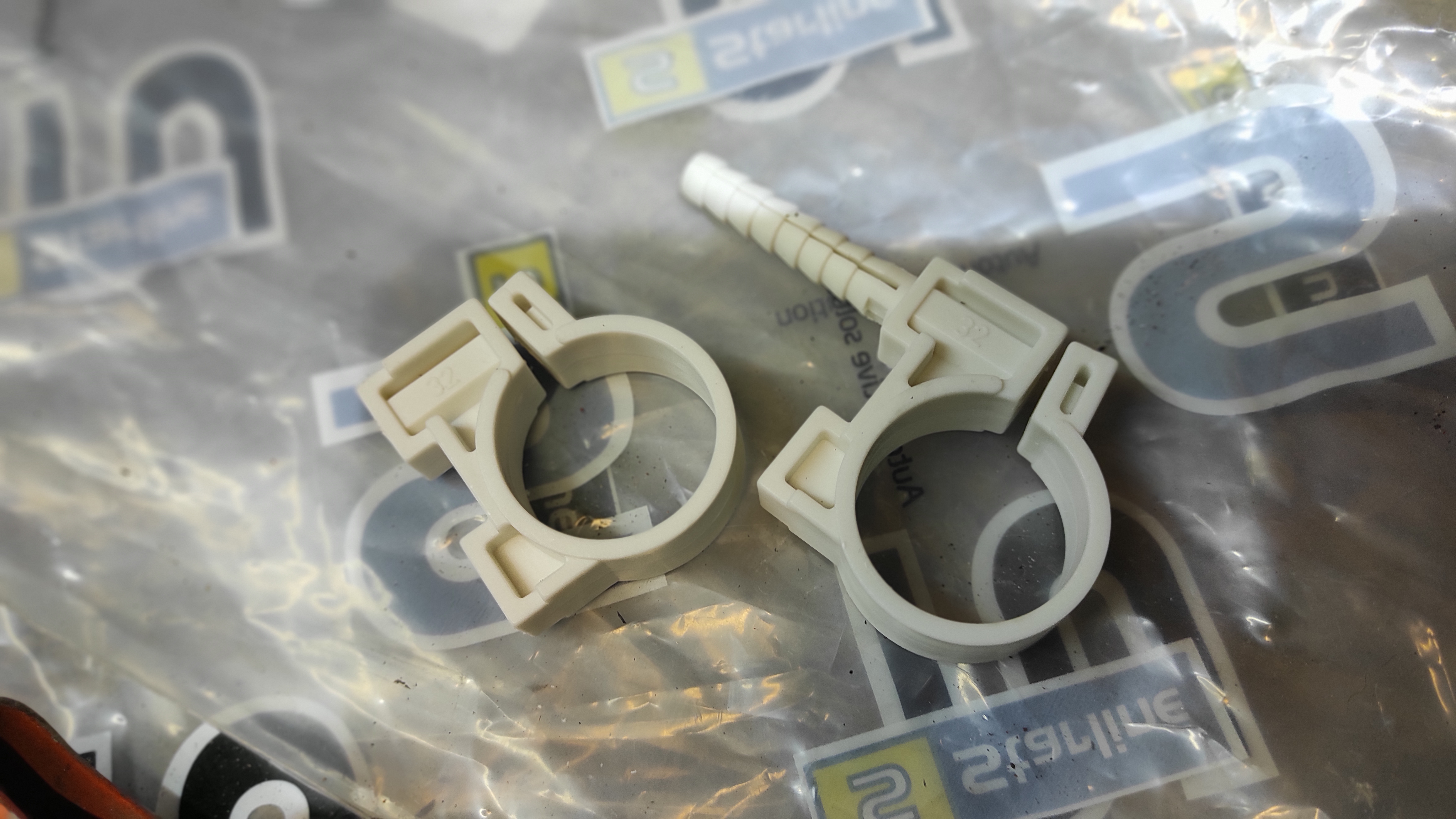 Rura kanalizacyjna fi32, kolanko 90stopni, półmetrowy odcinek własnoręcznie wygięty aby wpasować się do istniejącej rury trumy pod łóżkiem, redukcja 32/50 i uchwyty 5 sztuk.