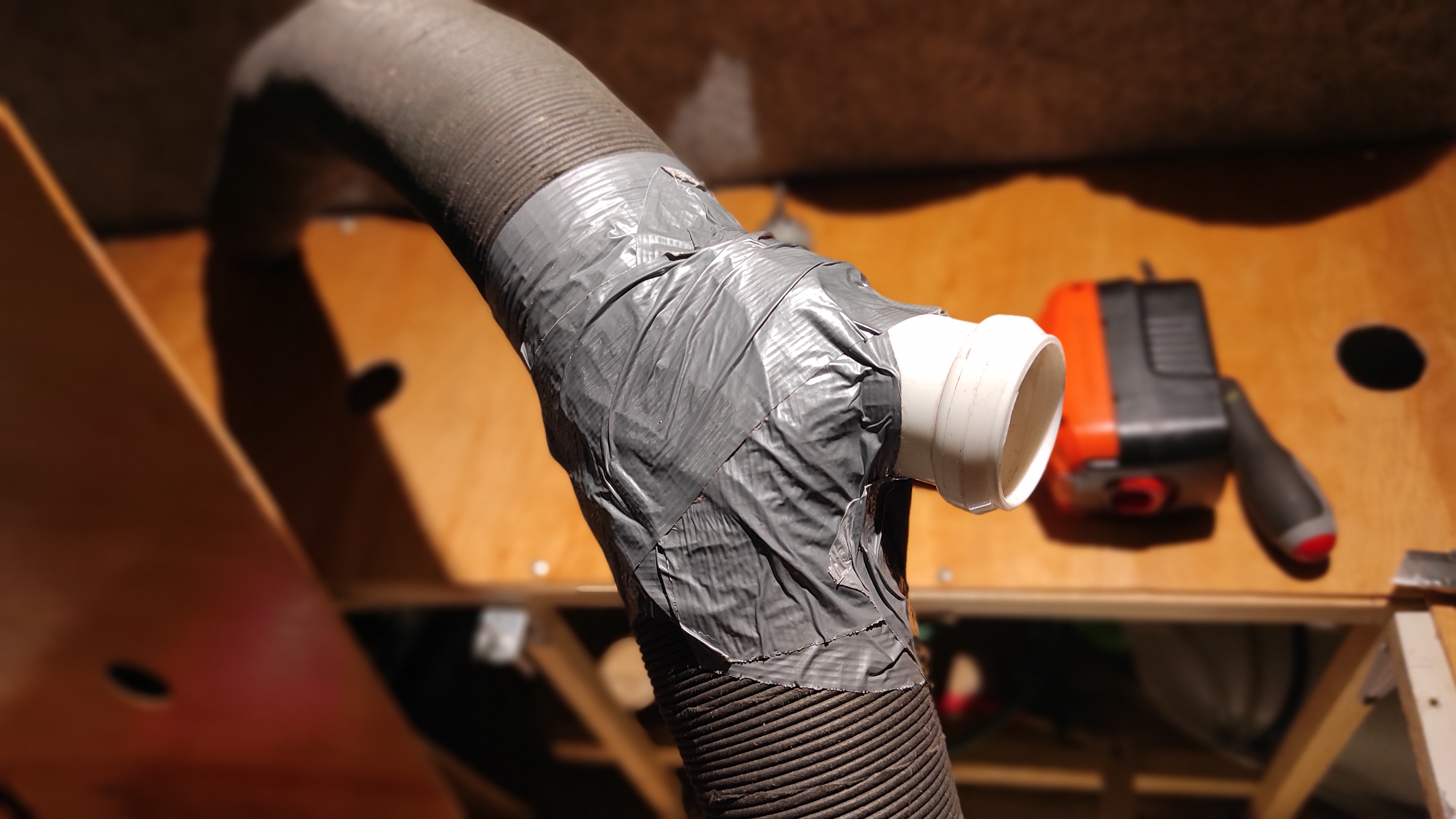 Najpierw wycięcie otworu w głównej rurze pod łóżkiem i wpasowanie tam redukcji. Redukcja umieszczona pod kątem więc trzeba ją z jednej strony ściąć aby nie tamować dalszego przepływu powietrza w bakisty. Dla sztywności dałem dwa wkręty i owinąłem taśmą by uszczelnić połączenie. Średnio to wygląda ale jest to w takim miejscu że nawet zaglądając pod łóżko tego nie widać