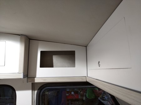 Zmajstrowałem też mini pawlacze z otwartym frontem pomiędzy tylną półką a szafą i kuchnią. Po obu stronach na drobne tegesy i przydasie.