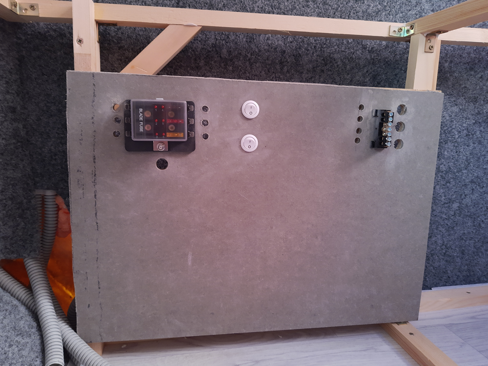 Do płytki przymocowałem skrzynkę z bezpiecznikami, w której osobno podłączane są poszczególne światła, gniazda 12v oraz pompa wody. Z drugiej strony zastosowałem mostek dla wyraźnego połączenia styków minusowych. Przygotowałam włączniki do oświetlenia schowka i jeszcze jeden dla pewności :)