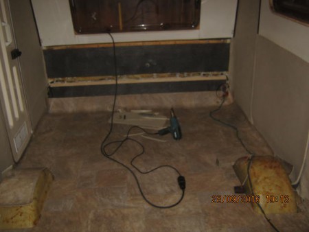 Prac remontowych ciąg dalszy.Po małej przerwie trochę popycham robotę dalej,założyłem górne szafki,zmyłem podłogę acetonem ze starego kleju, położyłem wykładzinę i ją przykleiłem , zamontowałem szafę,schowki przednie itd. powoli do przodu...