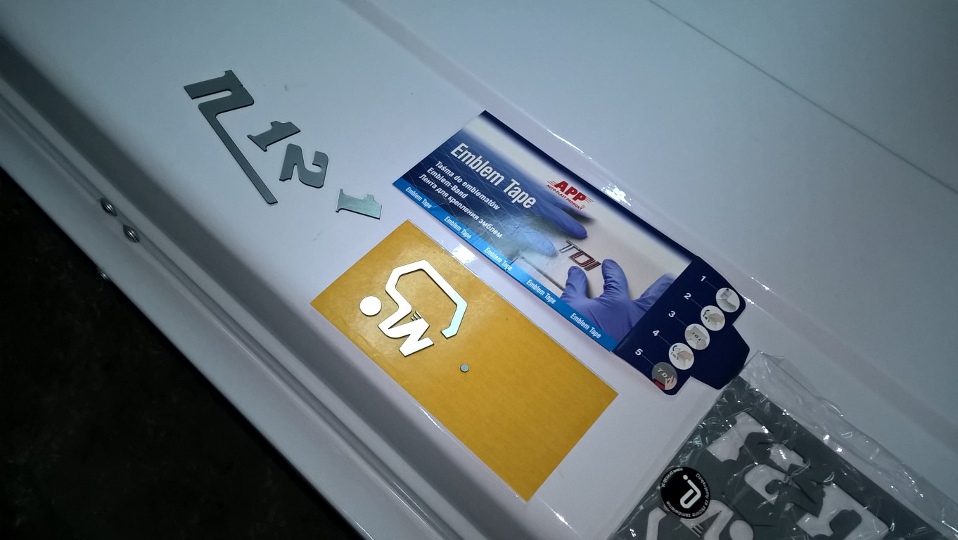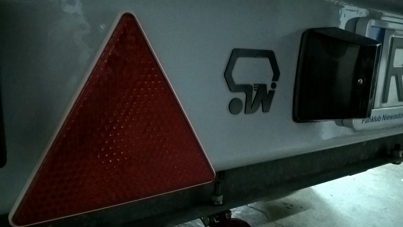 Na koniec istna truskawka na torcie (jak mawiał ostatnio klasyk) czyli emblematy. Wycięte wcześniej (dużo wcześniej :) ) laserowo loga za pomocą specjalnej taśmy samoprzylepnej zostały zamocowane z tyłu przyczepy.