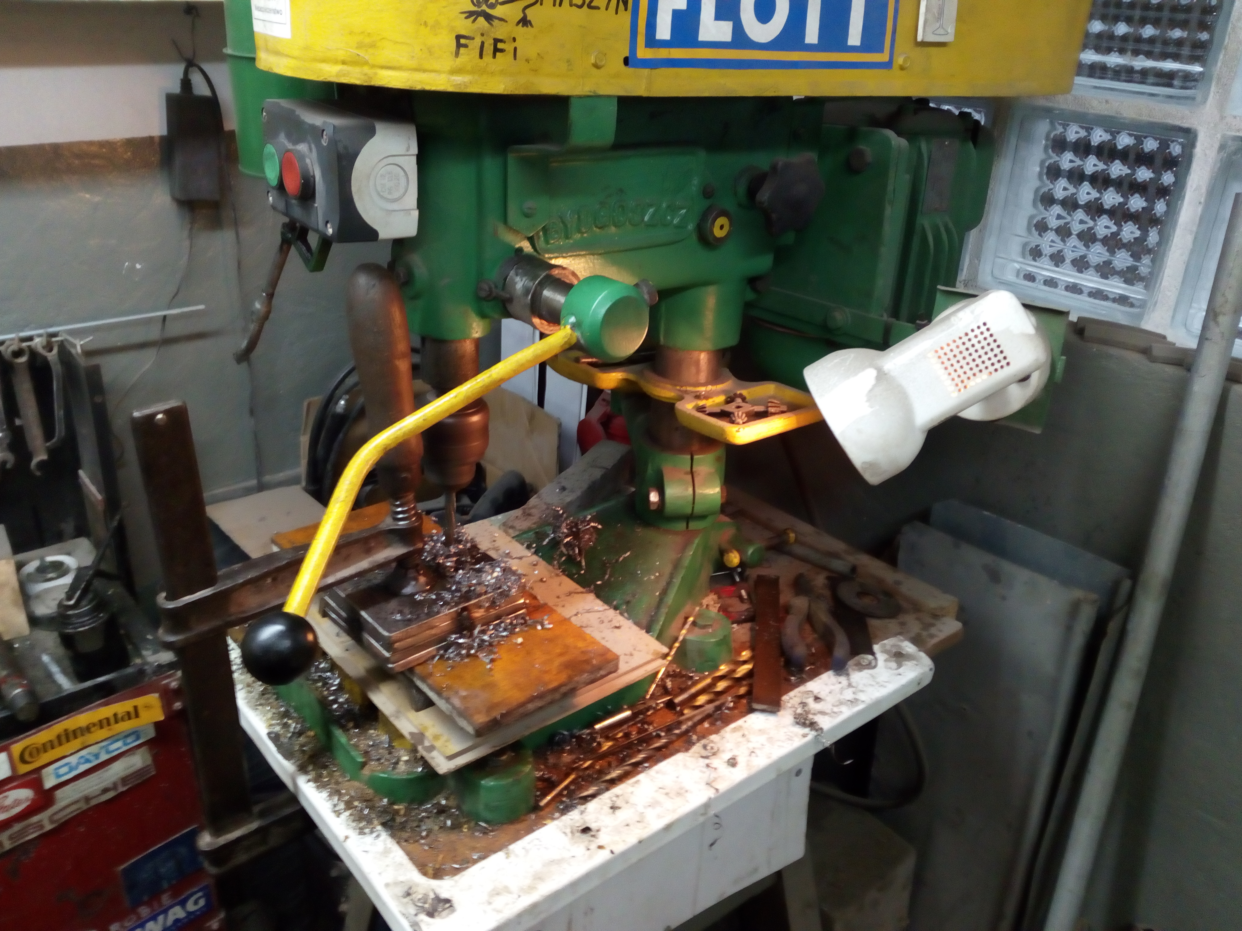 Tę wiertarkę wyciągnąłem ze złomu, praktycznie wszystko stało dęba. To jest jakiś bardzo stary Flott niemiecki po jakiś dziwnych przeróbkach + moich przeróbkach ale faktycznie daje radę. Jedyne co denerwuje to brak imadła krzyżowego i stary uchwyt wiertarski, który nie wiem za Chiny jak ściągnąć.