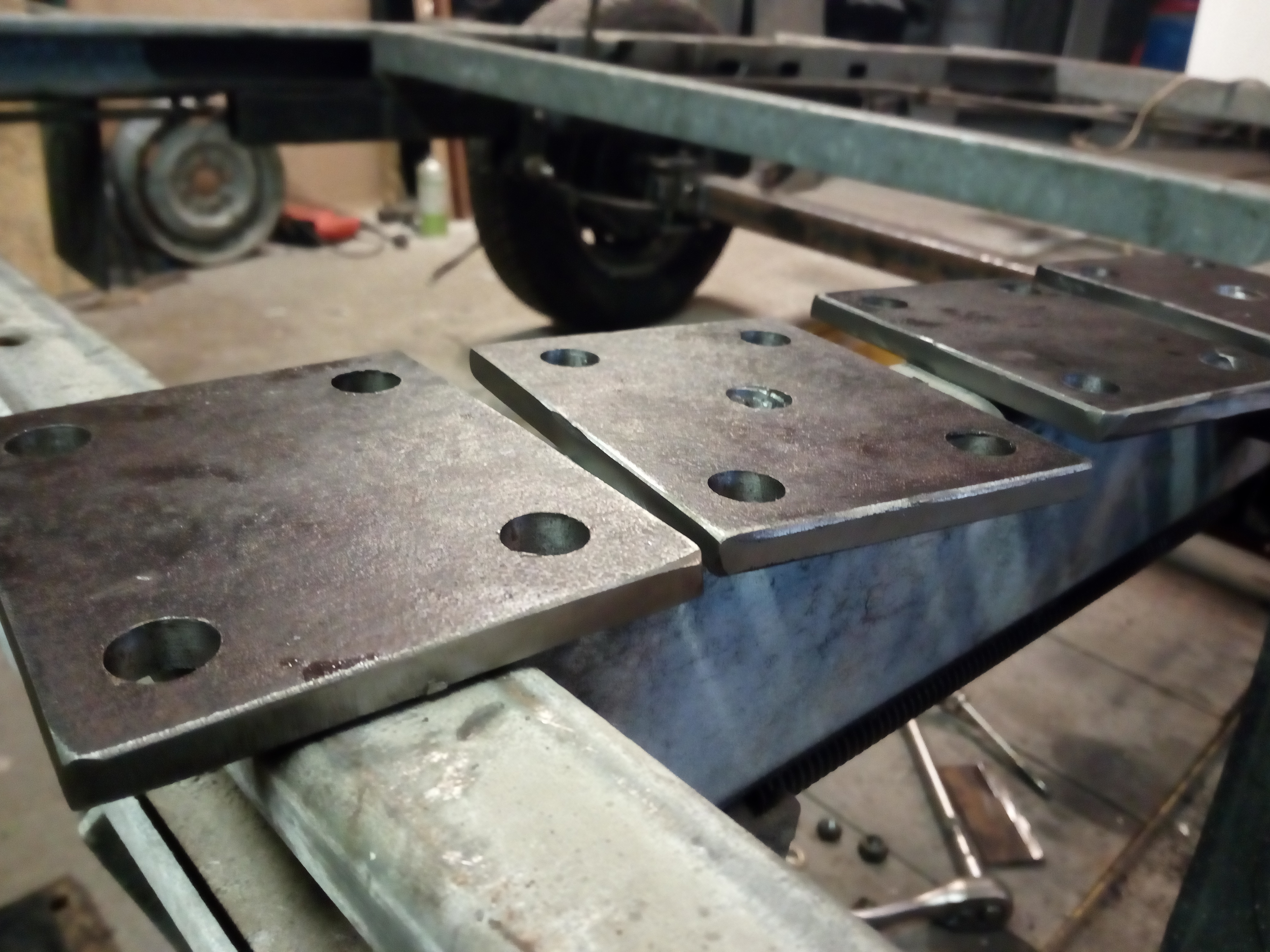 ...ale jeszcze dzisiaj wydziergałem nowe blachy mocujące resor z osią. I tak tniemy, znowu czym innym tniemy, wiercimy, większym wiercimy, i tak mamy oto gotowy produkt. A teraz Al-Ko....