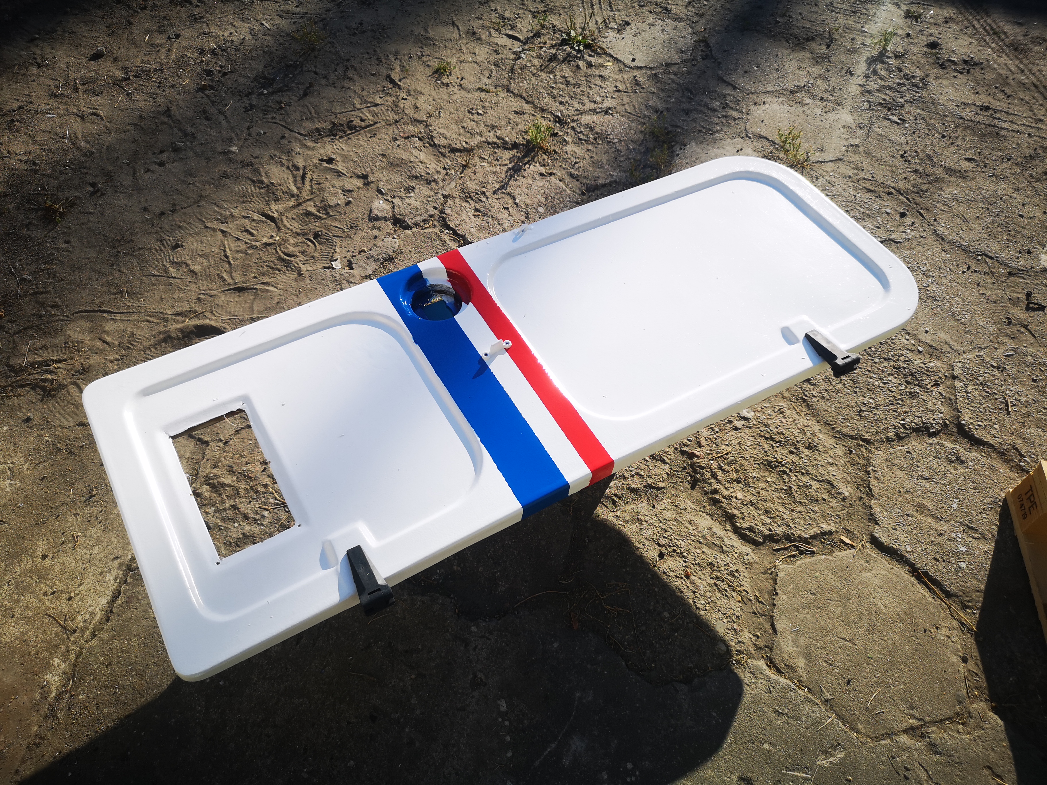 Żeby nie było, że się całkiem obijałem, na nowo docięte pokrywy łóżka w środku (wcześniej pokrywy nie otwierały się do końca) i docięty nowy blat na skrzynki (poprzedni byłą za wąski i nie zakrywał skrzynek za regałem, osadzony w nim kontakt. Skrzynki, regały i ekrany okien dostały po garści wkrętów aby wszystko się trzymało jak należy.