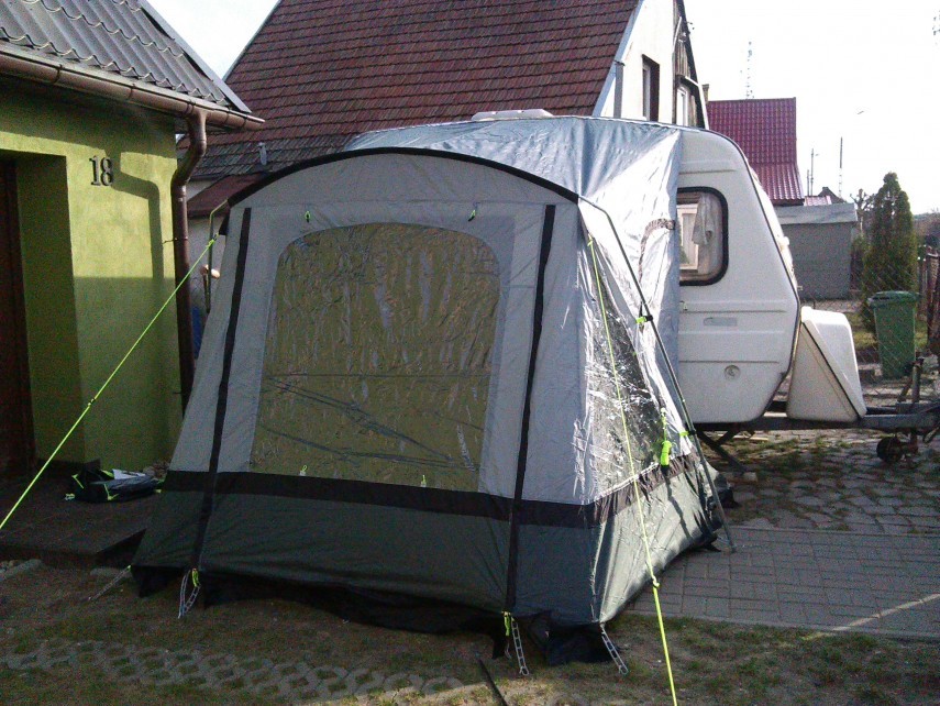 Obiecałem rozstawić przedsionek i dzisiaj to na szybko zrobiłem. Niestety buda stoi w takim miejscu, że nie mogłem ponaciągać go wszędzie gdzie trzeba, bo ciężko się wbija szpilki w polbruk a poza tym był to mój debiut. Następnym razem na pewno będzie lepiej. Wrażenia moją są jak najbardziej na plus. Spokojnie zmieści się tam stolik i krzesełka dla 4 osobowej rodziny. Chcę dodatkowo zrobić sobie słupki żeby można było z przedniego wejścia zrobić dodatkowy daszek. Myślę, że za to cenę nic więcej bym nie osiągnął.