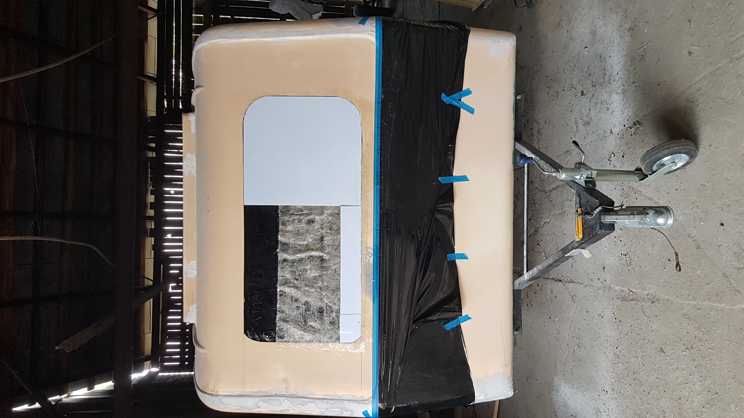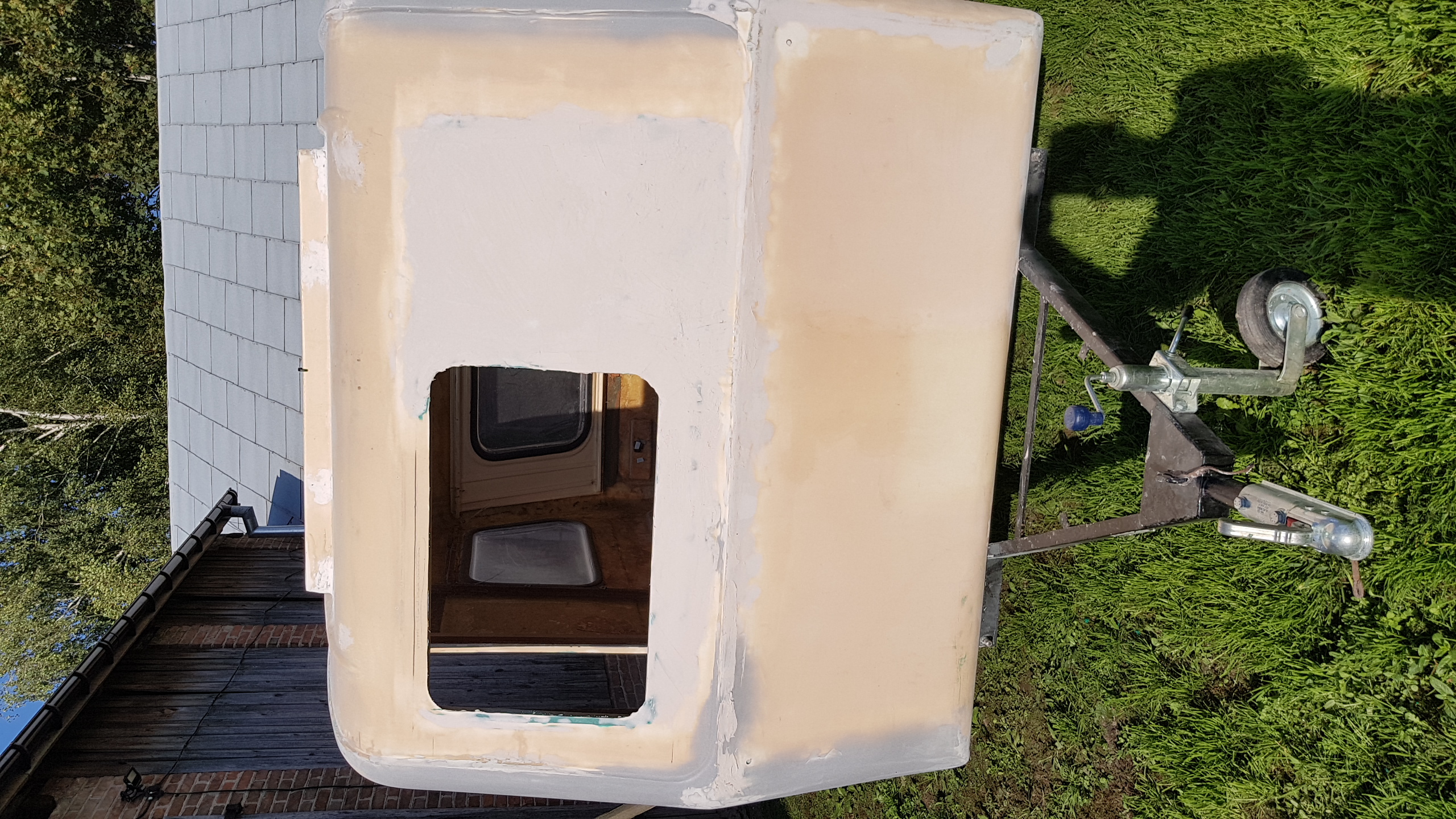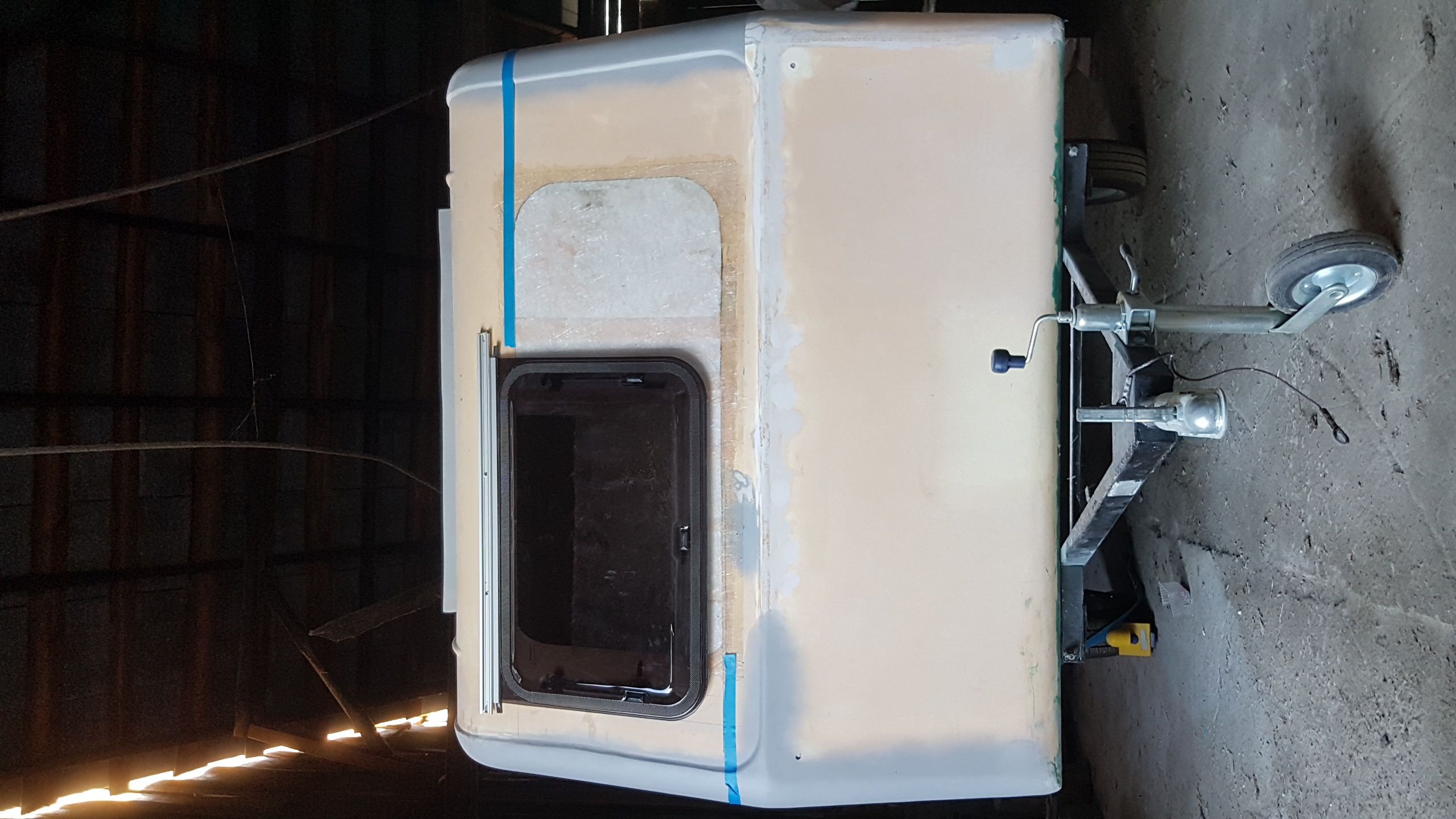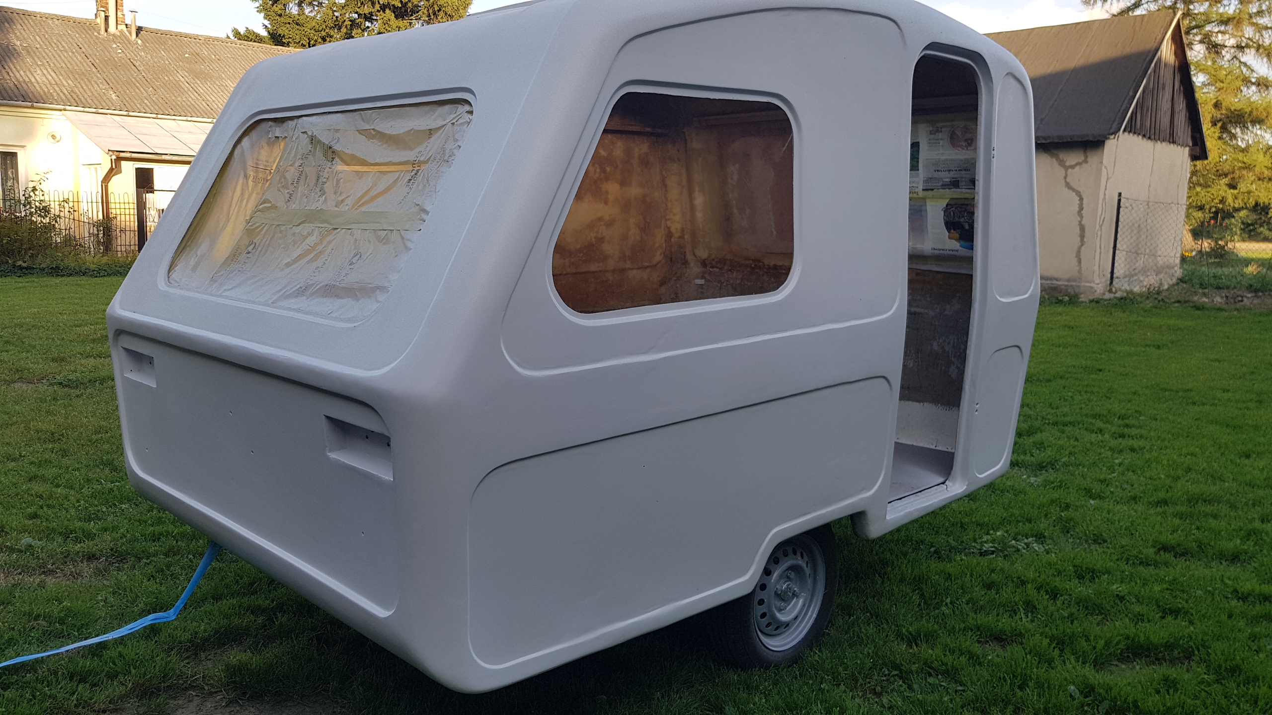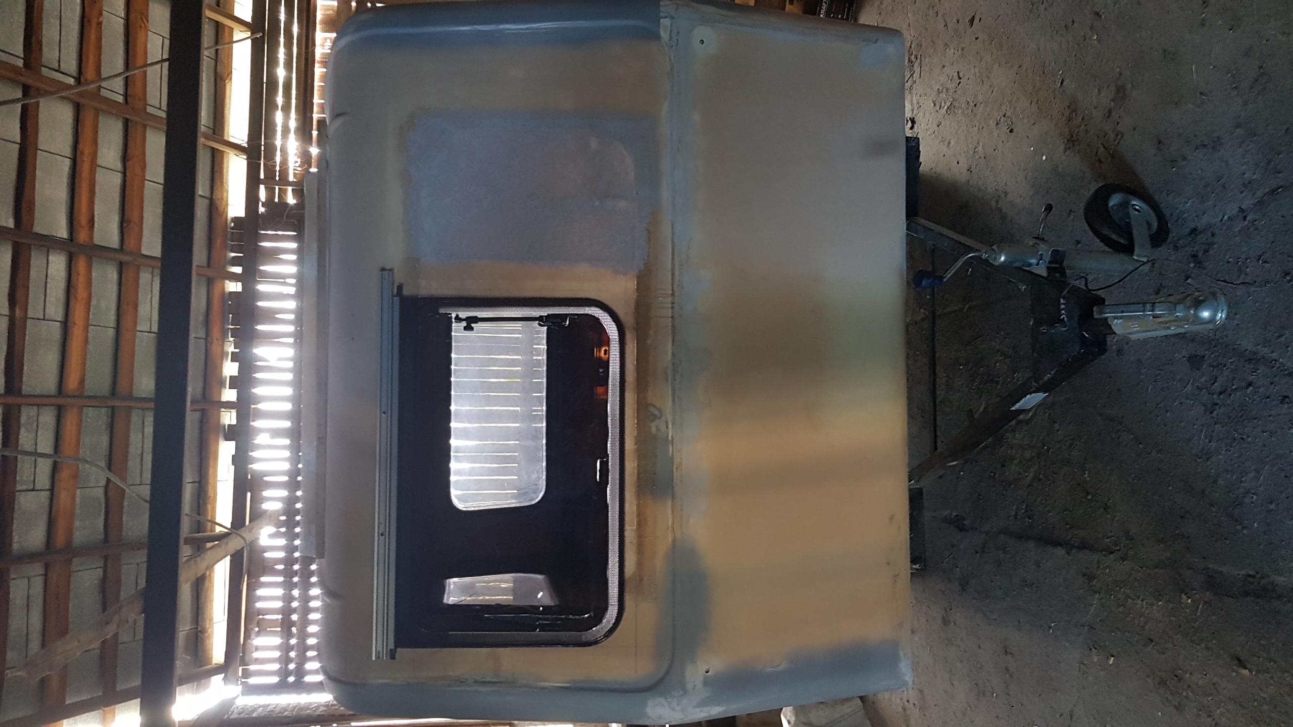 Witam. Od ostatniego wpisu minęło prawie 3 m-ce więc czas na małą aktualizacje. Prace chodź pomału posuwają się do przodu to widać tego efekty (w końcu!). Remont normalny w ogólnie przyjętych "standardach" Niewiadówkowych bez żadnych udziwnień, bo wciąż jest roboty w HUK. Okno przednie zostało przerobione po raz 2 i uważam że całkiem nie źle mi wyszło i teraz mi się nawet podoba. Drzwi po raz enty poprawiałem, bo nie udało mi się ich dostać i w końcu je skleiłem i jak na taki złom to wyszło chyba całkiem całkiem. Przyczepa została pomalowana podkładem epoksydowym i 2 razy Sigmadurem 550. Podkład i emalię malowałem pistoletem i co prawda wyszła taka delikatna strukturka ale to moje pierwsze malowanie pistoletem. Dach z nowymi uszczelkami oraz drzwi oklejone alufoxem na klej Moto. Na razie siedzi. Drzwi na nowych zawiasach i z nową kratką wentylacyjną wydrukowaną w 3D z ABS-u. Zamek drzwi już kupiłem ale przerobię go dopiero na wiosnę. Wymieniłem też kantówki wewnątrz na nowe te pod półki i przy futrynie ale jeszcze z drugiej strony zostały do wymiany. Rama okna tylnego nie otwieranego była w dobrym stanie więc ją wyczyściłem i odmalowałem. Obsadziłem nowe grafitowe szyby na nowych uszczelkach jednak nie obyło się bez uszczerbku. Nowa tylna szyba mimo mierzenia i docinania pękła