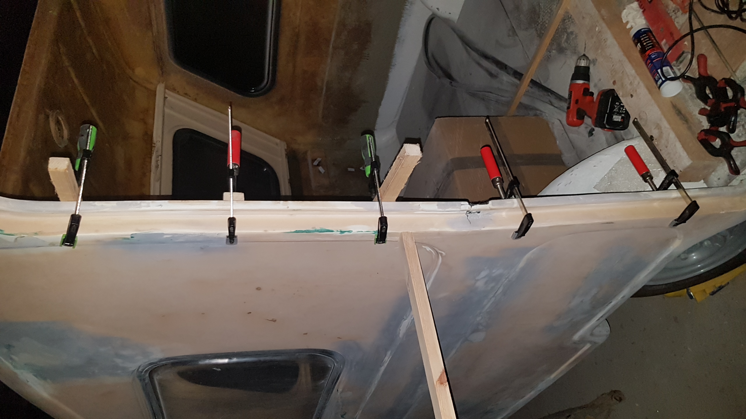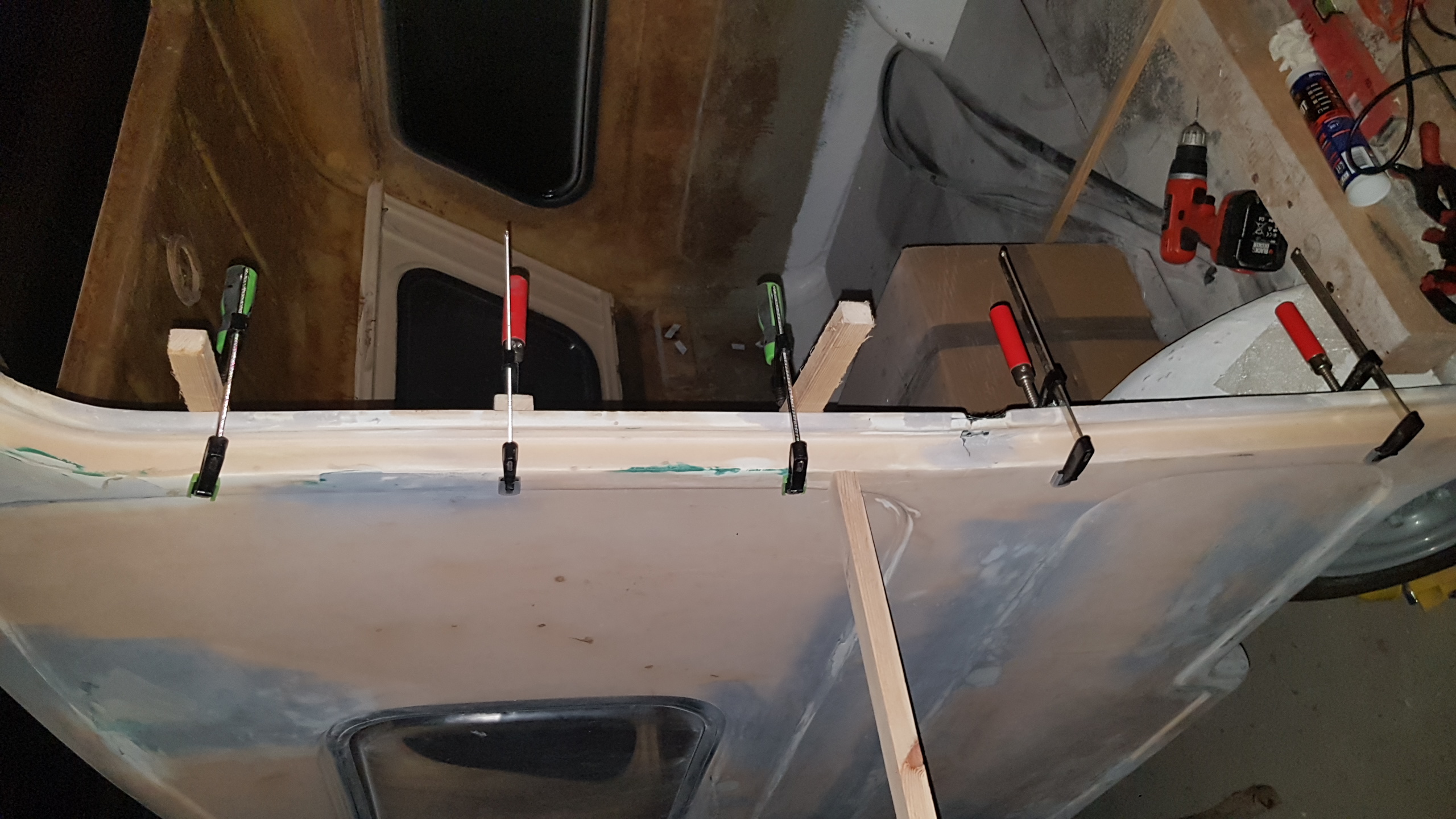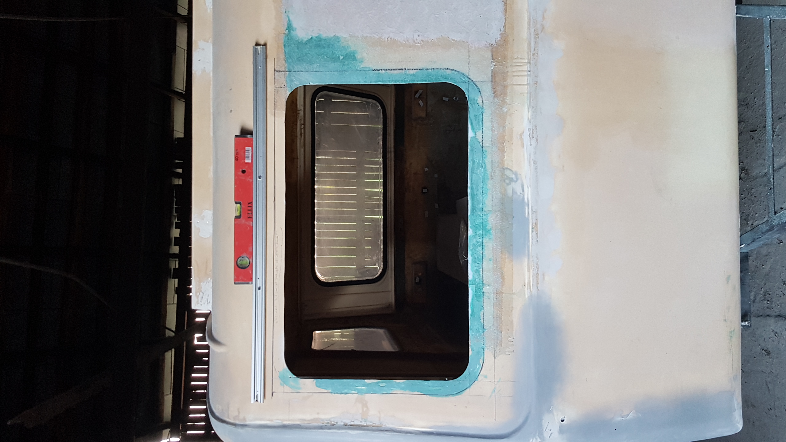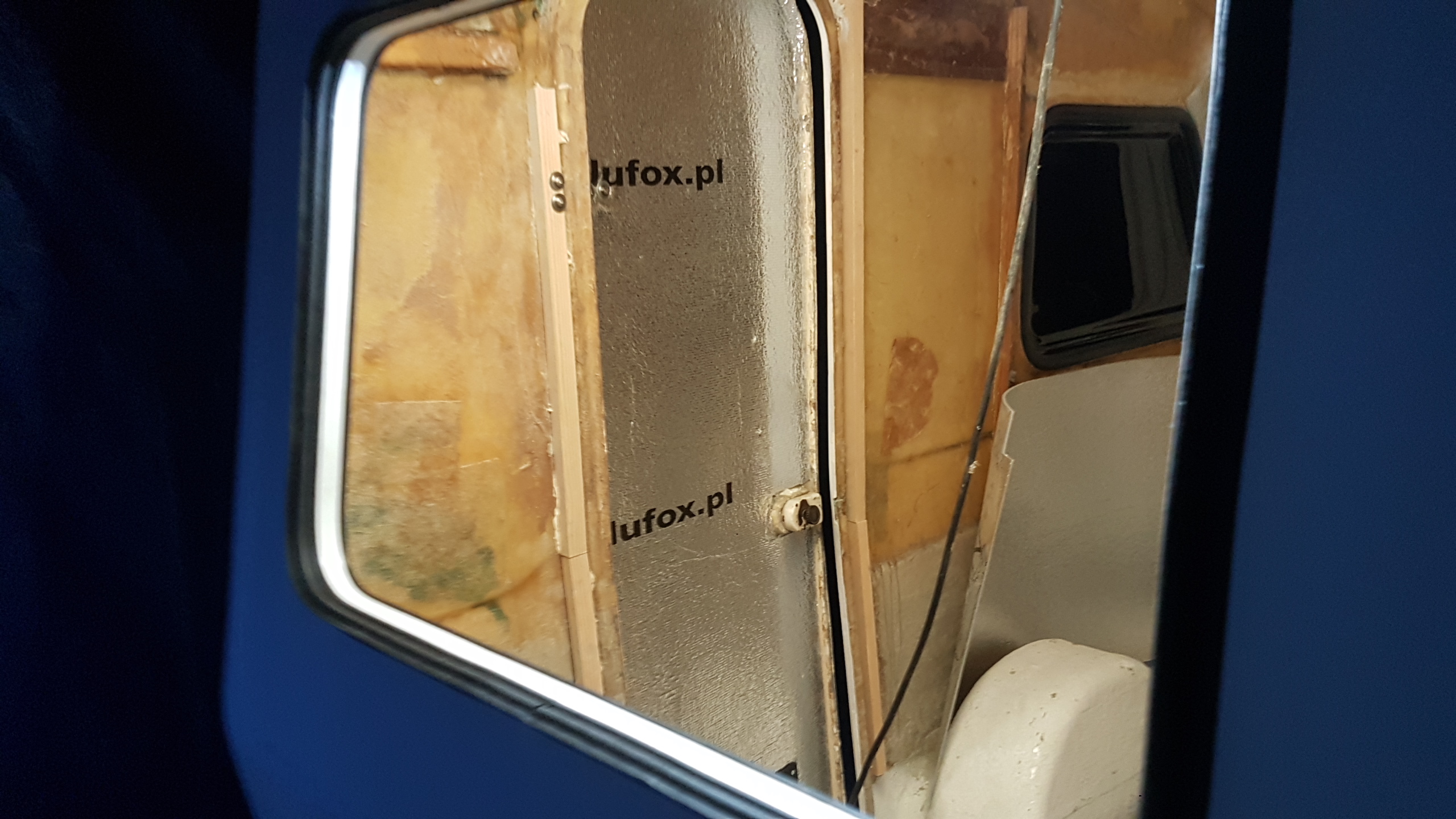teraz czeka mnie klejenie. Także wszystkim nowym adeptom sztuki remontowej TEJ "POMYŁKI POLSKIEGO KARAWANINGU" polecam 2 razy mierzyć i sprawdzać w otworze okiennym czy dana szyba pasuje i ma 5 -7 mm luzu i dokładnie docinać! Wleciało też już trochę "biżuterii" tak zwanej, czyli lampy tylne, podświetlenie tablicy, trójkąty, rejestracja. Nowy przerobiony otwór okienny dostał nową ramkę, uszczelkę oraz ten przeklęty biały klin. Ten co to wymyślił to się zemścił na ludziach, tylko za co ? Pytam