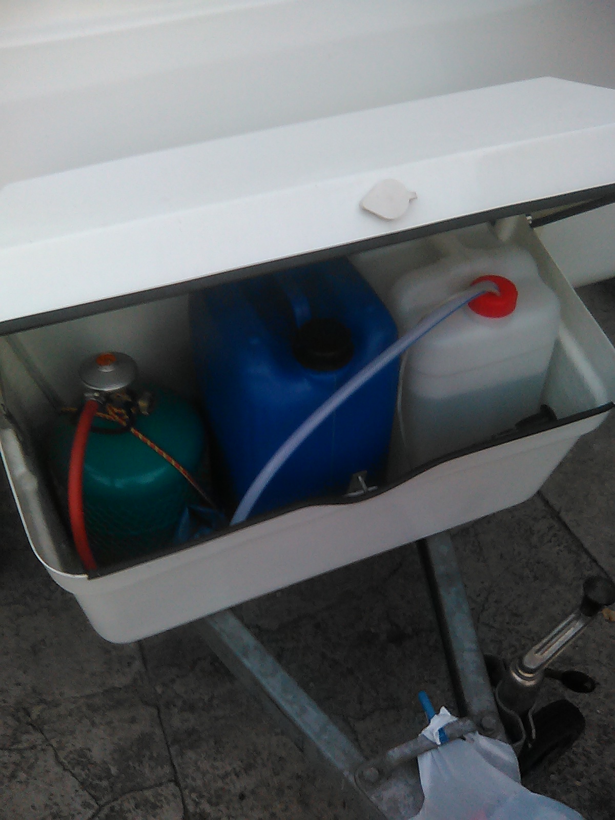 Po kilku wyjazdach razem z żoną stwierdziliśmy,ze fabryczne umiejscowienie zbiornika z wodą jest mało praktyczne zwłaszcza przy napełnianiu.Wobec tego nowy większy zbiornik trafił do schowka . Oczywiście instalacja wymagała też małej przeróbki.