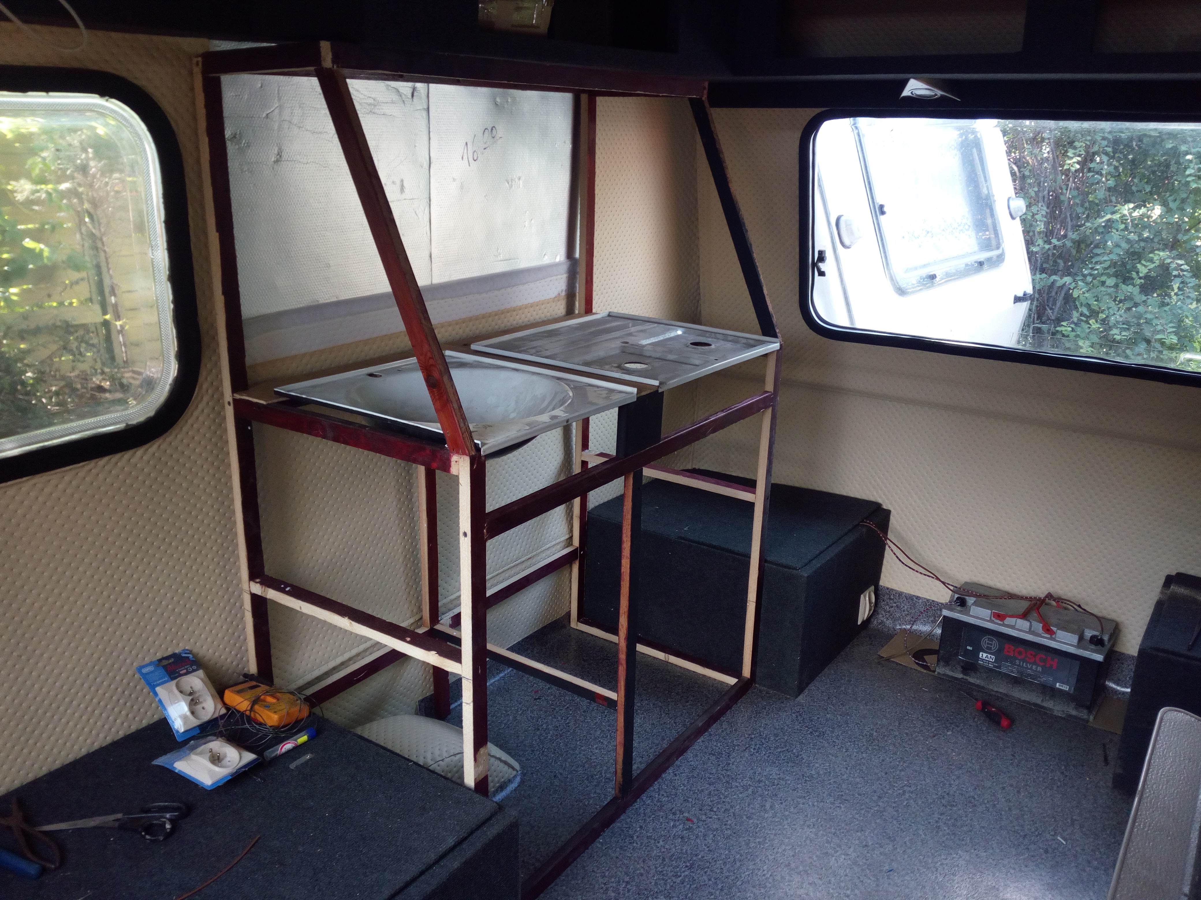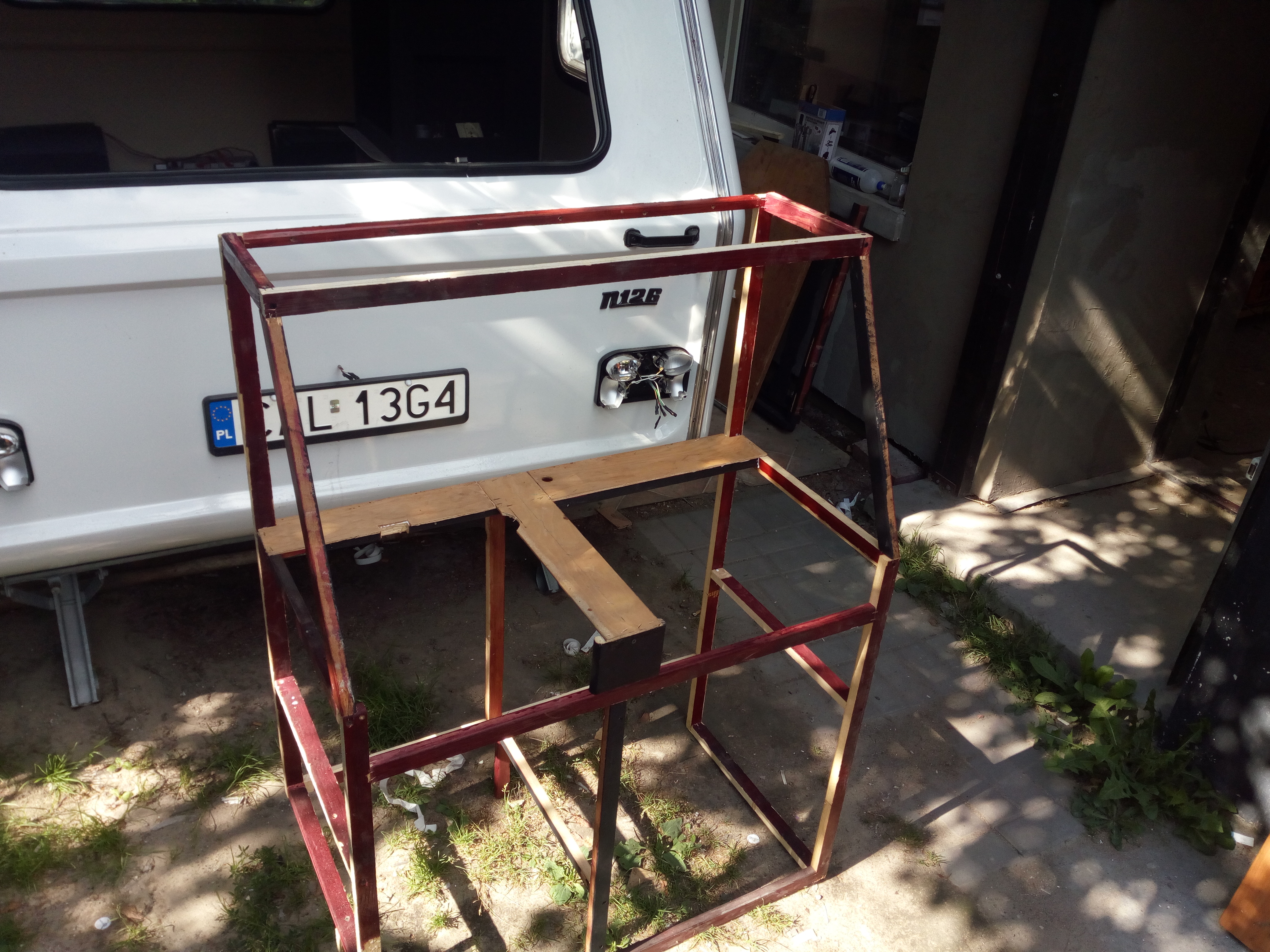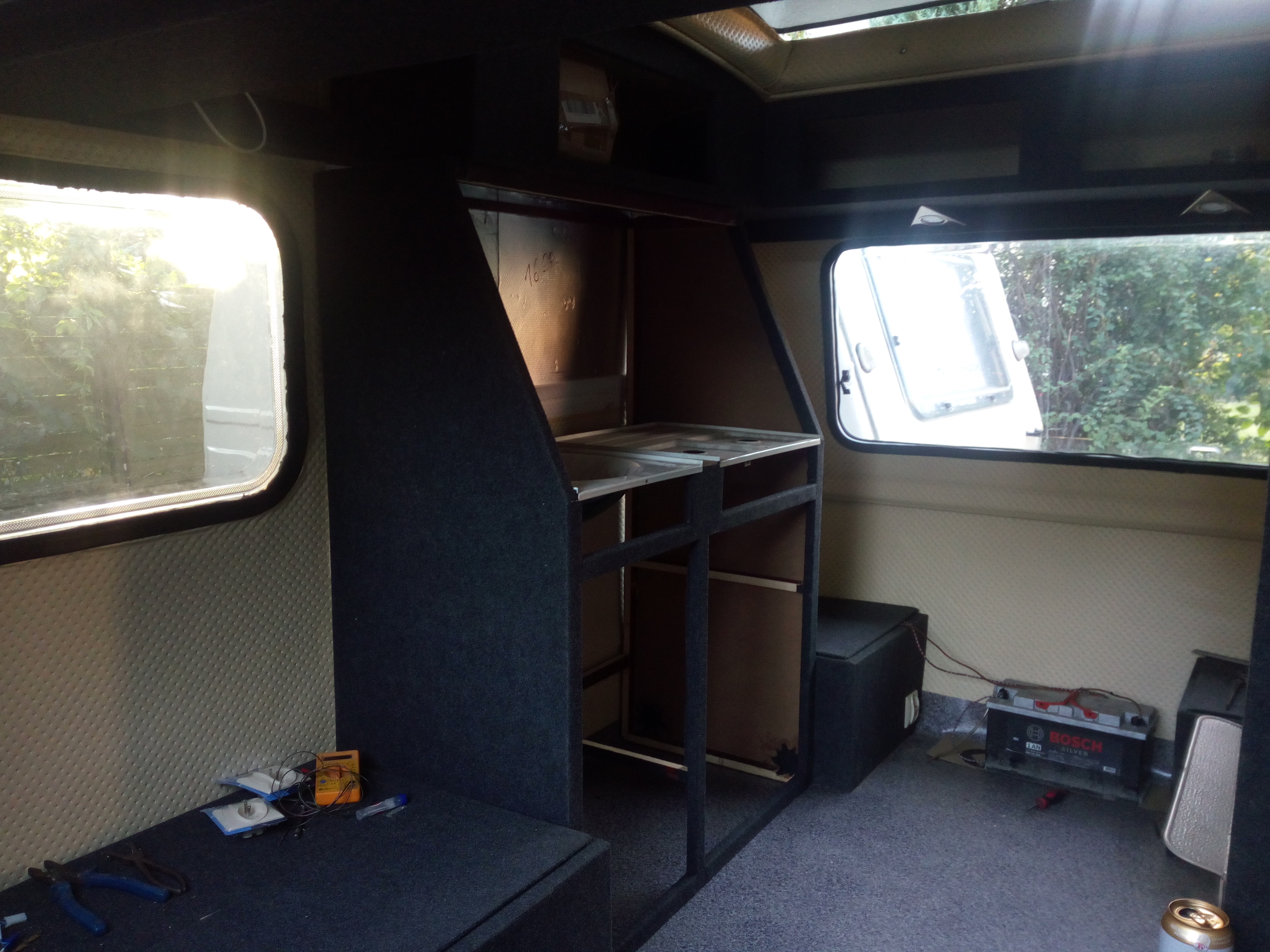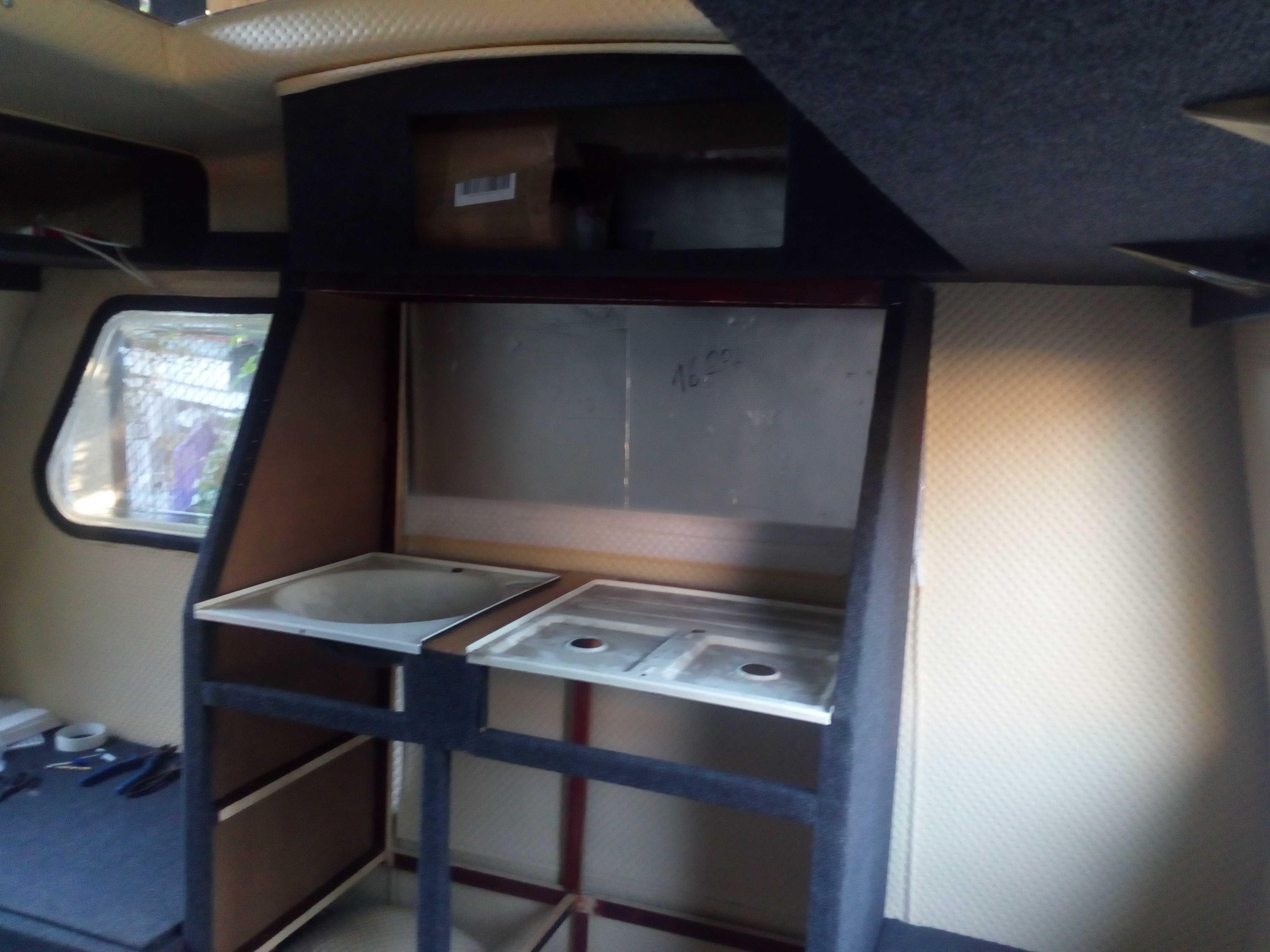 Powoli powstaje część kuchenna, największy mebel jaki można wstawić do zapiekanki przez okno na styk. No i jako że jestem trochę audio maniak to z tyłu 2x Bose z przodu 2x JBL i radio Clarion. Ładnie, czysto gra; jestem zadowolony. Miało być z USB ale jakość dźwięku z tamtego, a z tego radyjka to niebo a ziemia.