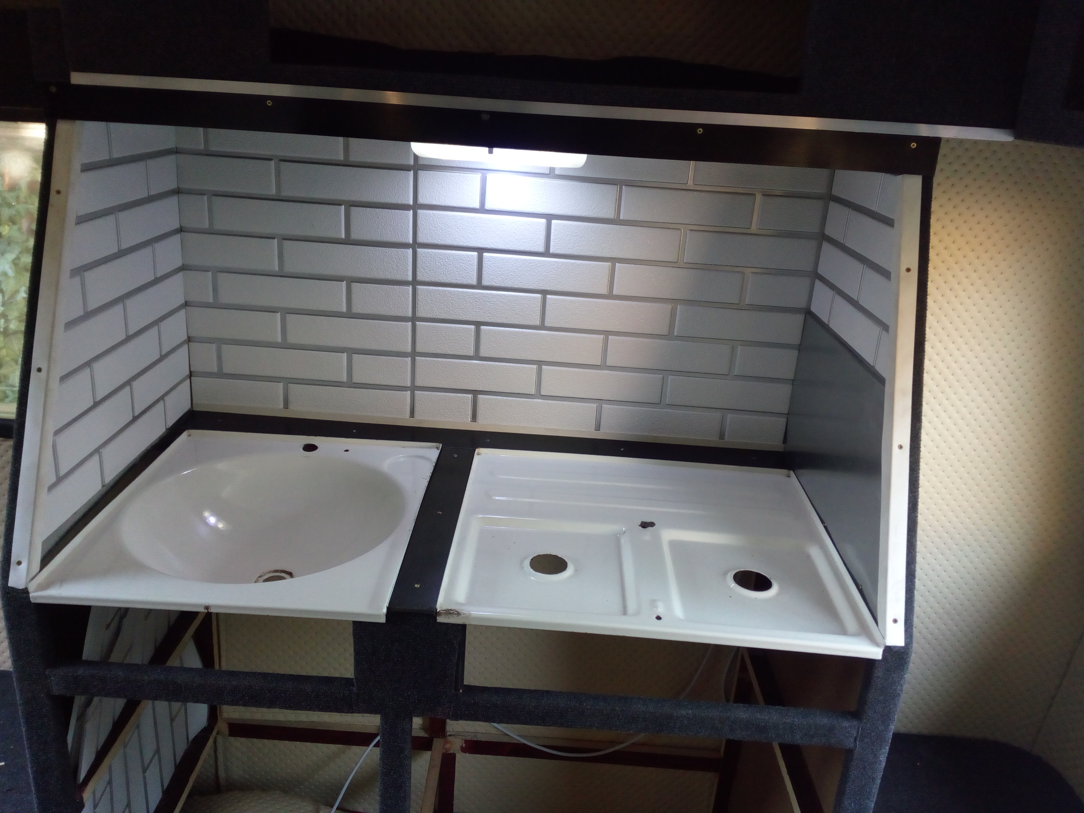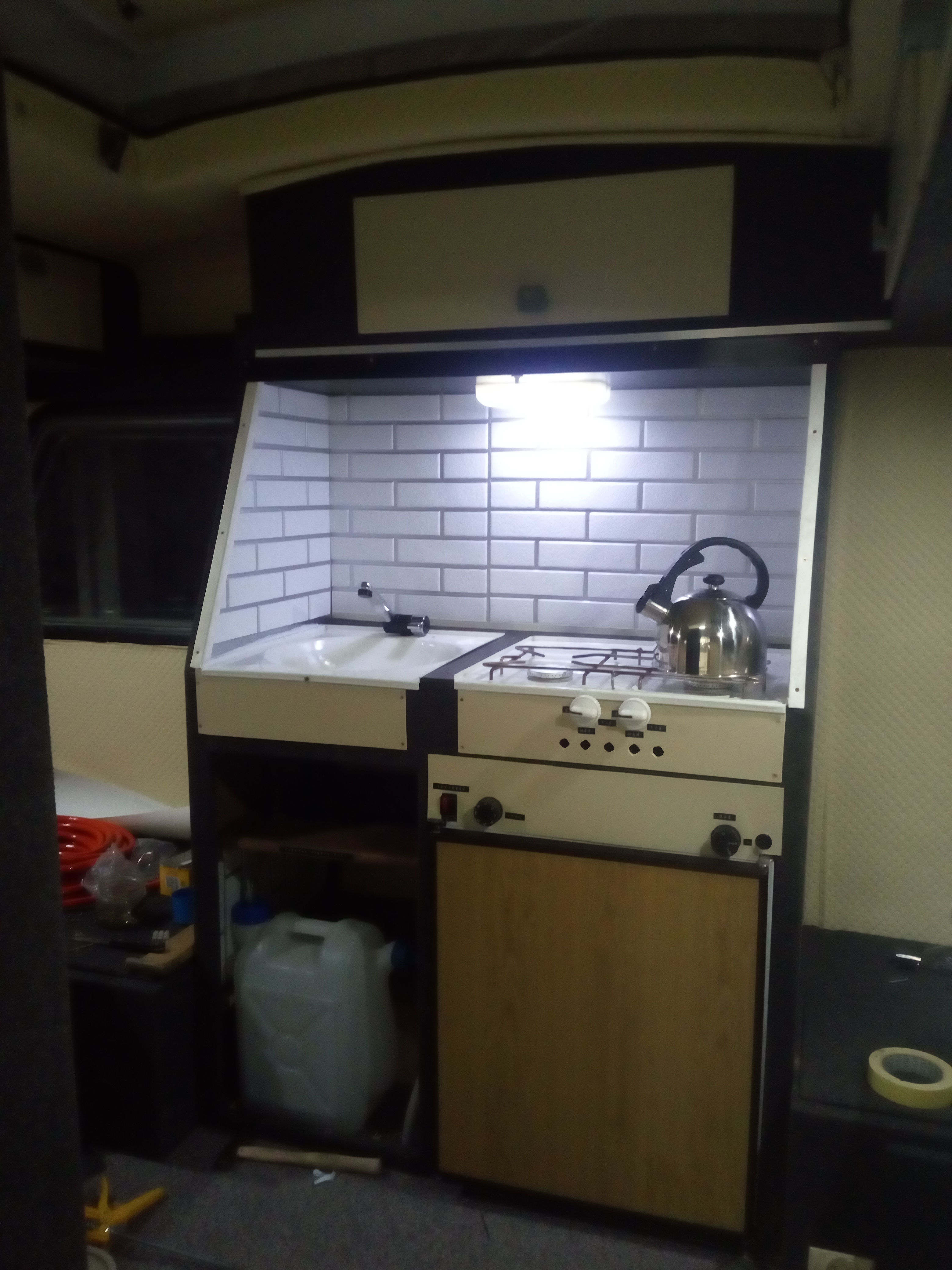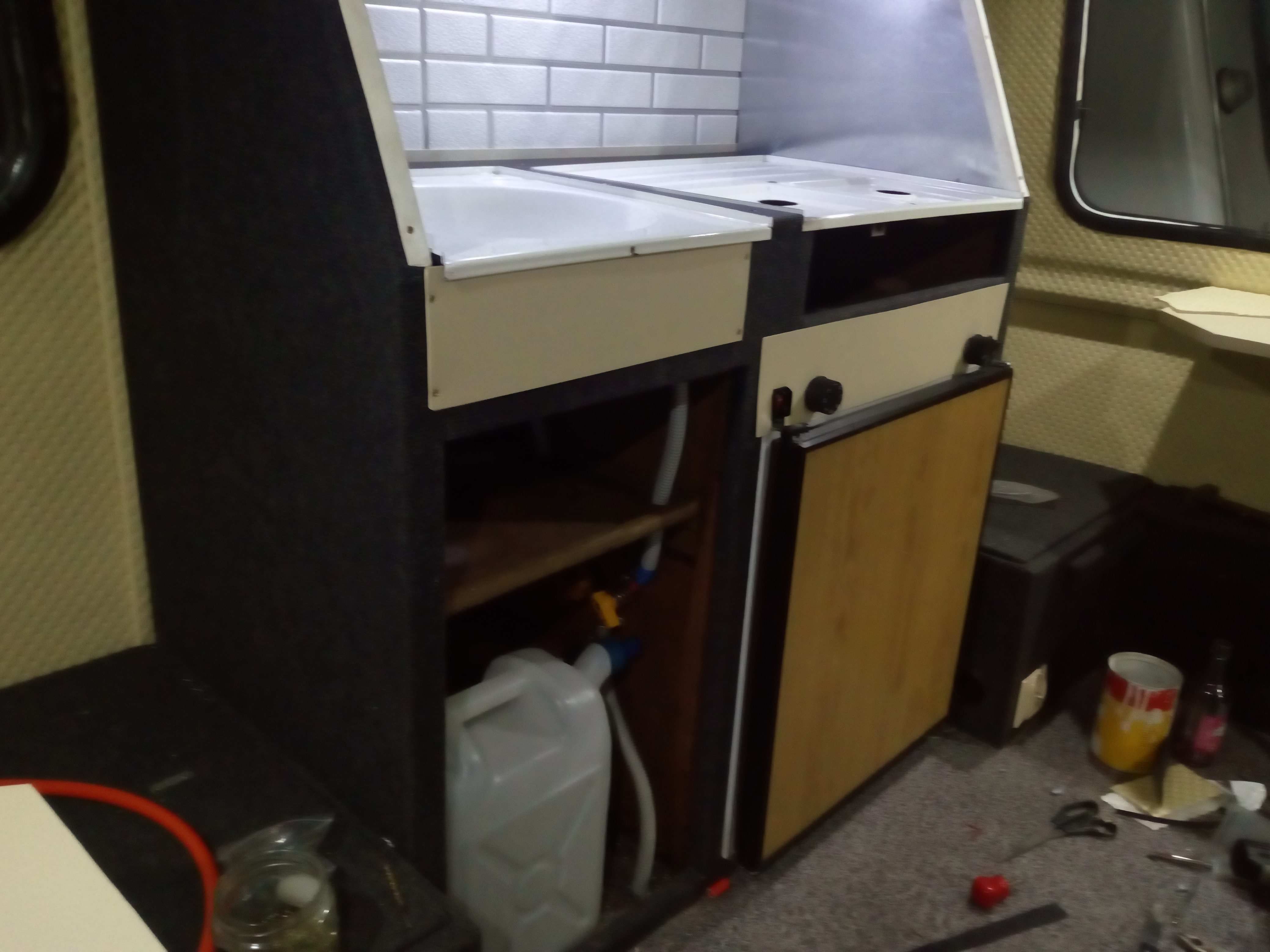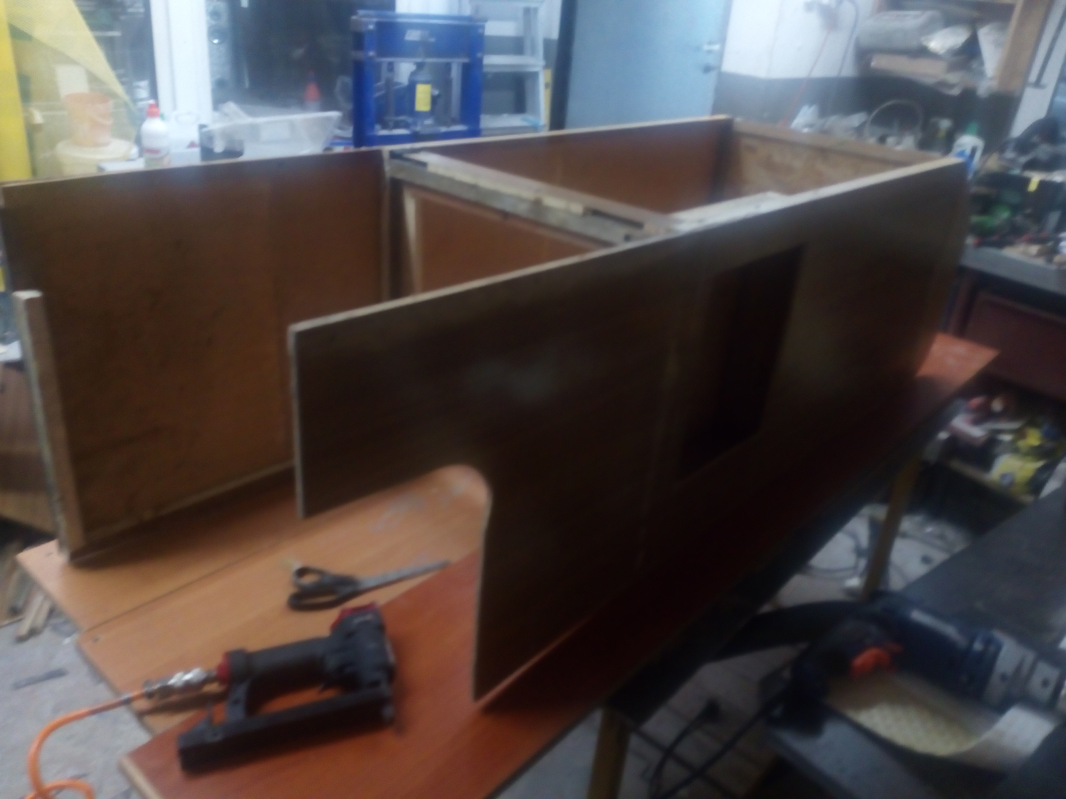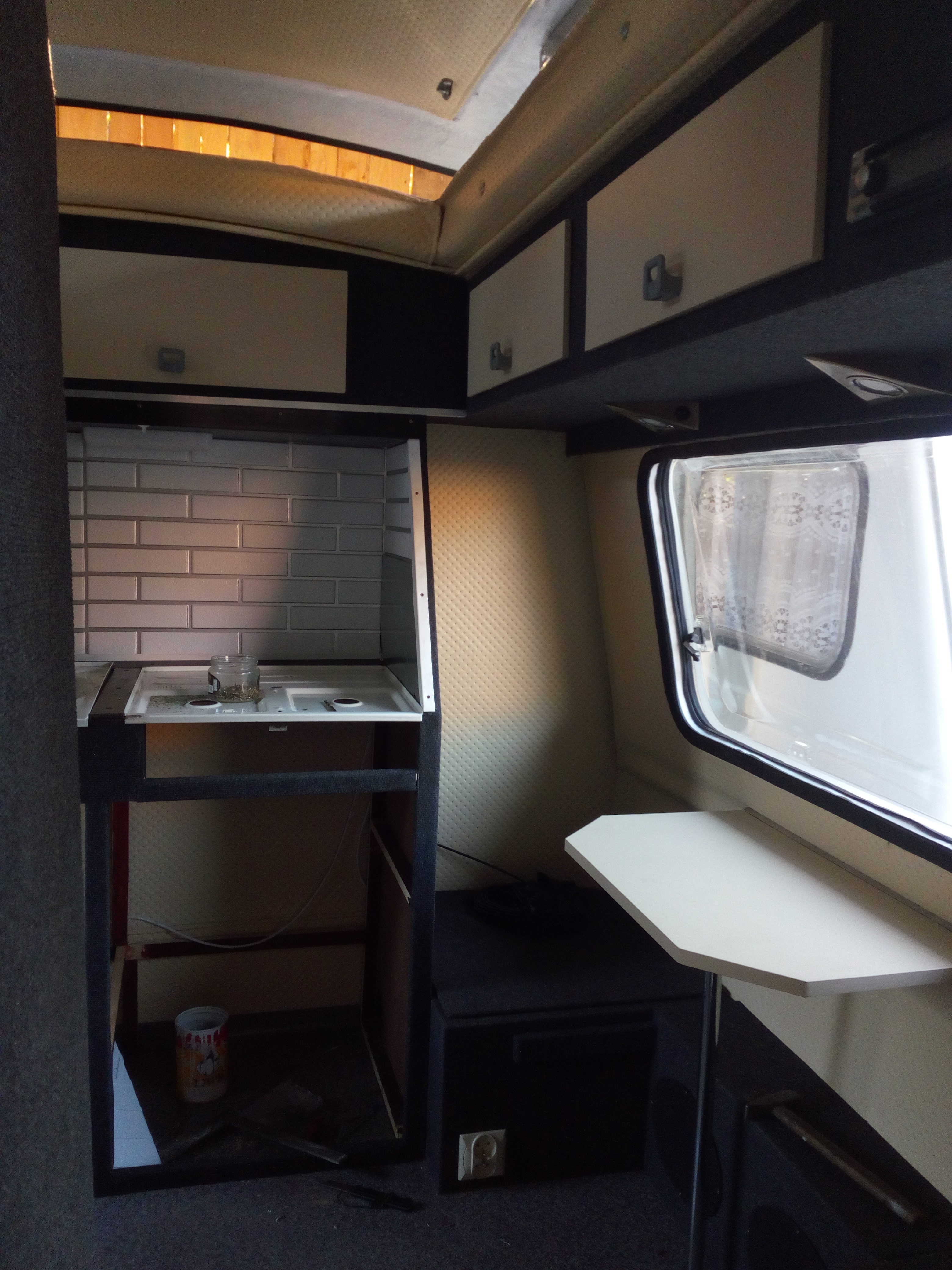 Powoli powstaje część kuchenna, największy mebel jaki można wstawić do zapiekanki przez okno na styk. No i jako że jestem trochę audio maniak to z tyłu 2x Bose z przodu 2x JBL i radio Clarion. Ładnie, czysto gra; jestem zadowolony. Miało być z USB ale jakość dźwięku z tamtego, a z tego radyjka to niebo a ziemia.