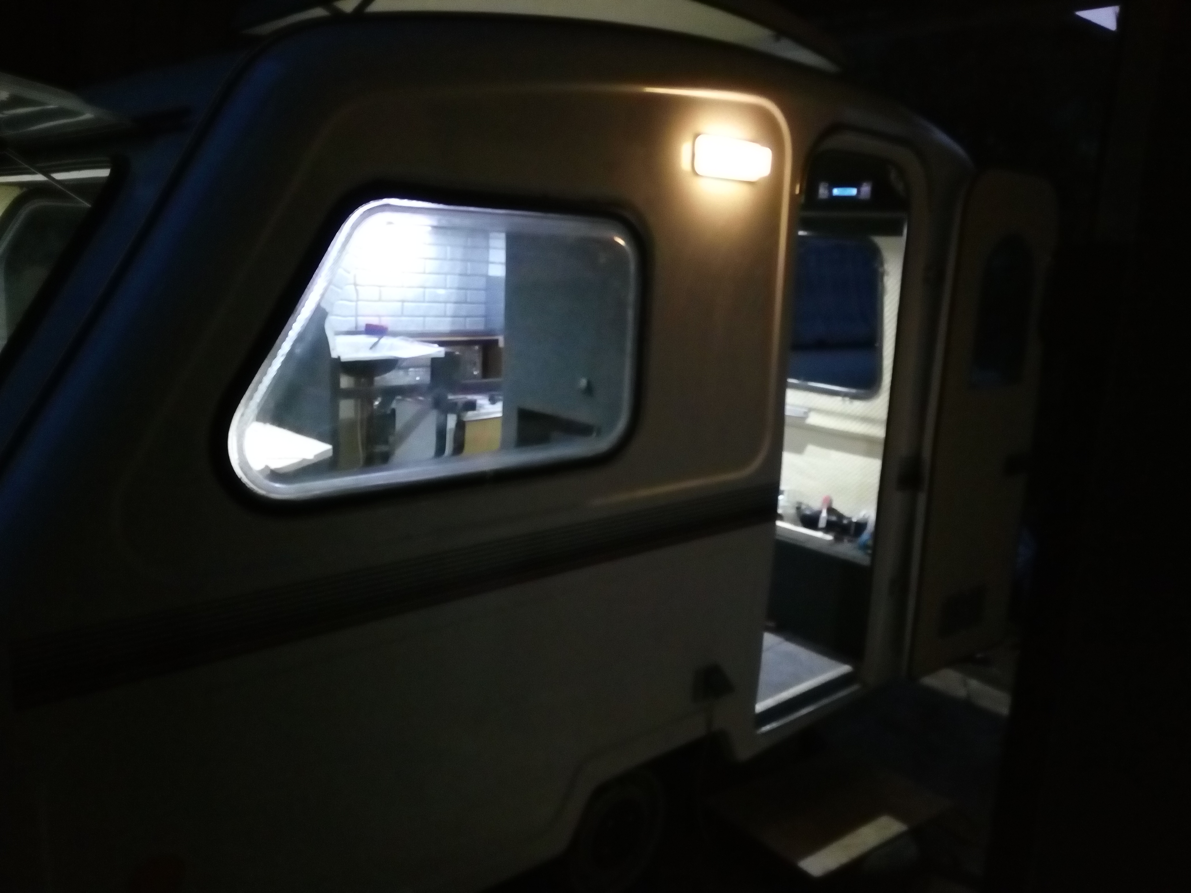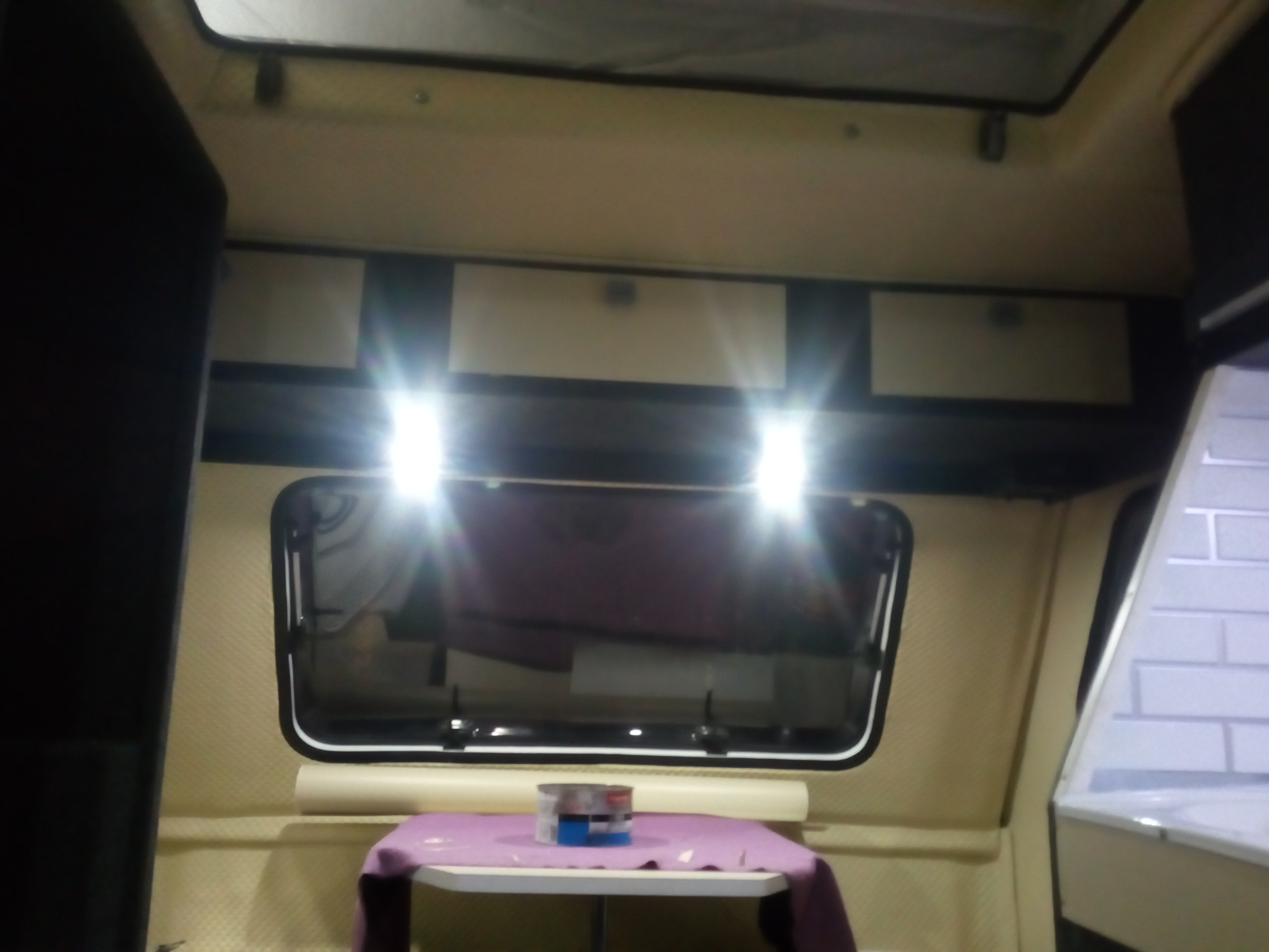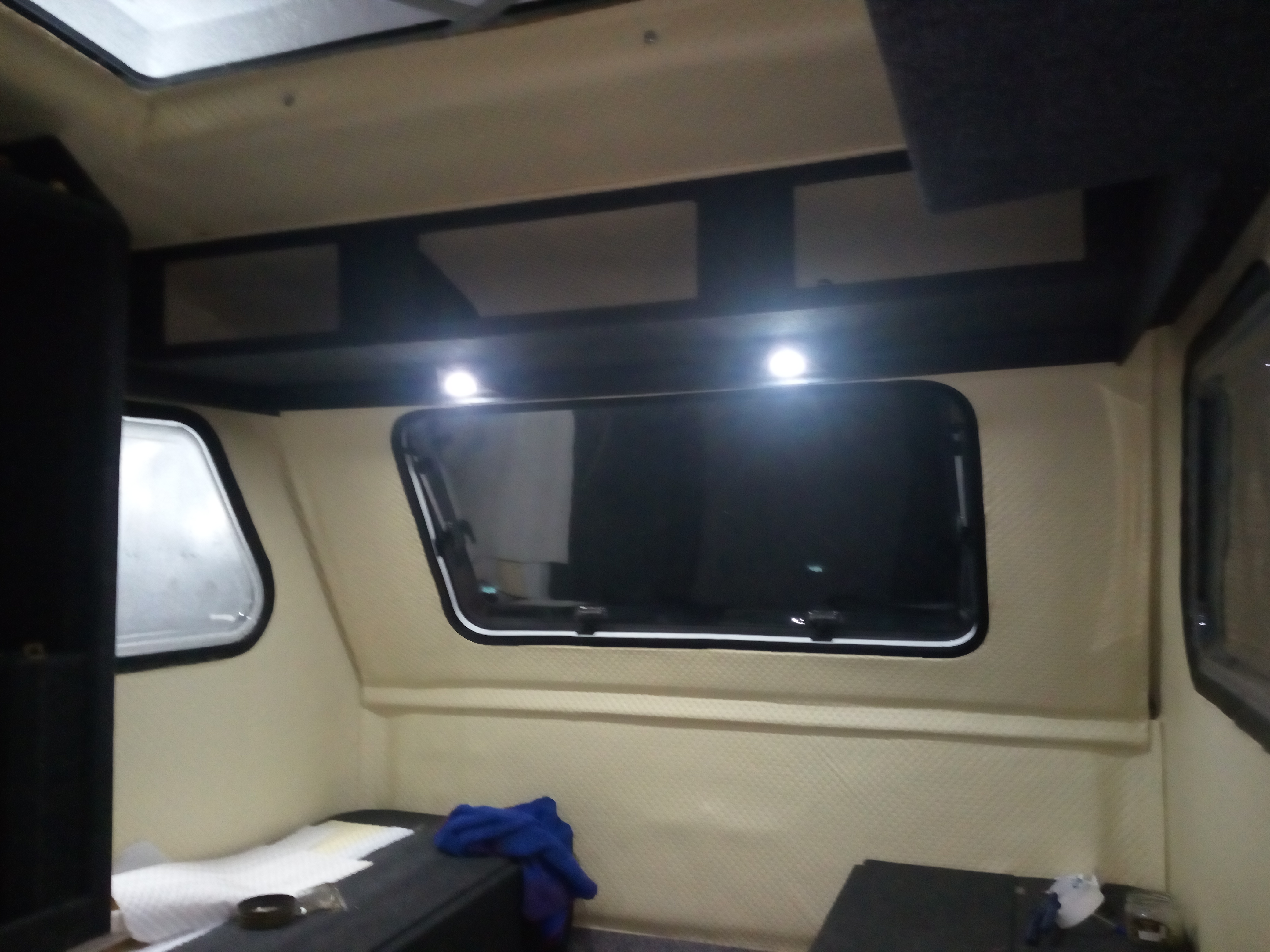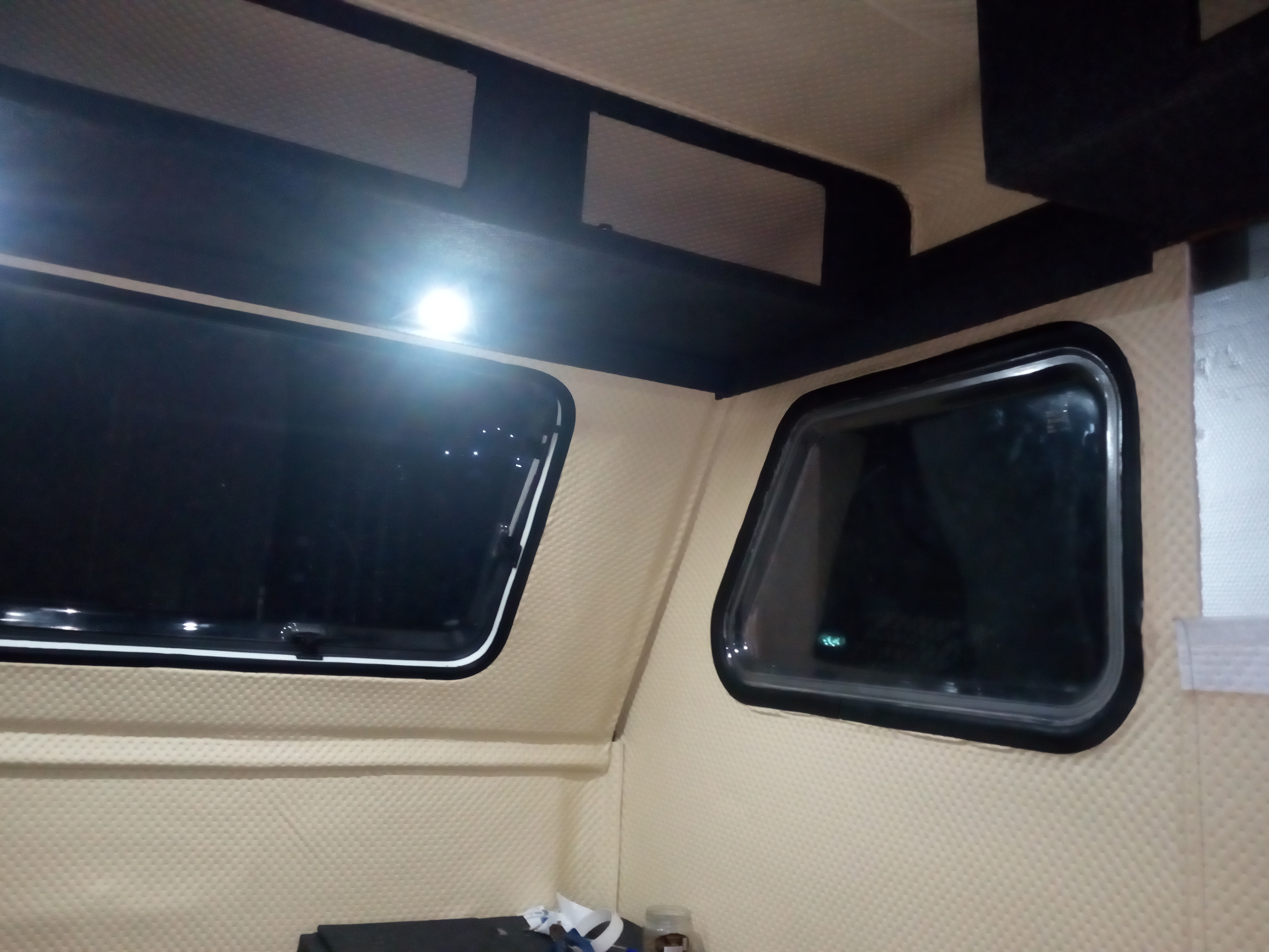 I mamy oświetlenie przedsionka, które w razie "Wu" może robić za wywietrznik. Te piłeczki po bokach te listwy zrobiłem pod spodem pseudo karnisze i oświetlenie. Cztery lampki z osobnymi wyłącznikami po 1,5W dają radę; mało prądu sporo światła. Fajnie, a to ważne gdyż przyczepa będzie niezależna.