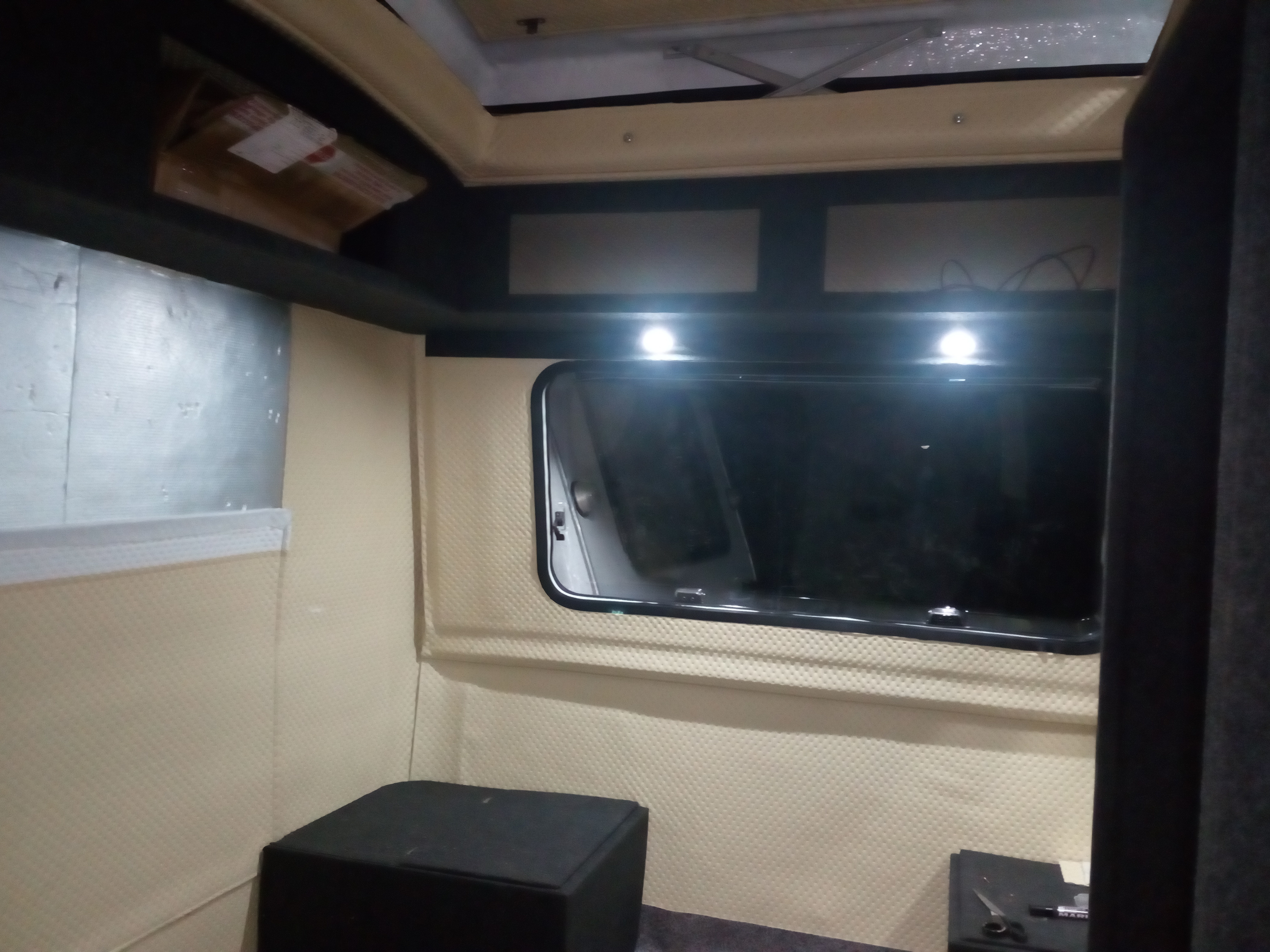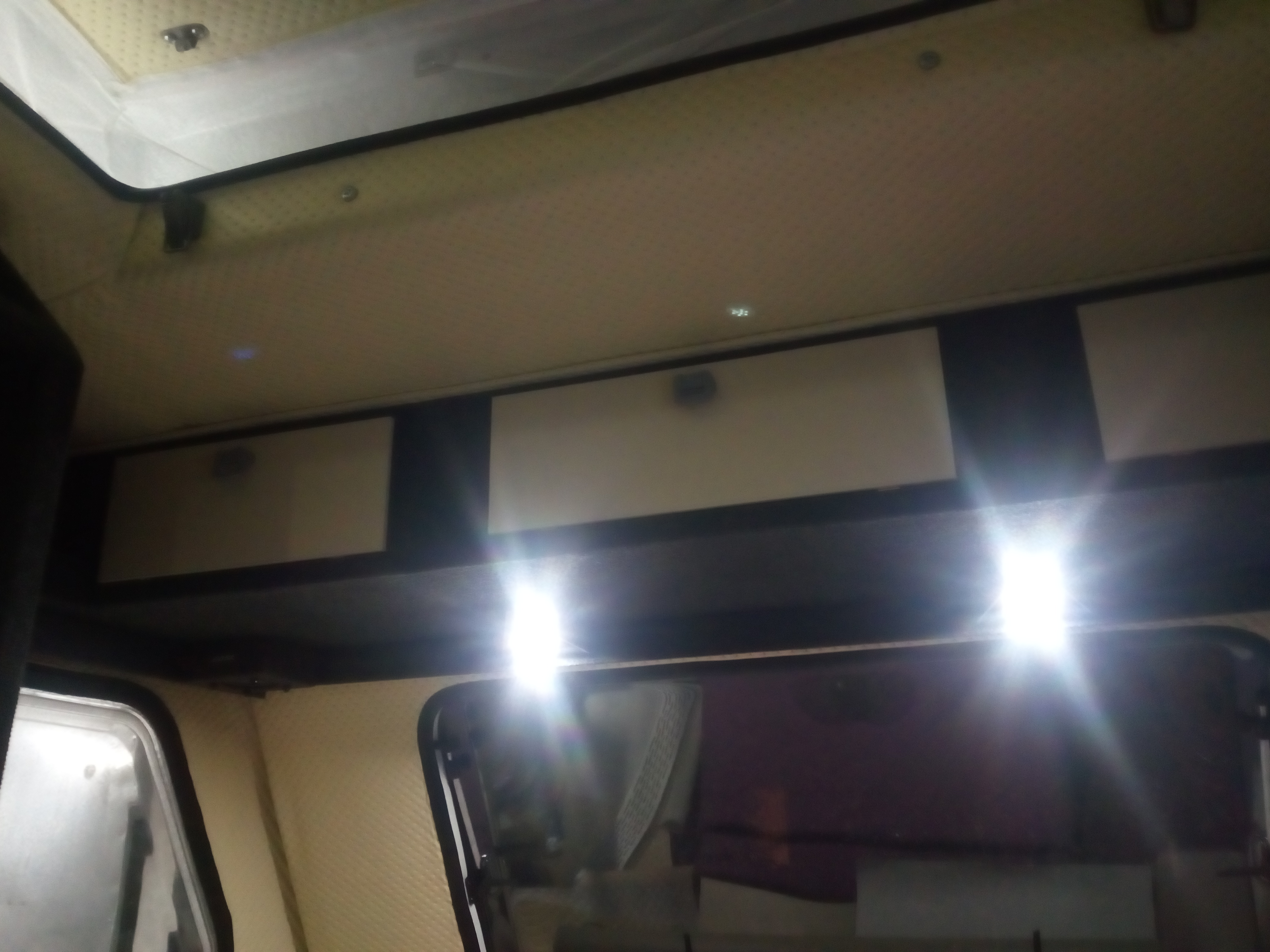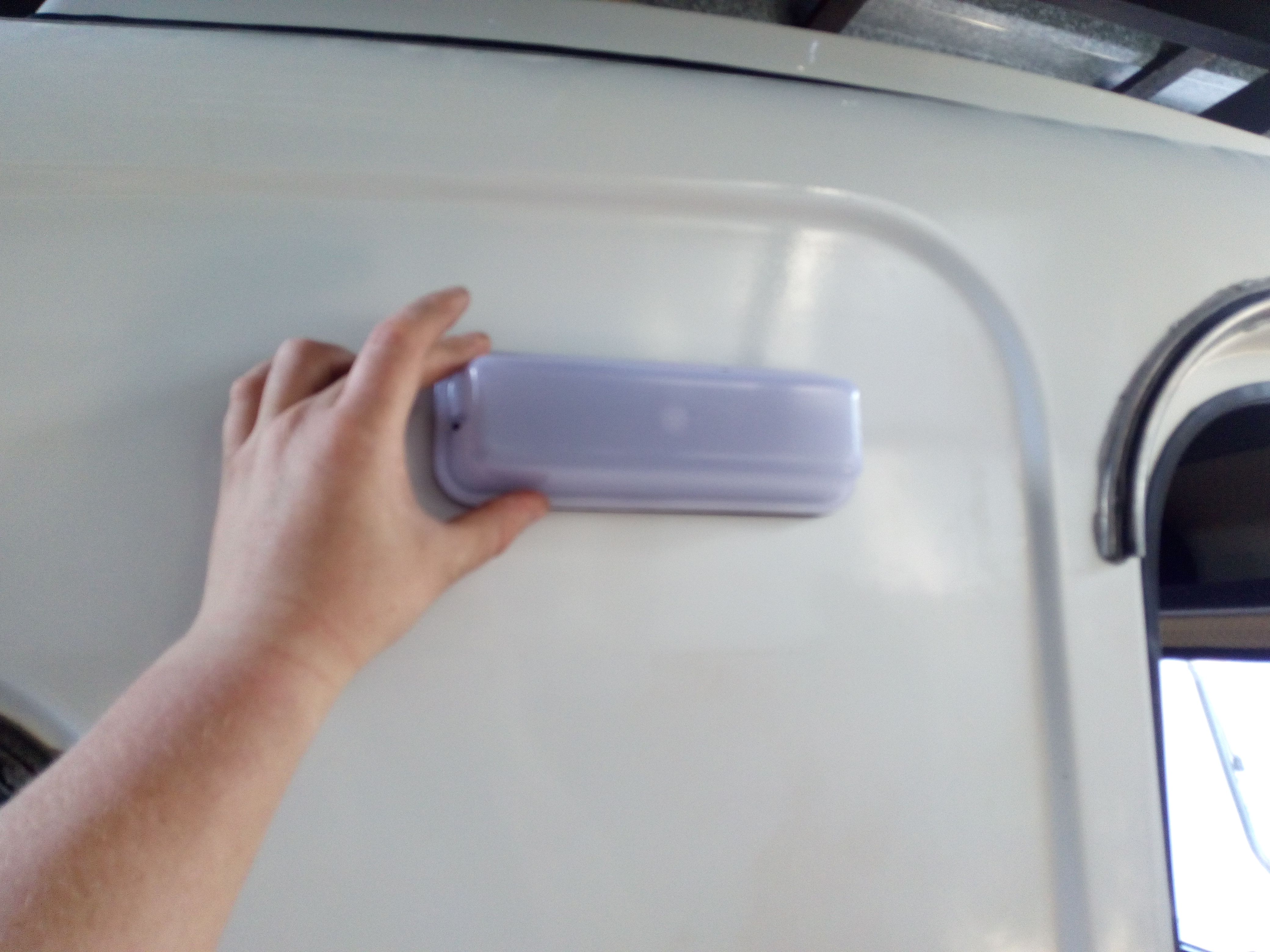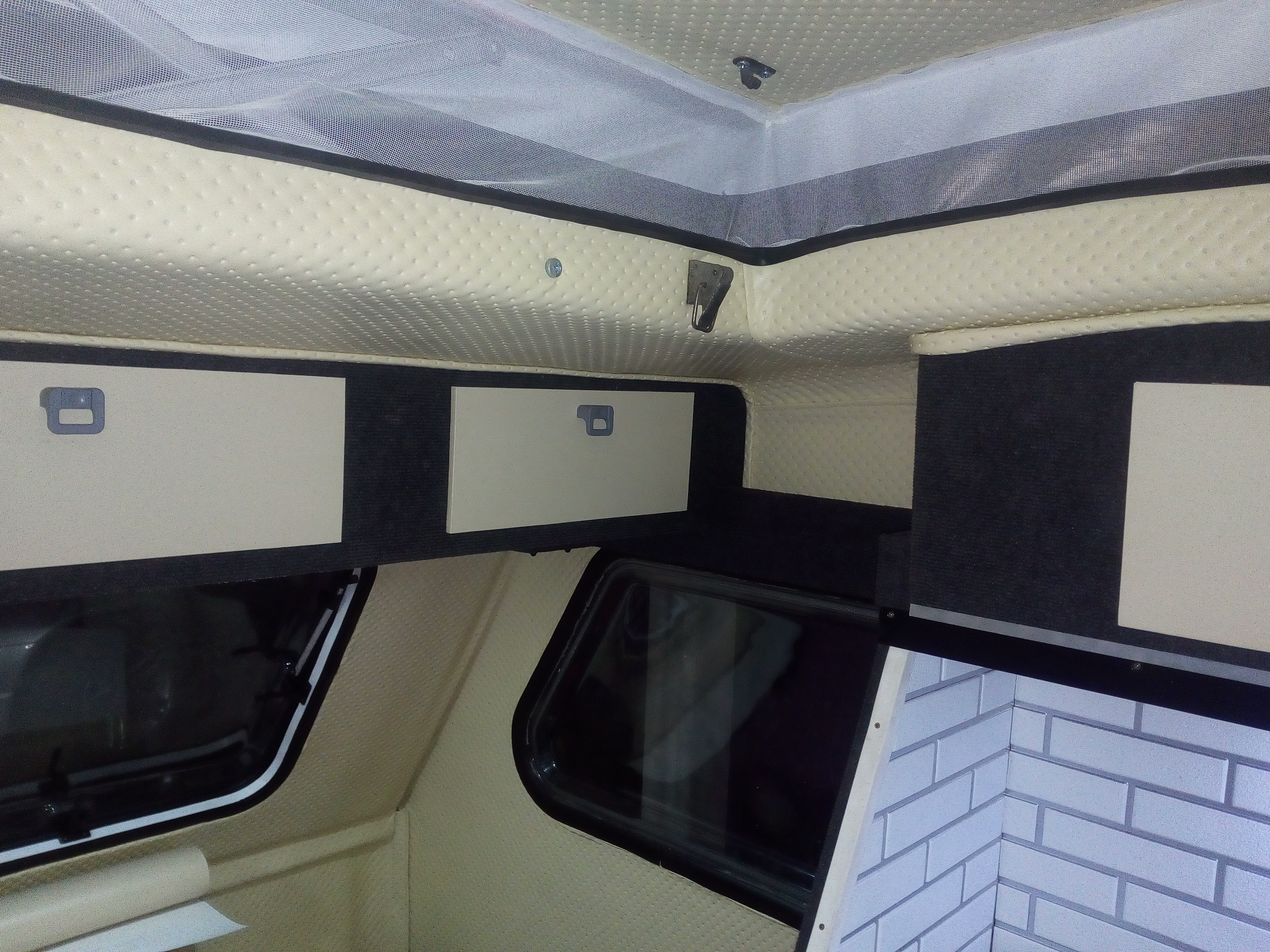 I mamy oświetlenie przedsionka, które w razie "Wu" może robić za wywietrznik. Te piłeczki po bokach te listwy zrobiłem pod spodem pseudo karnisze i oświetlenie. Cztery lampki z osobnymi wyłącznikami po 1,5W dają radę; mało prądu sporo światła. Fajnie, a to ważne gdyż przyczepa będzie niezależna.