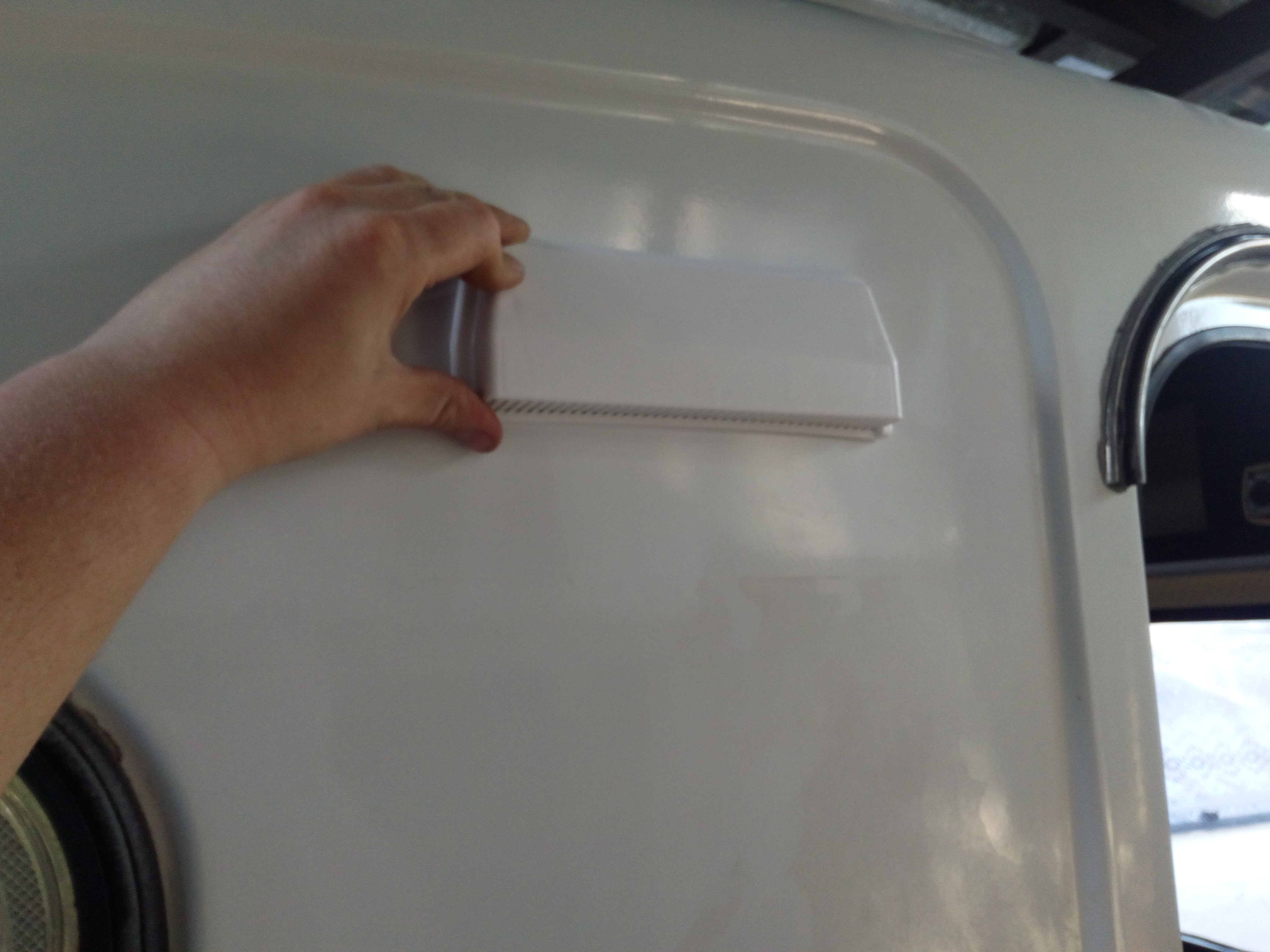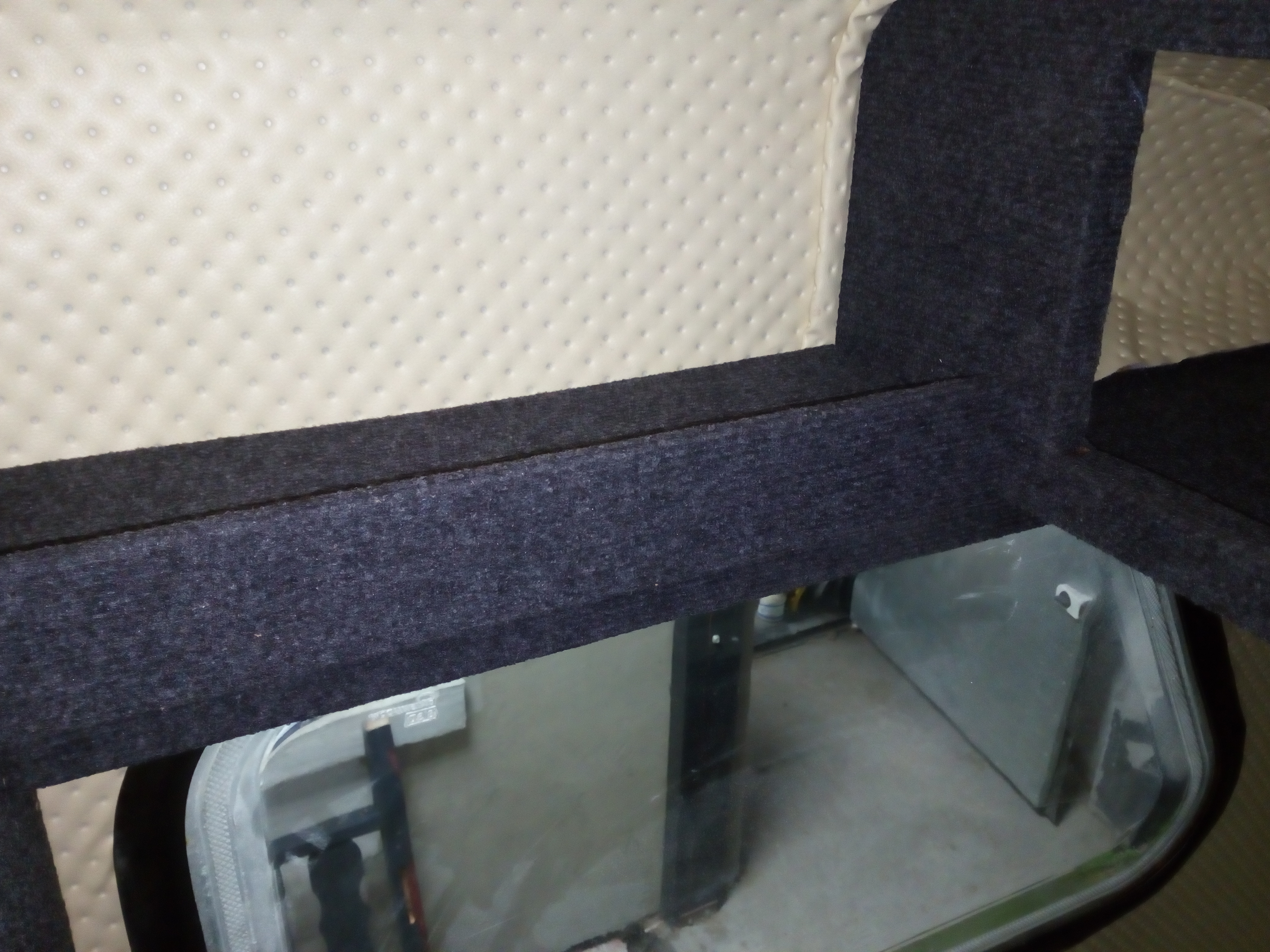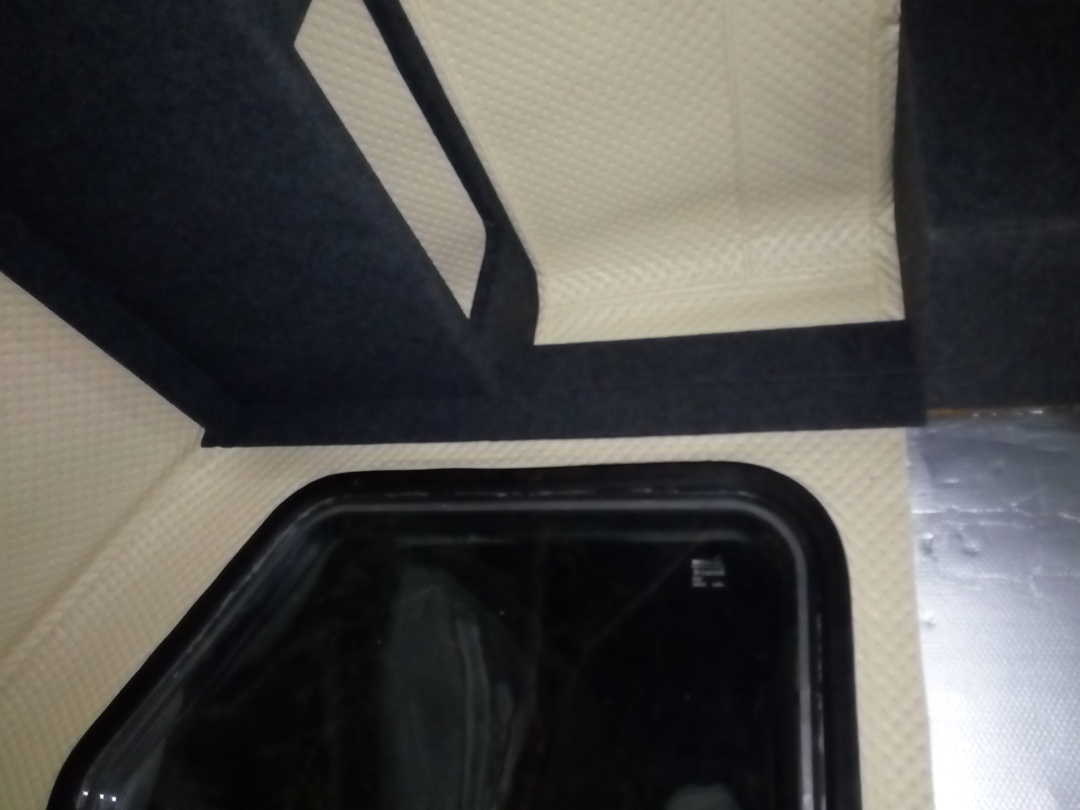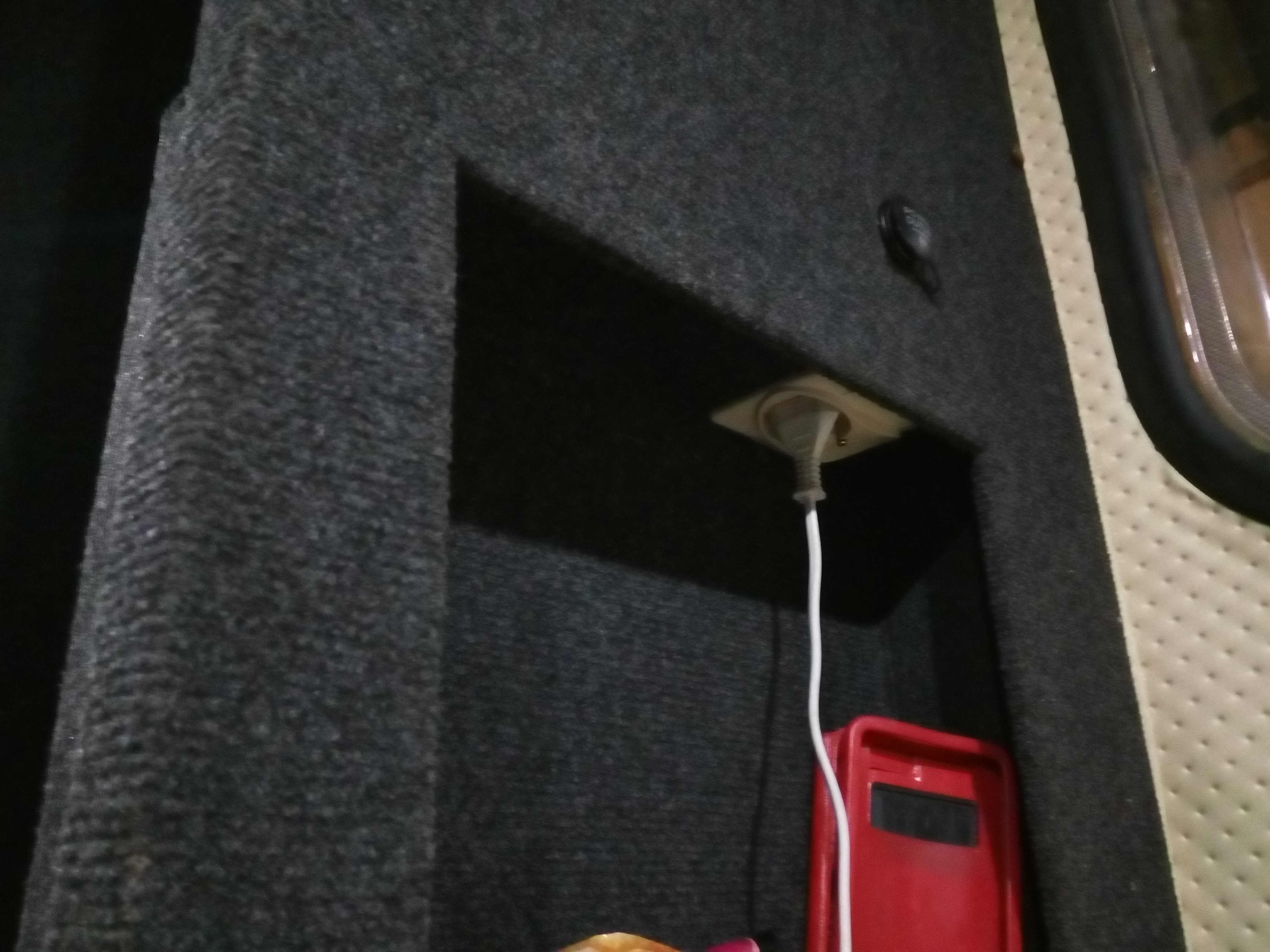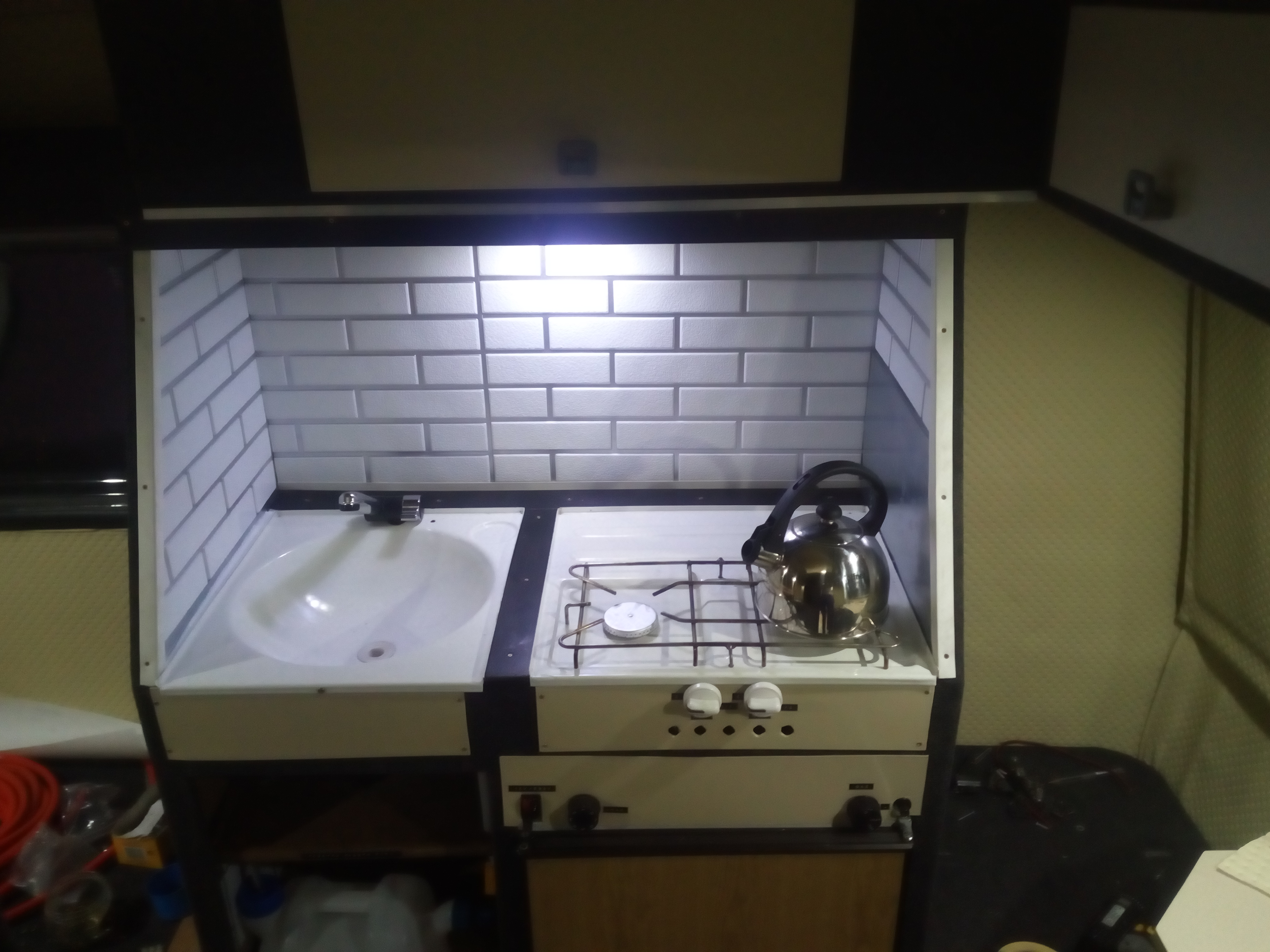 I mamy oświetlenie przedsionka, które w razie "Wu" może robić za wywietrznik. Te piłeczki po bokach te listwy zrobiłem pod spodem pseudo karnisze i oświetlenie. Cztery lampki z osobnymi wyłącznikami po 1,5W dają radę; mało prądu sporo światła. Fajnie, a to ważne gdyż przyczepa będzie niezależna.