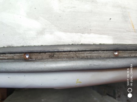 Po ściągnięciu listwy doszedłem do wniosku,że trzeba usunąć stare sruby,ubytki zaszpachlowac ponieważ śruba dalej będzie rdzewieć a może to być miejsce ewentualnego nowego przecieku. Montaż pomiędzy otworami starymi oczywiście na nierdzewnych...
