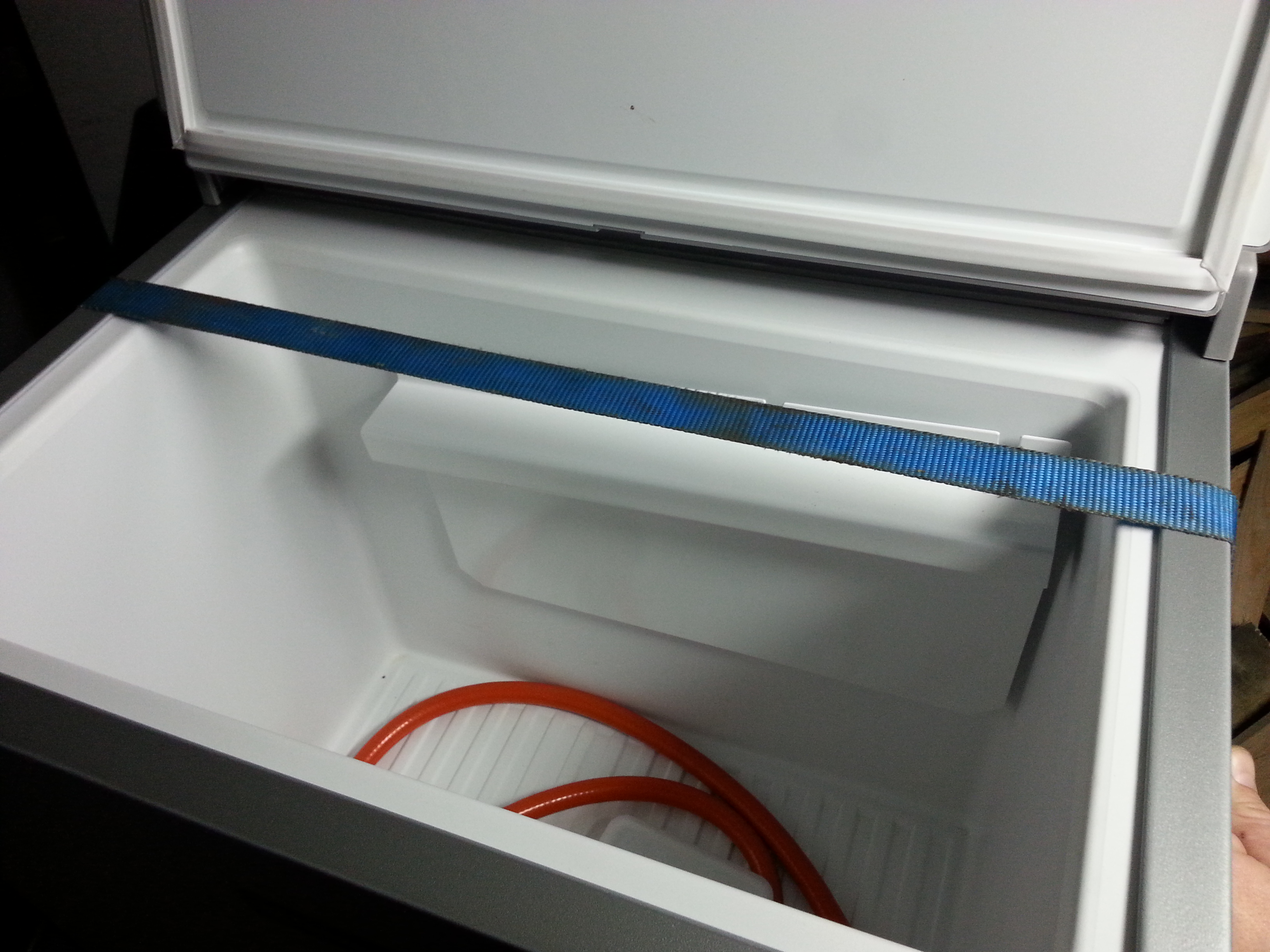 To nie wkręty są liche tylko cienka blacha z której jest zrobiona lodówka.Przykręcając uchwyty do obojętnie której ścianki myślę że po pewnym czasie zostanie to wyrwane.Jedynie wyjście to puścić śruby na wylot ale kto będzie masakrował swój nabytek? Ja to rozwiązałem w ten sposób że cienki pas transportowy będzie przebiegał pod klapą a ugięcie uszczelki jest po prostu minimalne.Na pewno nie wpłynie to na jakość chłodzenia bo szefo mój ma identyczną i oryginalnie uszczelki nie ma wcale.Zapodaję niżej zdjęcie poglądowe.