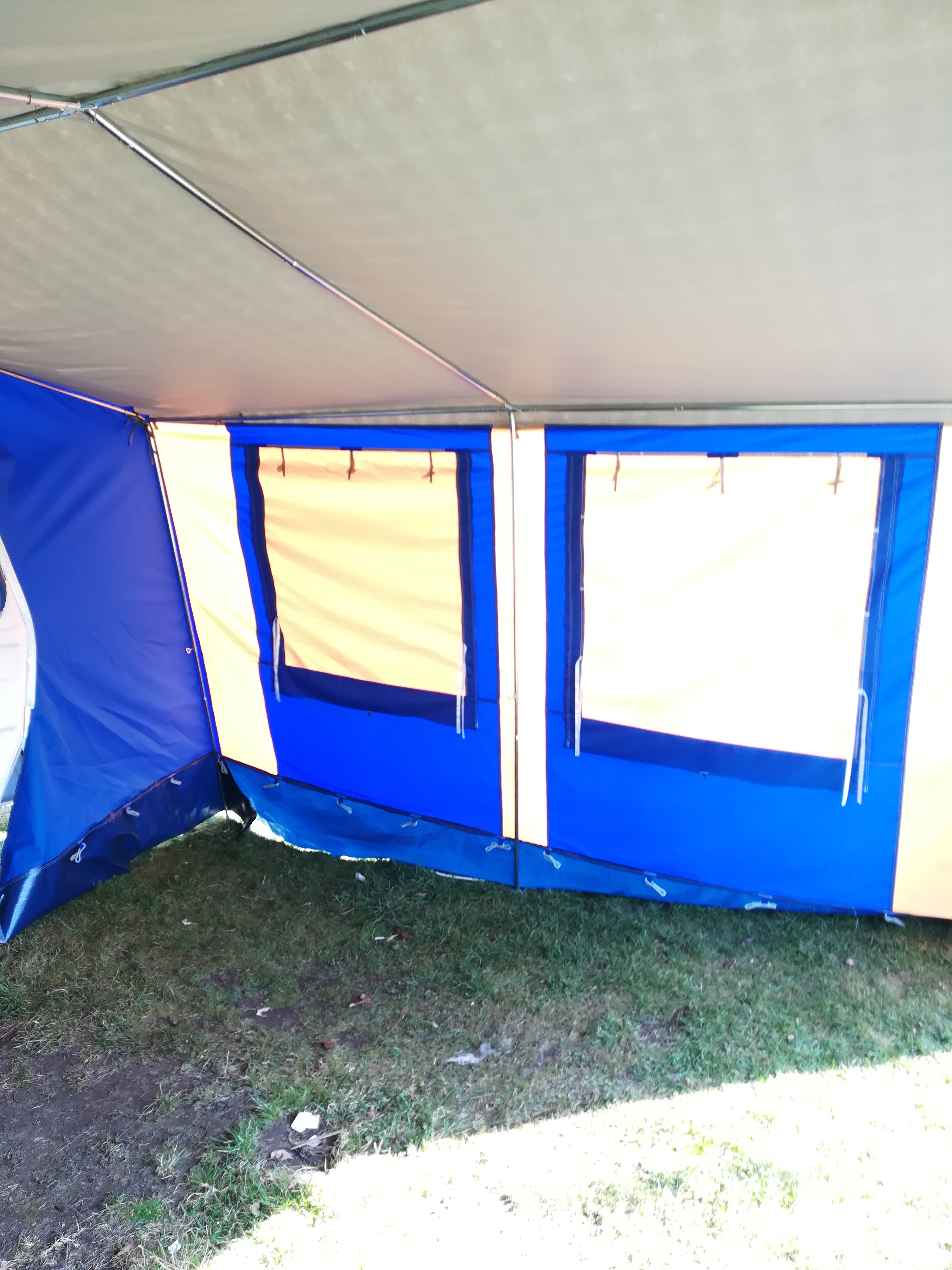 Trochę niewyraźne ale wszystko widać. Przedłużony w bok o metr. Na tym rozmazanym widać jak szeroki jest nowy przedsionek. Praktycznie do dyszla. Nie jest naciągnięty bo rozłożony tylko żeby poopisywać wszystkie rurki.