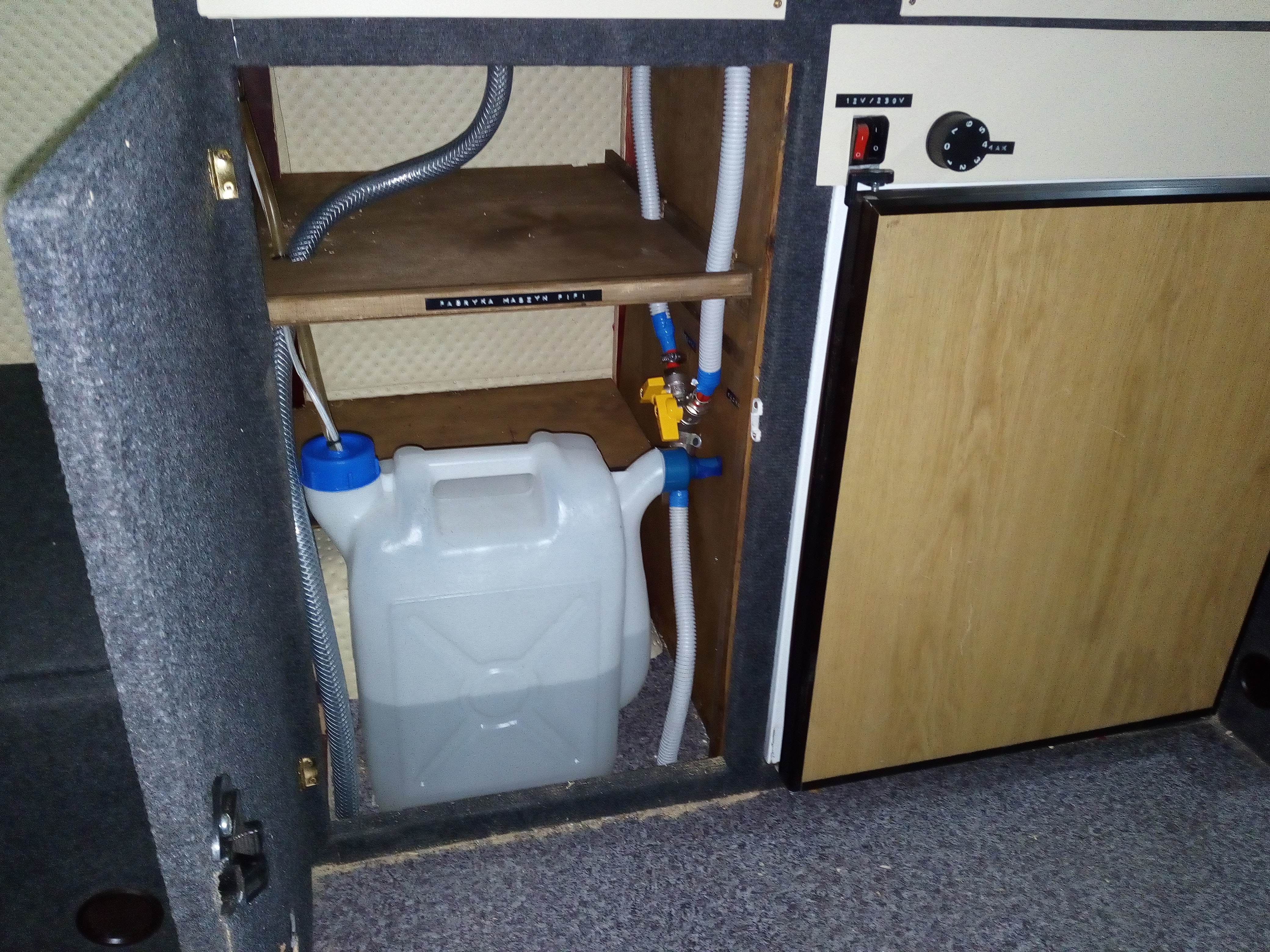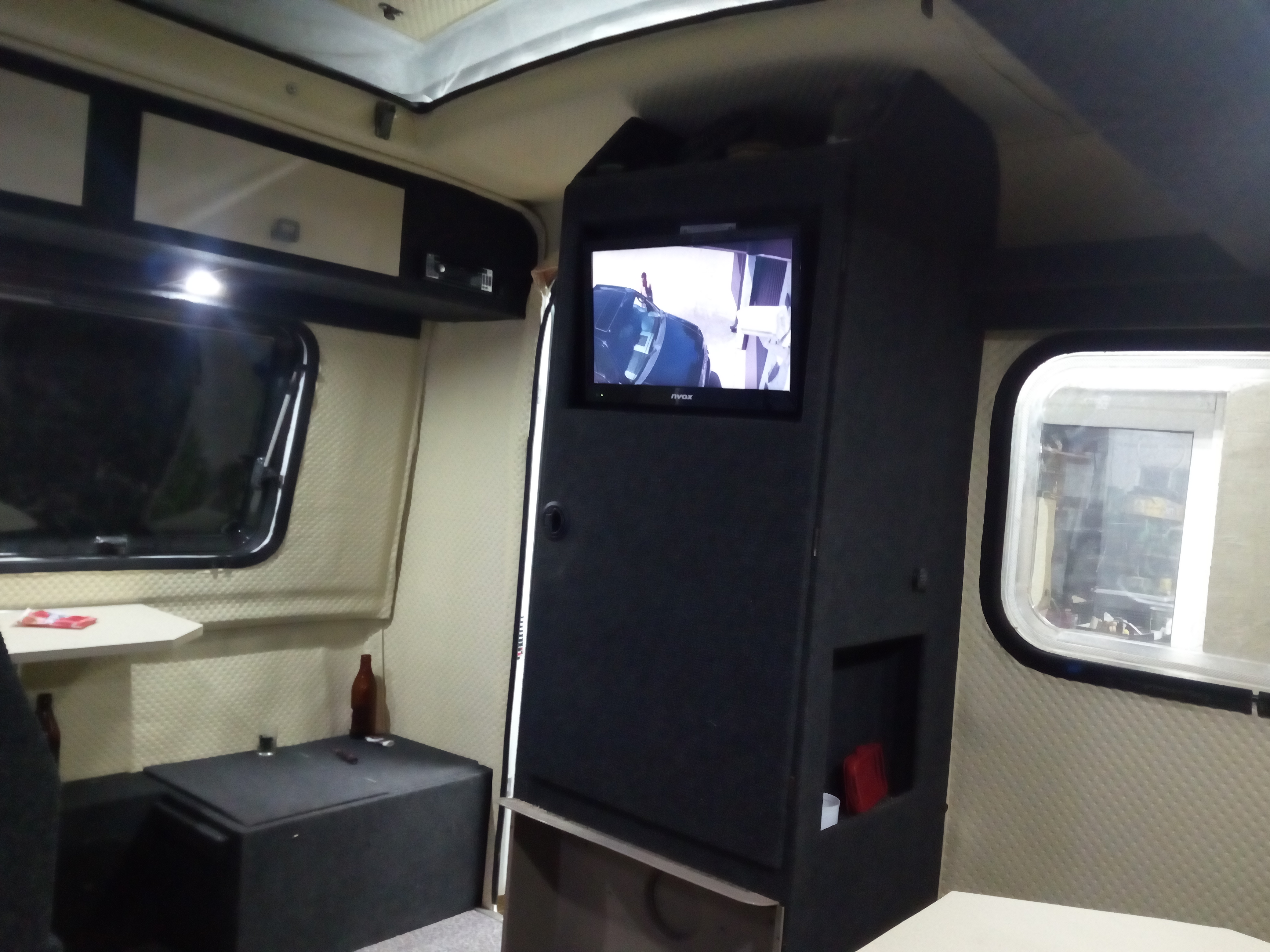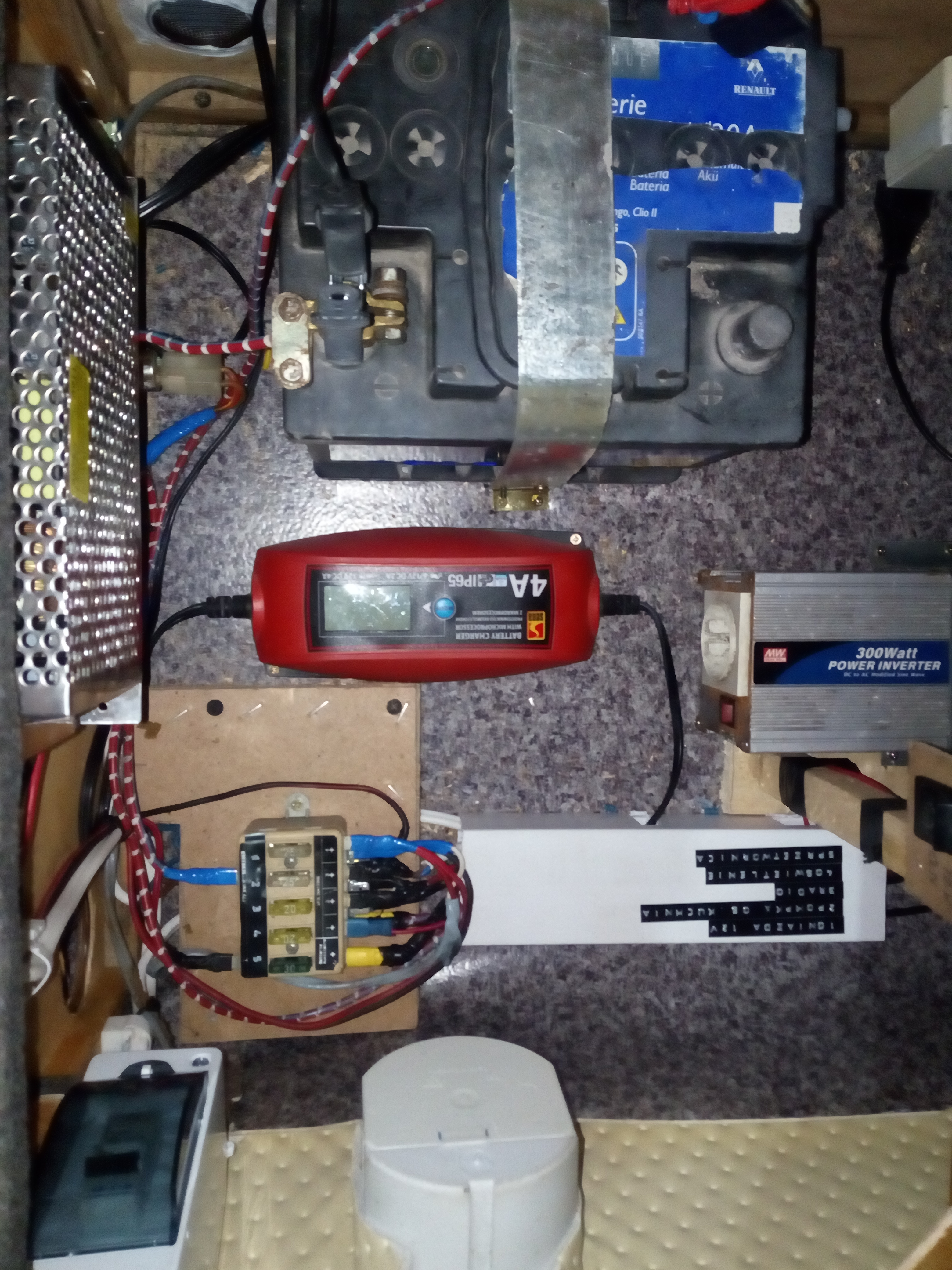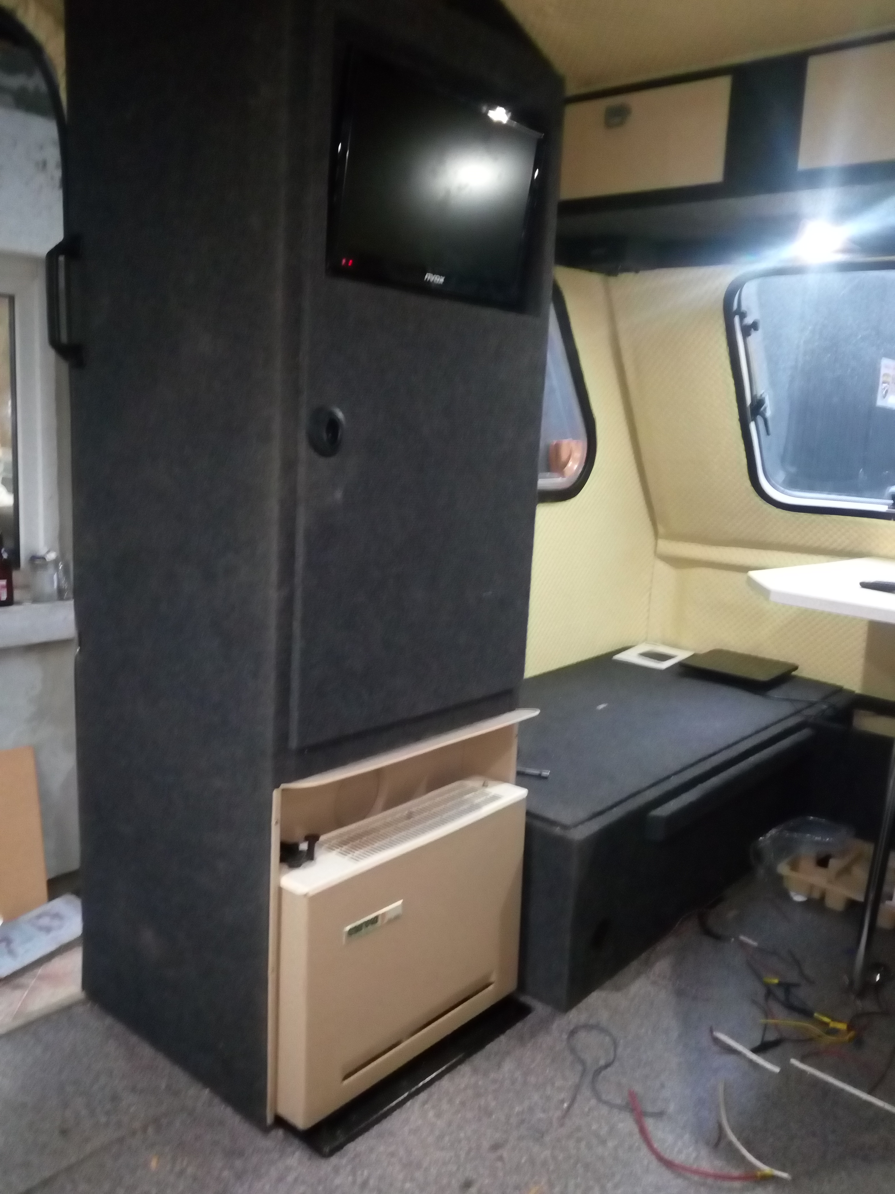 Doszedłem prawie do ładu z prądami, jeszcze panel słoneczny i przełączanie źródła 12v 230v, mamy bezpiecznik 230v, bezpieczniki 12v, przetwornicę 300w, ładowarkę akumulatora, zasilacz 150w i akumulator 47 Ah z odprowadzeniem gazów poza przyczepę. I pojawił się dobrze wszystkim znany Carver SB 1800 wkomponowany w szafę z oryginalną obudową! Szafa powiększona na styk z wejściem.