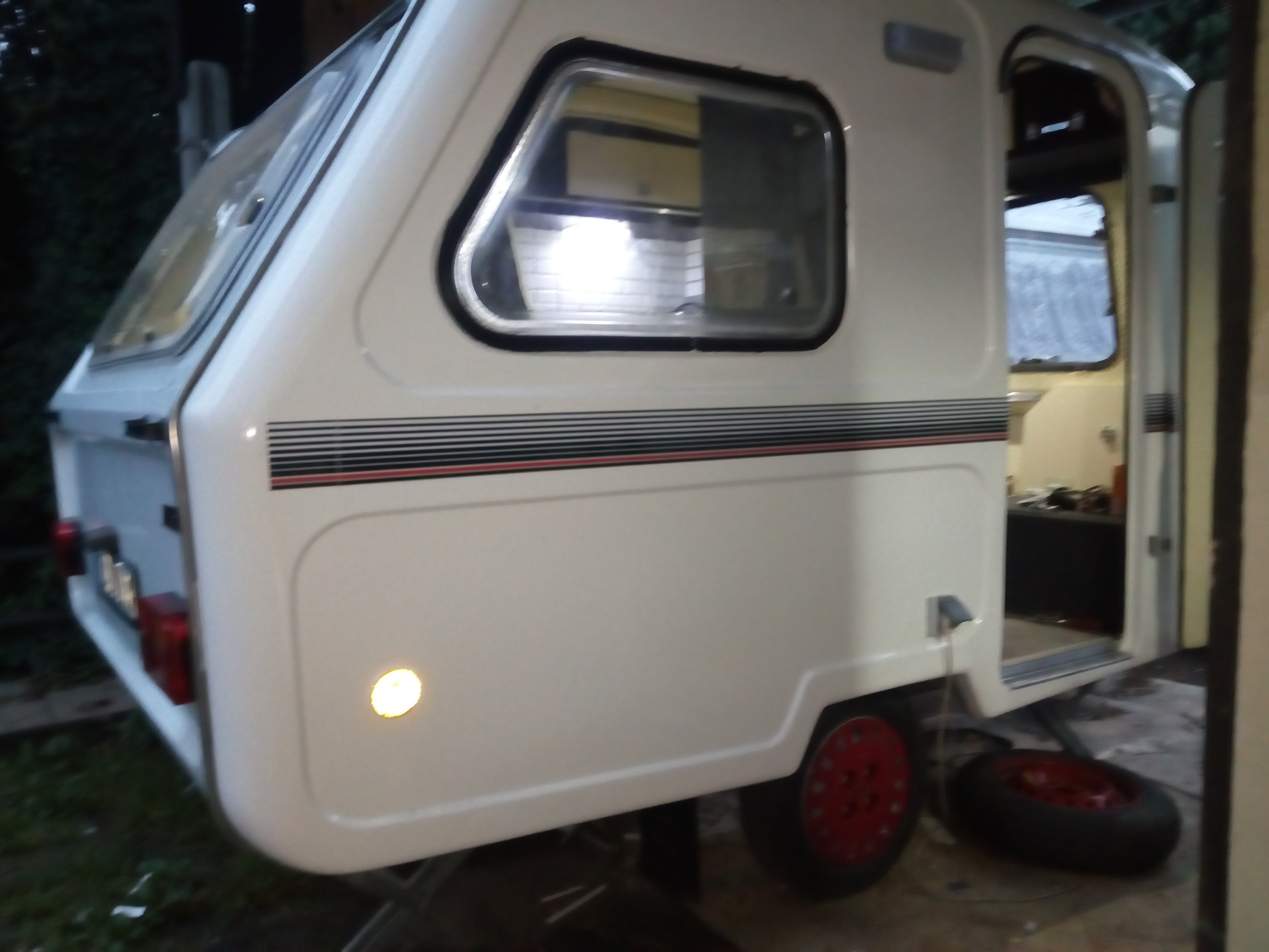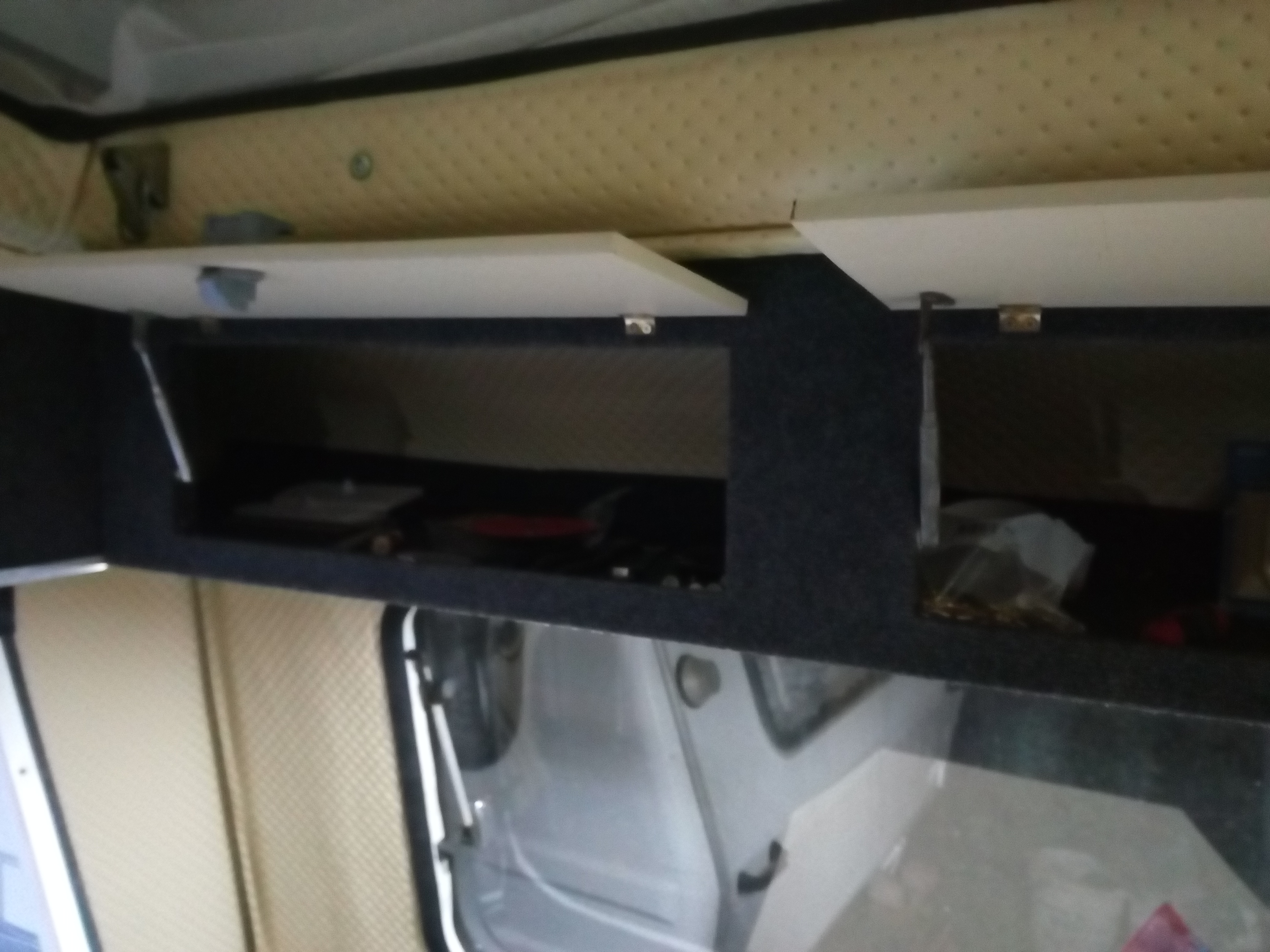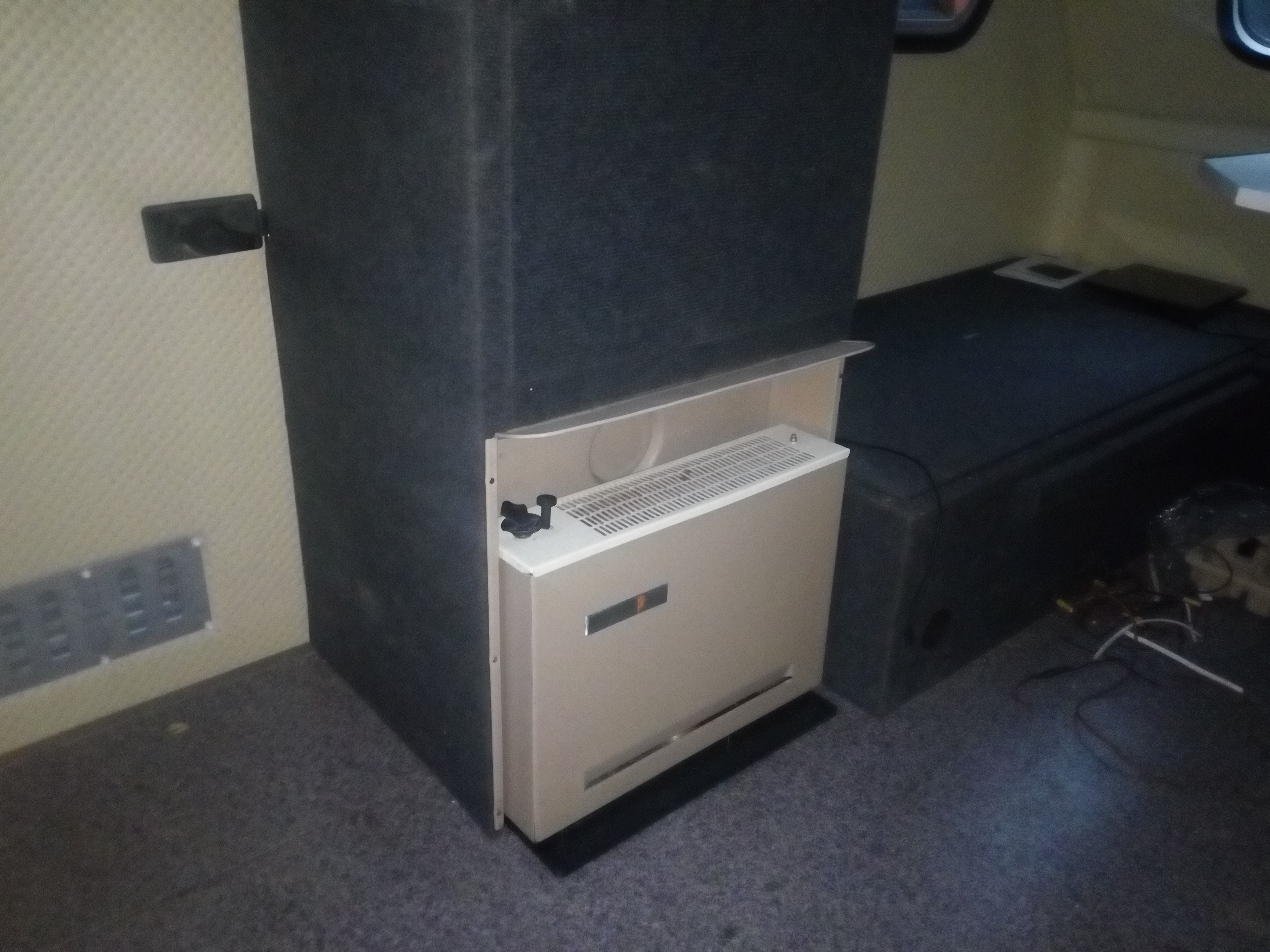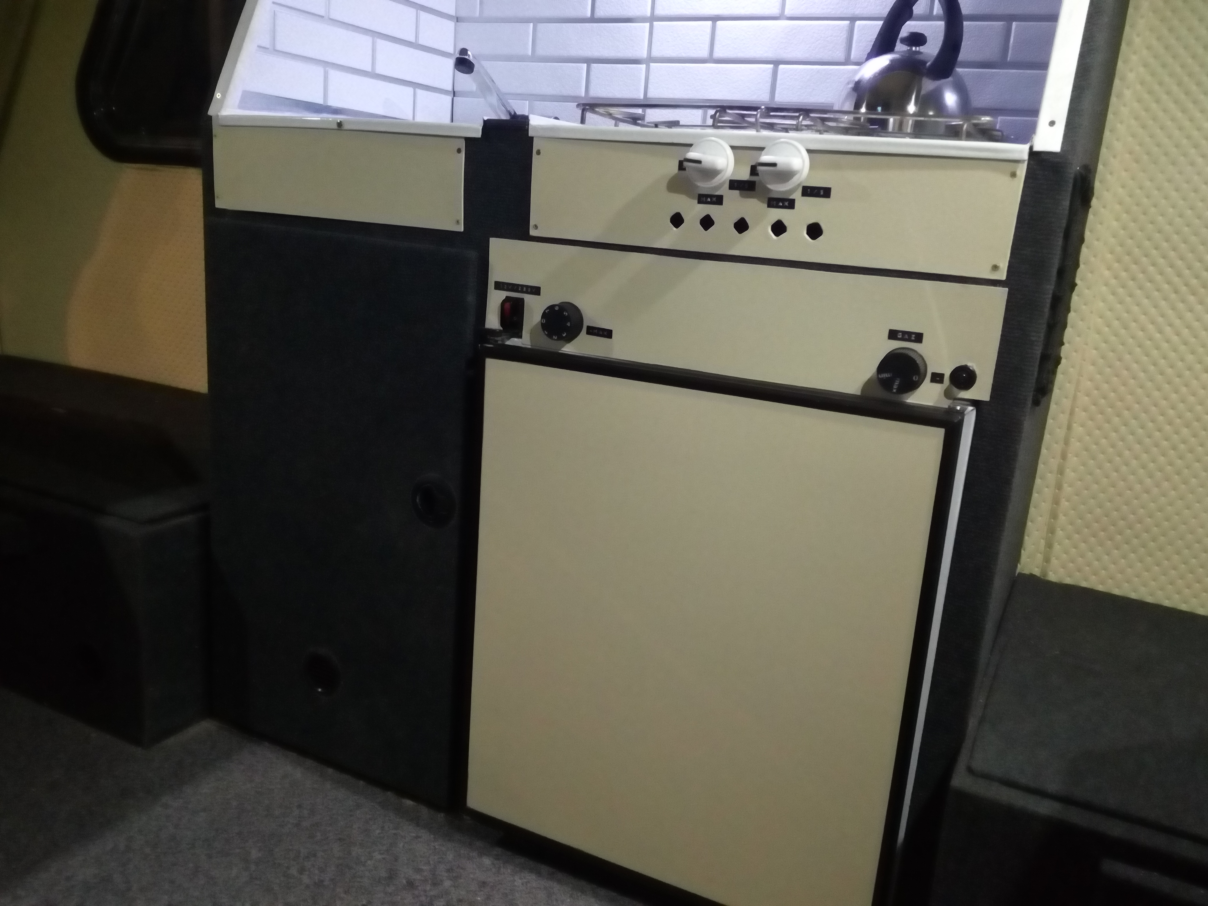 Doszedłem prawie do ładu z prądami, jeszcze panel słoneczny i przełączanie źródła 12v 230v, mamy bezpiecznik 230v, bezpieczniki 12v, przetwornicę 300w, ładowarkę akumulatora, zasilacz 150w i akumulator 47 Ah z odprowadzeniem gazów poza przyczepę. I pojawił się dobrze wszystkim znany Carver SB 1800 wkomponowany w szafę z oryginalną obudową! Szafa powiększona na styk z wejściem.