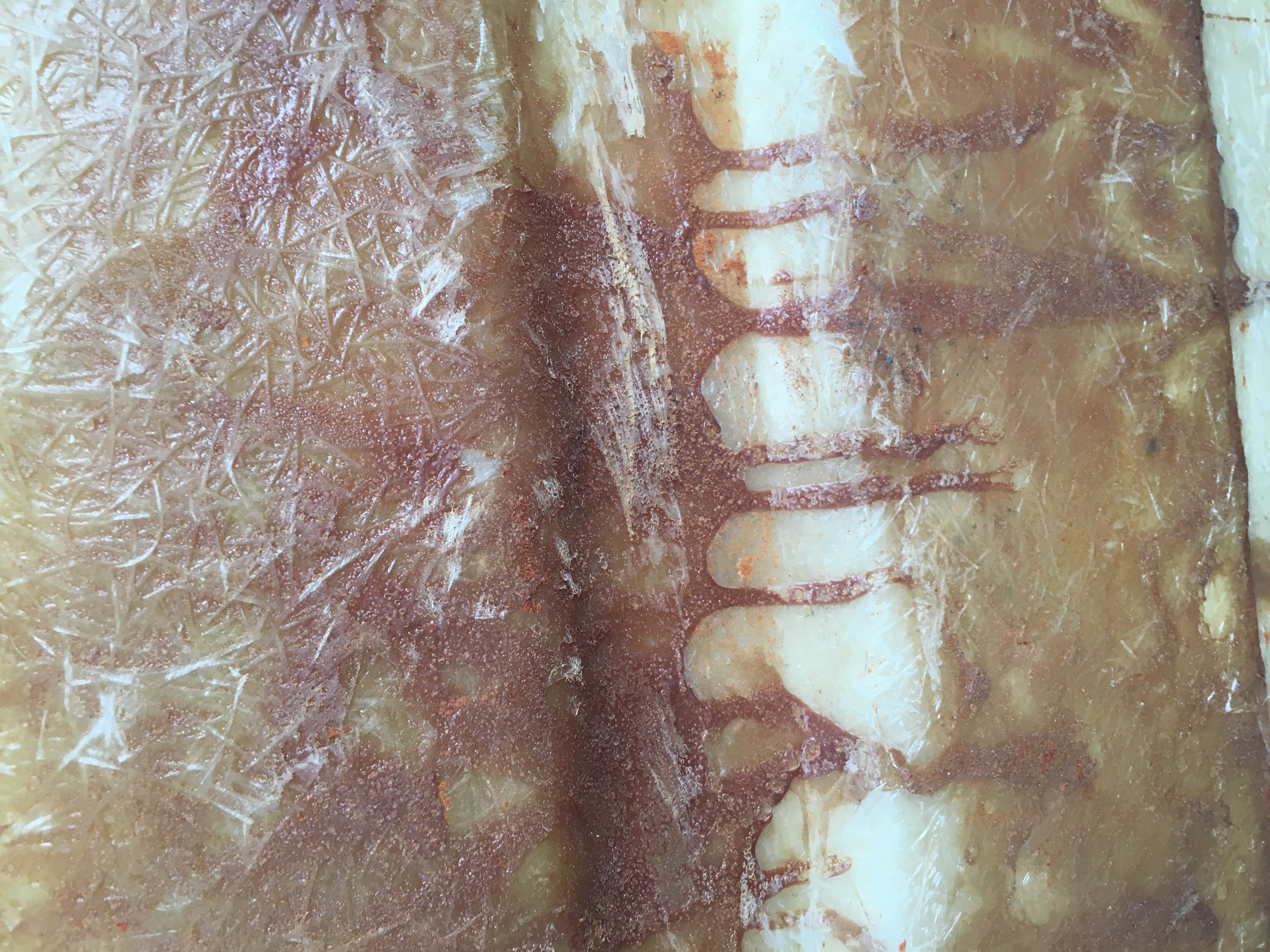 To czarne to osmoza ( gangrena) jak chcesz zrobić porządnie należy wydrzeć dokładnie aby nic nie zostało następnie zalaminować łatwiej to zrobić od wewnątrz.