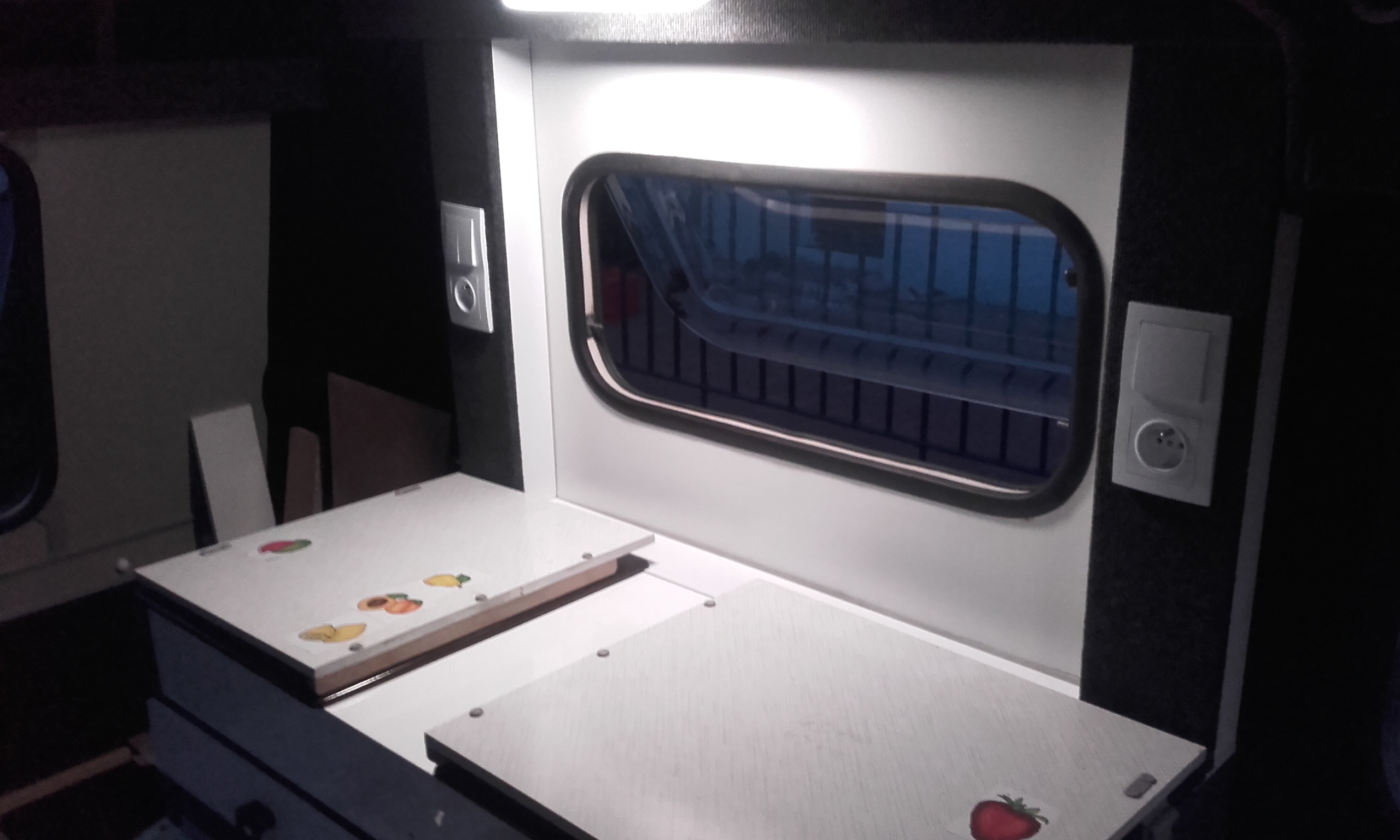 Na wyposażeniu: białe mebelki,lodówka,kuchenka gazowa, butla,zlew z patentem na wodę ciepłą i zimną poprzez dwie pompki,