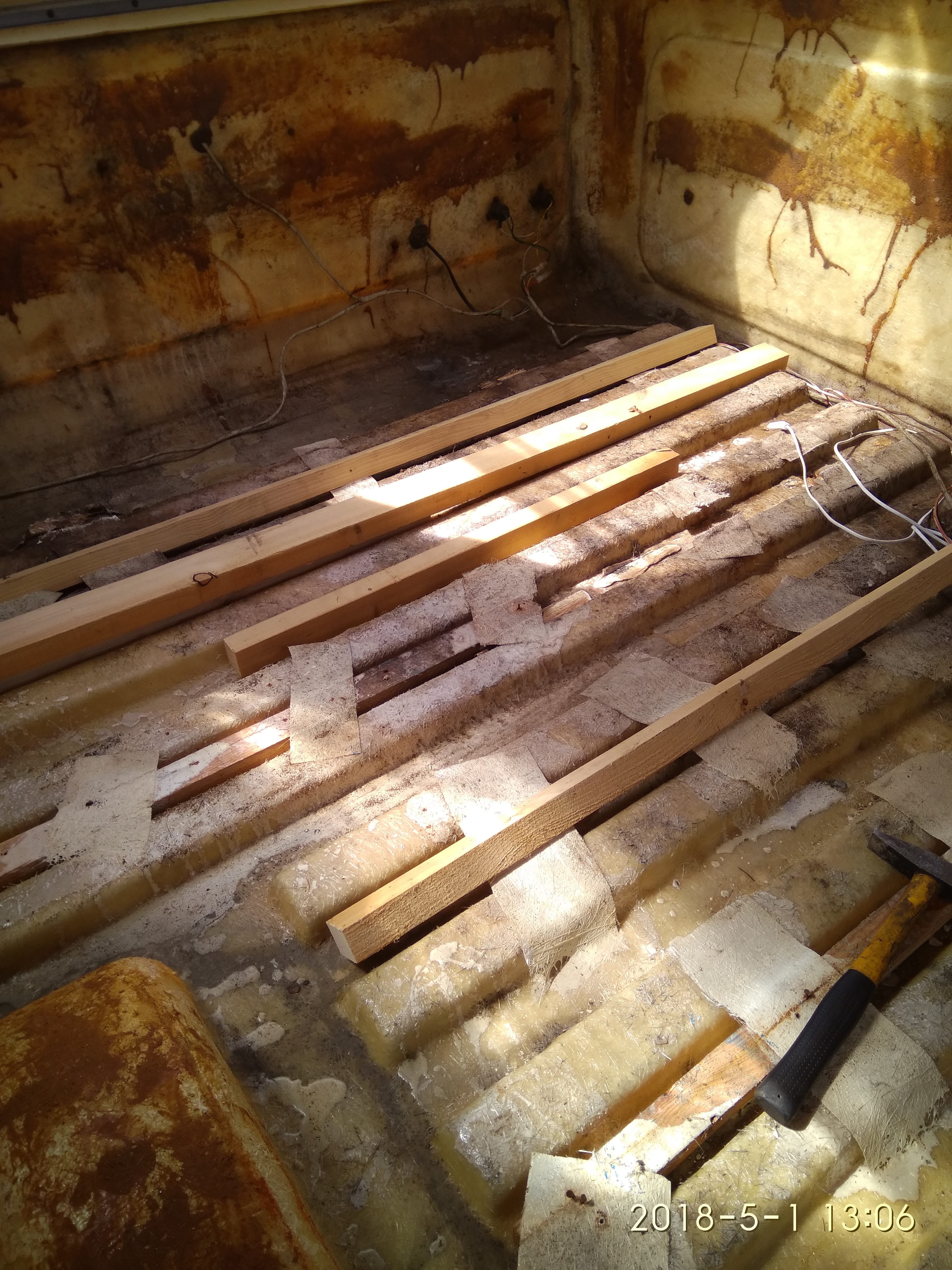 Udało się zrobić nową podłogę z płyty OSB 12 plus wymieniłem część wzmocnień podłogi, niestety zgniły.