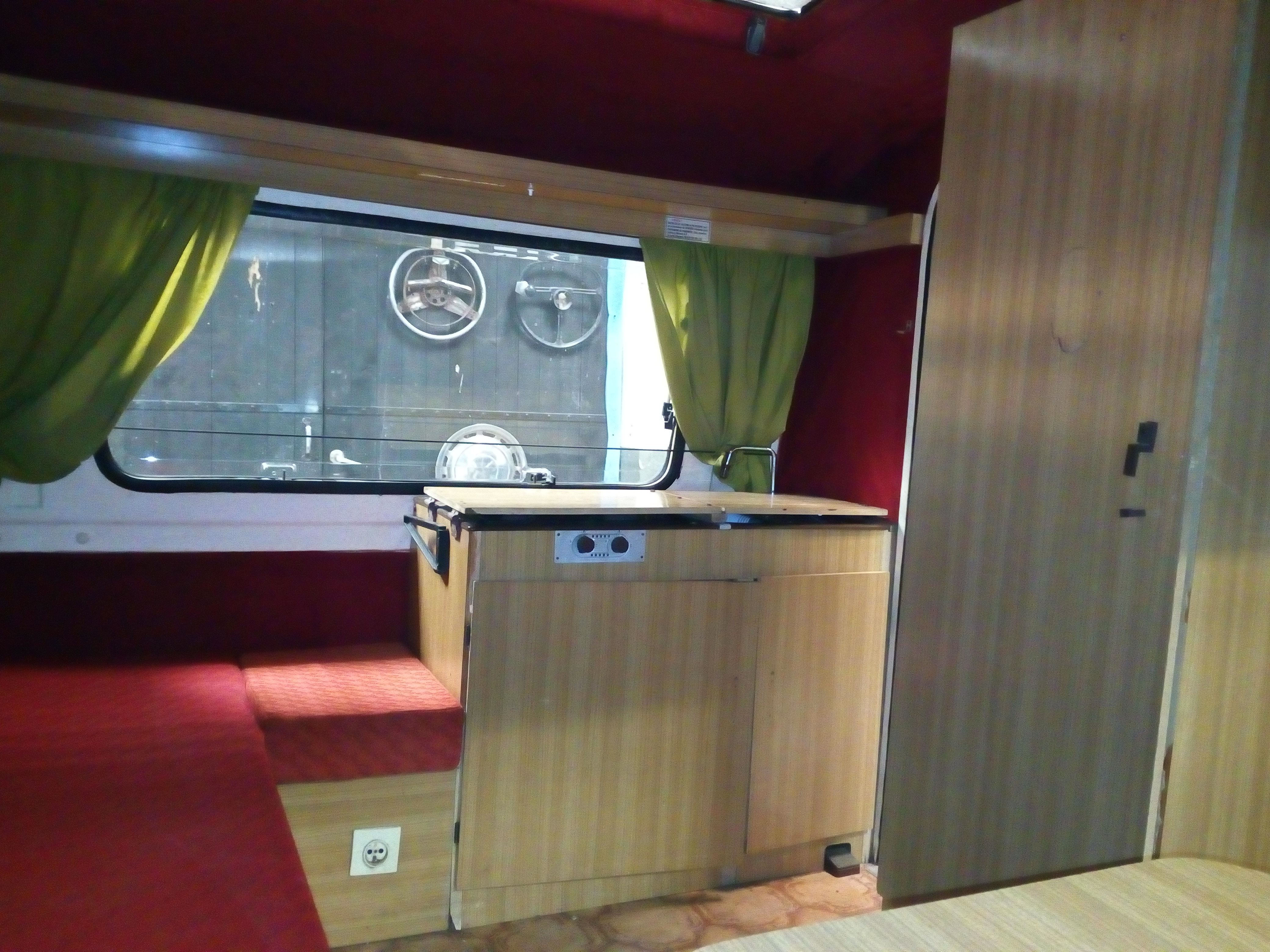Ten materiał czerwony, fakt przytłaczający jest w tak małym wnętrzu. Ale meble chyba dość ładnie zachowane, podreperowałbym i zostawił mebelki w oryginale.