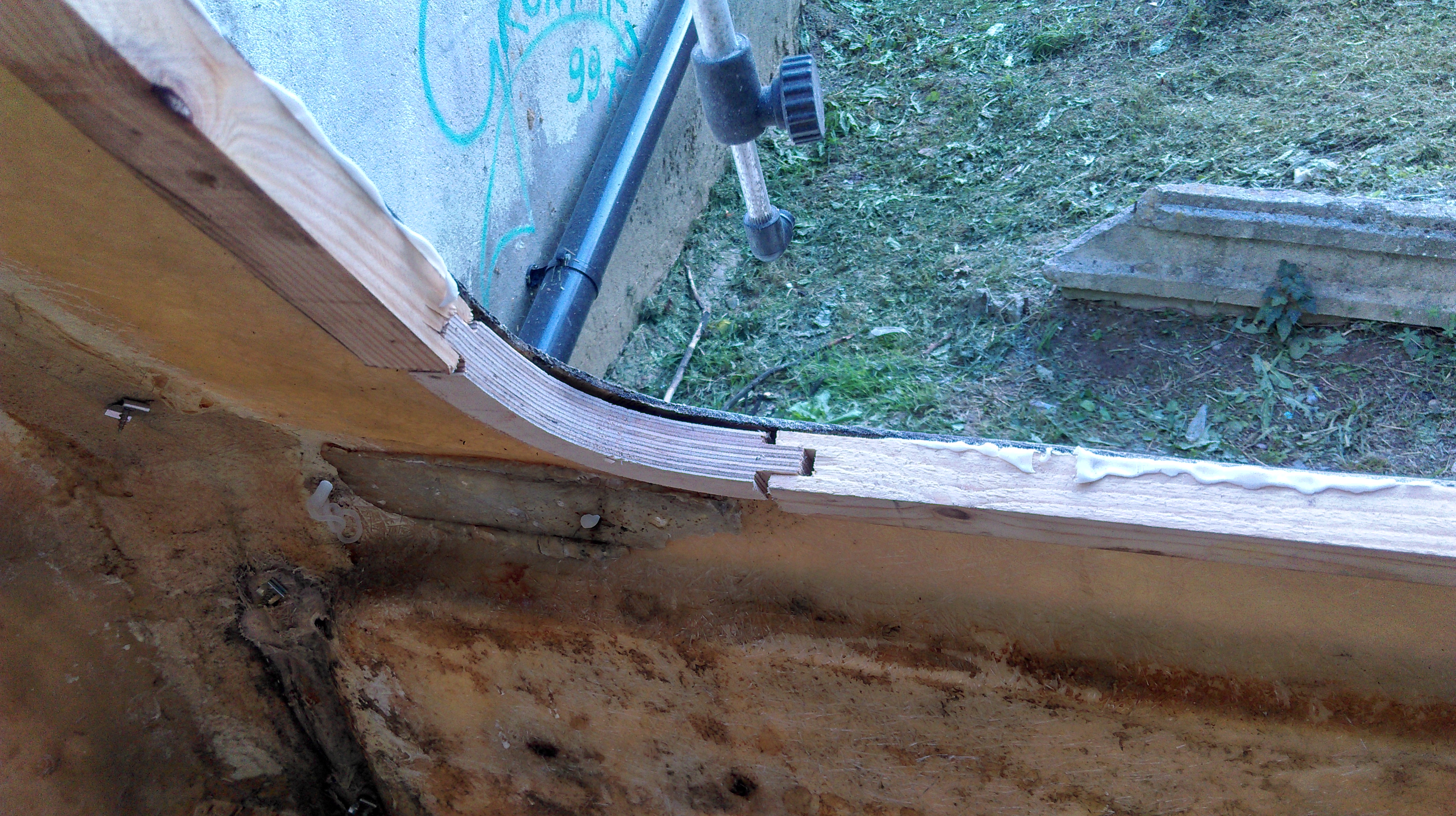 Ubytki i pęknięcia w skorupie zostały zaszpachlowane i w wolnej chwili równam niedoskonałości. Aluminiowe listwy zewnętrzne zostały uszczelnione po stronach zewnętrznych i w miejscu mocowania wkrętów silikonem budowlanym o bardzo dużej odporności na temperaturę i niekorzystne warunki. Zamiast uszczelek z podkładką pod wkręty zastosowałem "glut" owego silikonu a od strony wewnętrznej grube stalowe blaszki montażowe do osłon samochodowych. Mocowanie i uszczelnienie zdało egzamin i trzyma. Ok. 2 tygodnie temu przez trzy dni "lało" i silikonowe gluty wytrzymały. Przyczepka sucha. W międzyczasie wykonałem od nowa ramę okna od strony sypialni. Teraz czekam na uszczelki. Skończyłem również szkielet zabudowy. Zmieniłem nieco układ gdyż przyczepka ma służyć wyłacznie jako sypialnia. Na wprost wejscia będzie lodówka z blatem kuchennym. W międzyczasie rozpocząłem kładzenie instalacji elektrycznej 230 V i 12 V. Do instalacji 12V na kampingu mam zamiar wykorzystać zasilacz 400W ATX z komputera