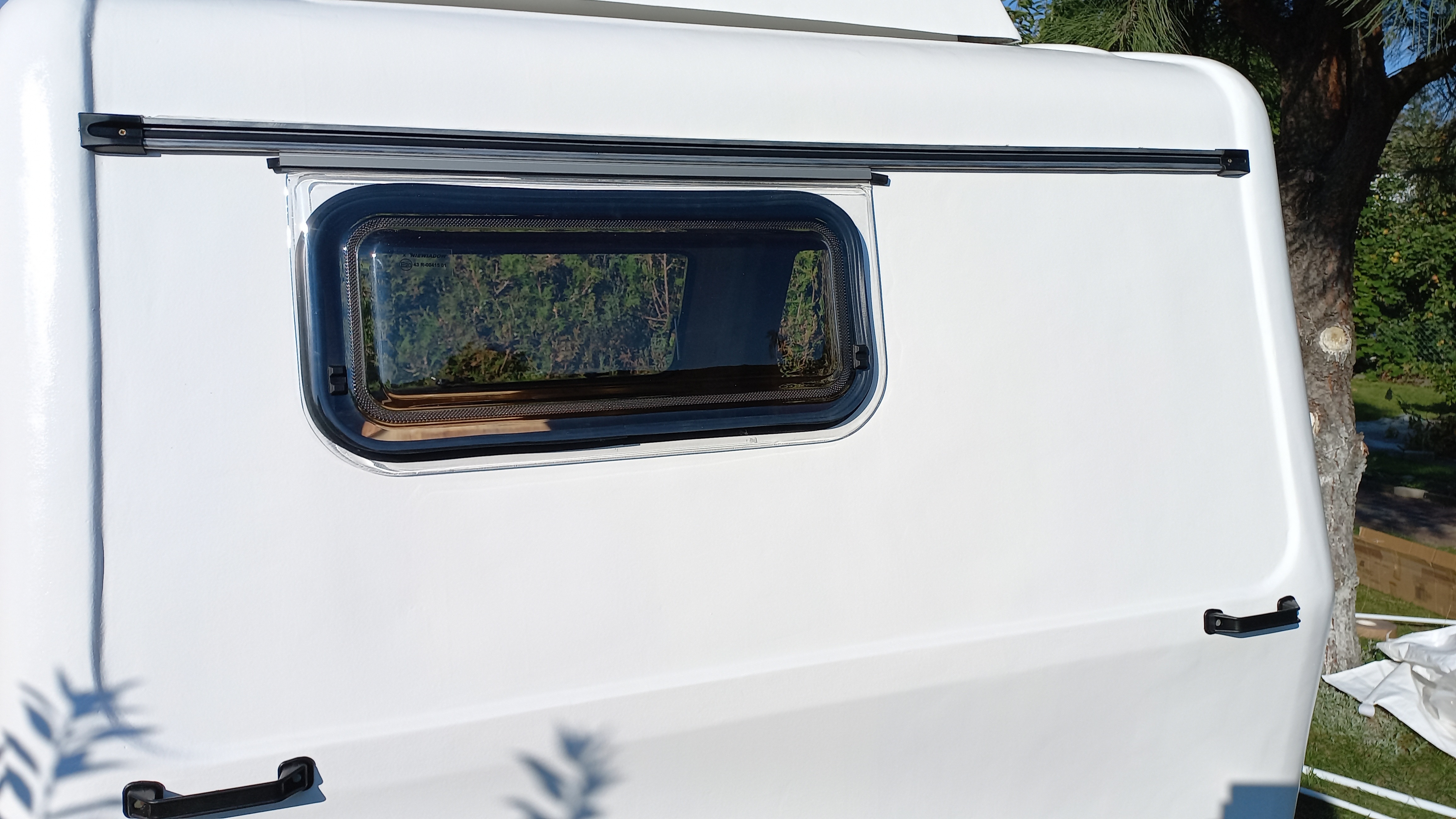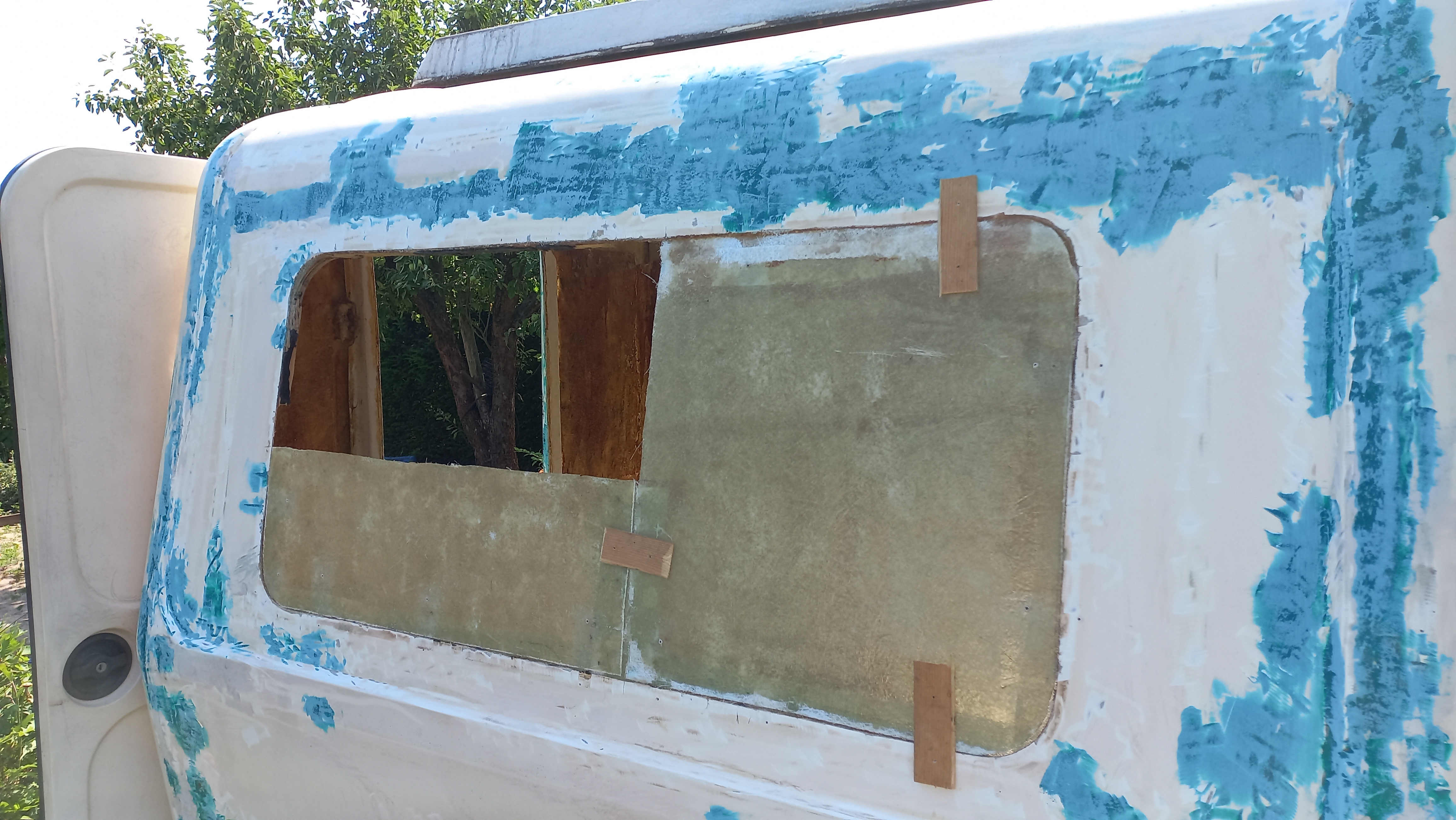 Można też samemu zrobić kawałek laminatu odpowiadającego wielkością otworowi okna laminując na szybie lub unilamie (warstwa wosku-rozdzielacz, żelkot i mata 2x450g/m kw. ). Następnie dociąć laminat według otworu w skorupie, umocować w otworze (np jak wyżej) zalaminować łączenie od wewnątrz i na koniec zaszpachlować szczelinę na zewnątrz.