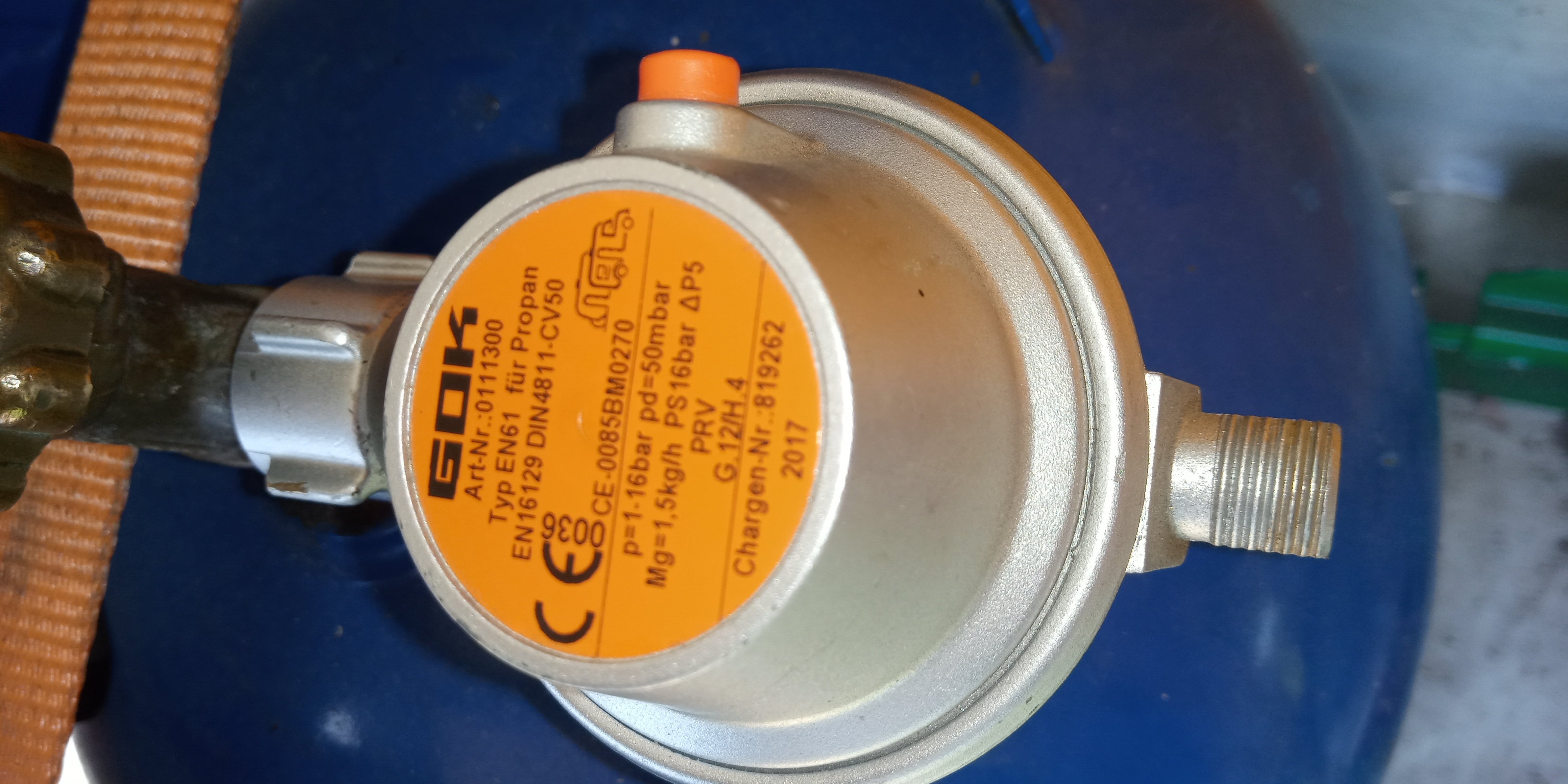Wygląda na to że się zawiesił. Po miesiącu postoju? Przedmuchałem go sprężonym powietrzem z obu stron i niby puścił, jednak po odpaleniu wszystkich gazowych urządzeń ciśnienie w instalacji zauważalnie spada. Po urlopie będzie wymiana, awaryjnie wezmę domowy. Pomarańczowy korek to zawór bezpieczeństwa przed zbyt wysokim ciśnieniem w instalacji.