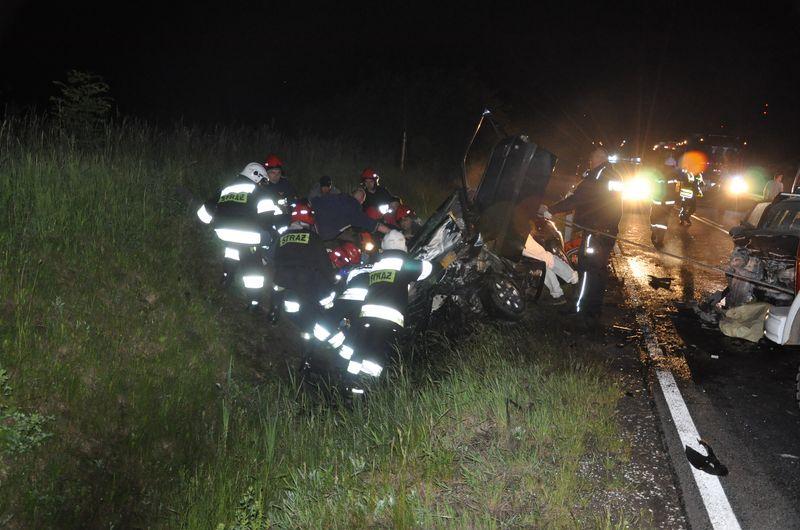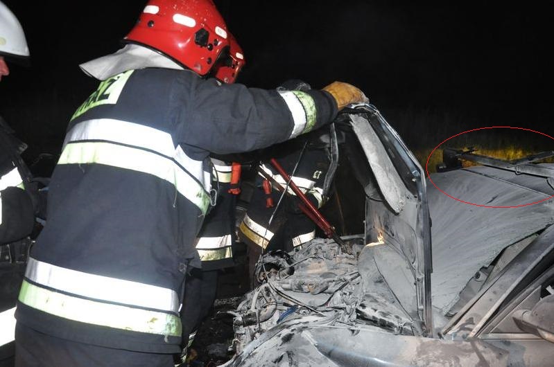 Dwóch mężczyzn, jadących Fordem zostało zakleszczonych w mocno rozbitym pojeździe. Strażacy przez kilkanaście minut uwalniali ich przy użyciu sprzętu hydraulicznego. Dodatkowym utrudnieniem był fakt, że samochód stał niestabilnie na skarpie, wobec czego musiał być asekurowany na linie przyczepionej do wozu pożarniczego.
