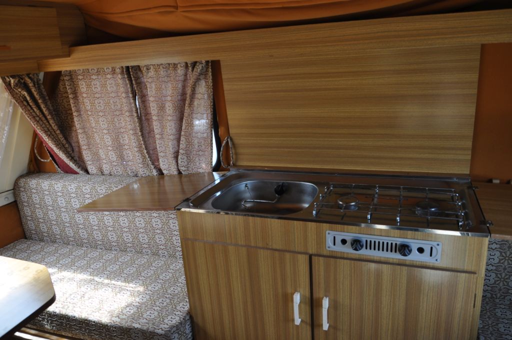 W naszej przyczepie kiedyś musiała jeździć jakaś lodówka bo ktoś przerobił szafkę. Wywalono drzwiczki i przesunięto środkową przegrodę poszerzając prawą komorę szafki żeby wlazła lodówka. Oryginalnie szafka kuchenna w N-127 ma dwoje identycznych drzwi, jest podzielona równo na pół: