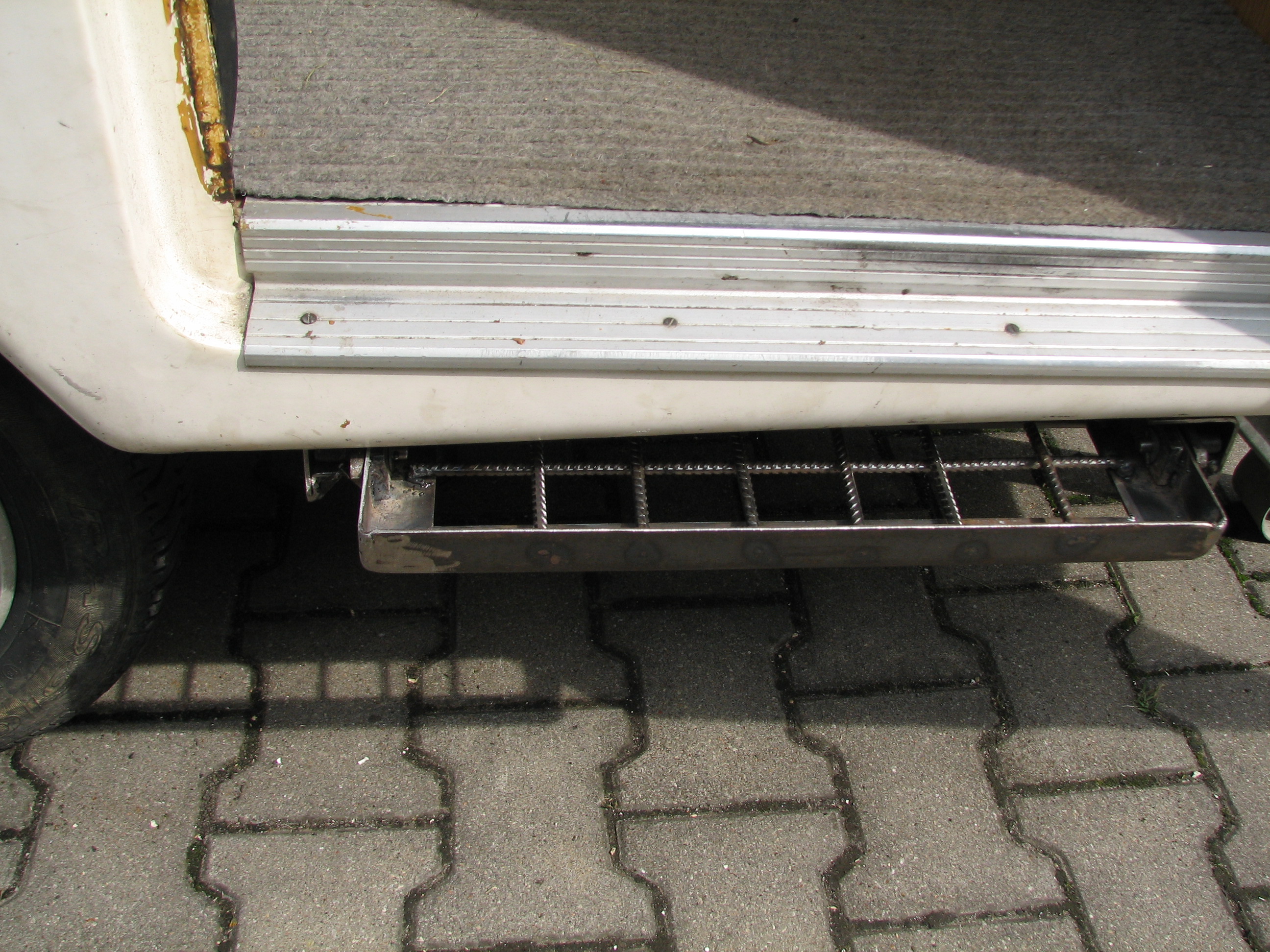 Elektronika elektroniką, mikroprocesorowe sterowanie Trumą działa niezawodnie, więc postanowiłem wyżyć się nieco w mechanice. Ponieważ używany dotąd schodek uległ zmęczeniu materiałowemu i sobie popękał, postanowiłem zrobić rozkładany stopień zamocowany do przyczepy. Trafiłem na forum na opis stopnia wykonanego przez kol. Slawol74 i uznałem, że jest to znakomita inspiracja do własnej konstrukcji. Właśnie dzisiaj zakończyłem prace i stopień został zamontowany w mojej przyczepie. Na razie nie jest ocynkowany, bo moje umiejętności spawalnicze są, jakie są i wolę najpierw nieco przetestować wytrzymałość spoin w użytkowaniu. Na zimę zostanie zdemontowany i pójdzie do piaskowania i cynku, jeśli spoiny się nie rozlecą, oczywiście.