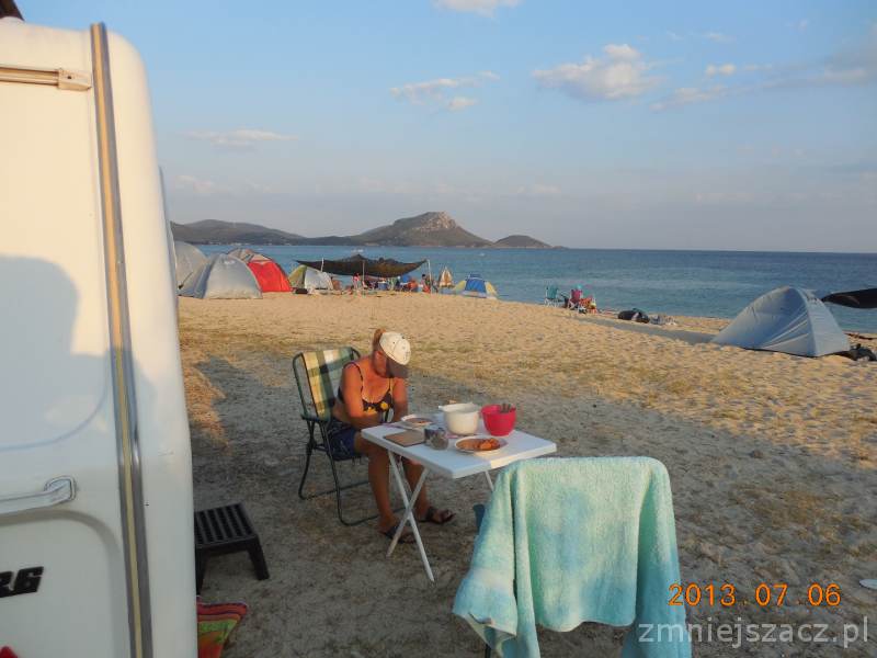 Miejscówka po byłym kempingu tylko my i Grecki kamper dalej w tle bar - parasole na plaży i za dnia trochę ludzi