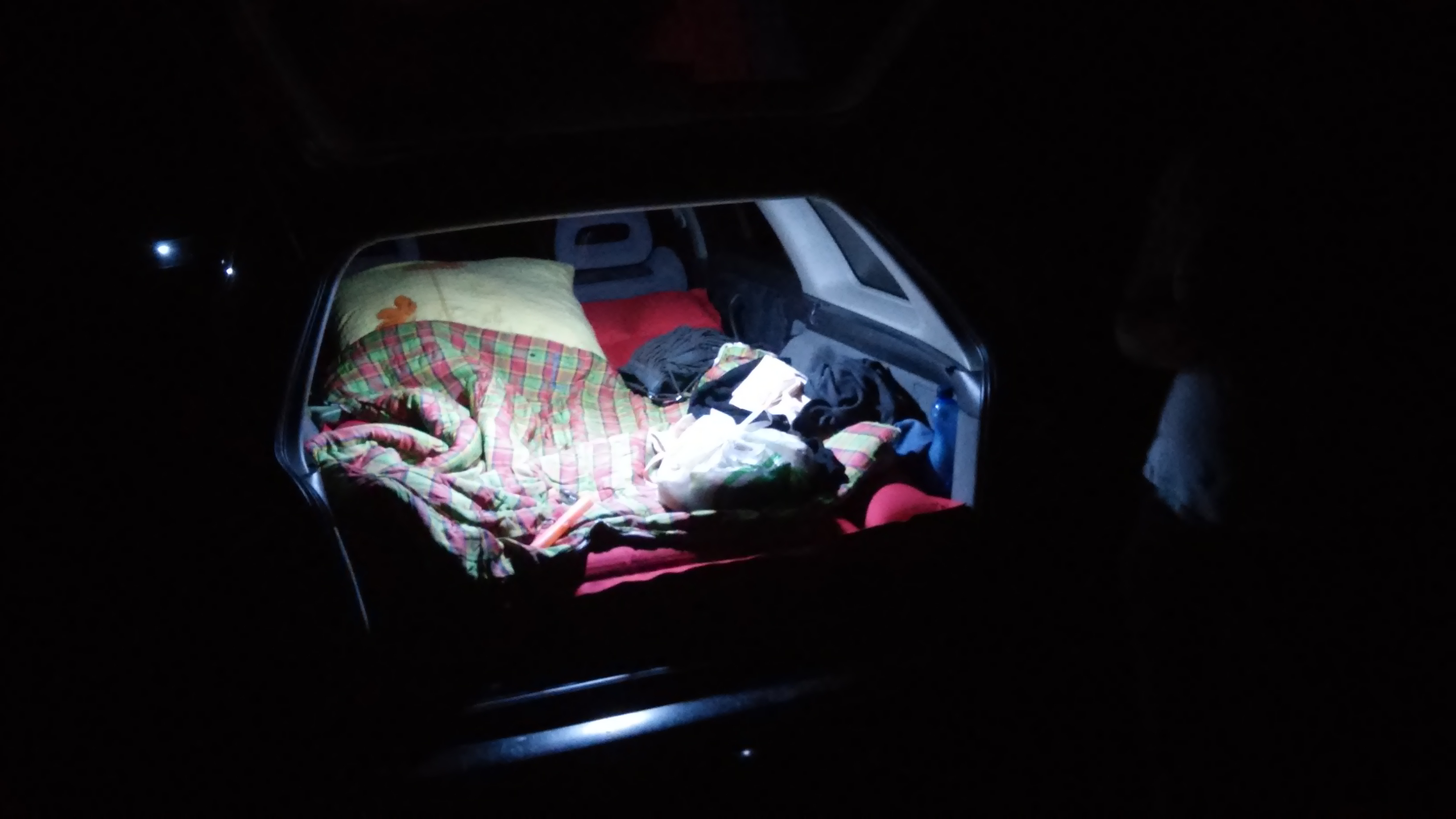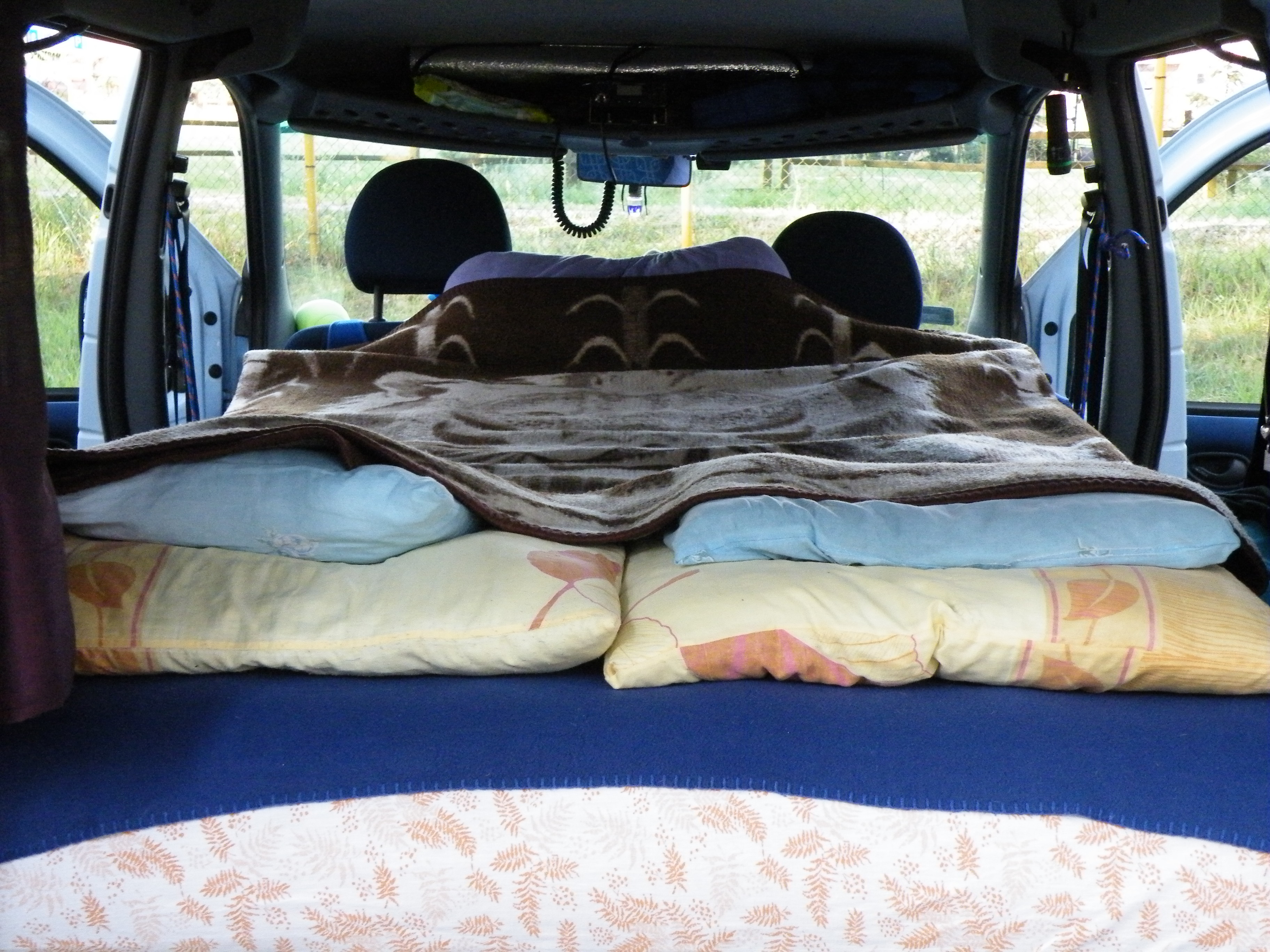 Nissan Primera WP11. Nadmuchany materac (pompka elektryczna podłączona pod zapalniczkę w bagażniku) i daje radę bez większych problemów. Na czas spania tylko wszystkie bagaże lądowały na przednich siedzeniach.