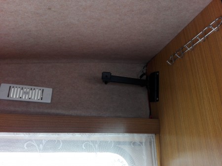 Zasilanie TV i anteny w suficie szafy, a z boku wystają tylko końcówki do podłączenia. Oczywiście, podczas przejazdów TV jest demontowany. TV Mistral 19' z wbudowanym dekoderem DVBT. Jest lekki i względnie mało prądożerny.