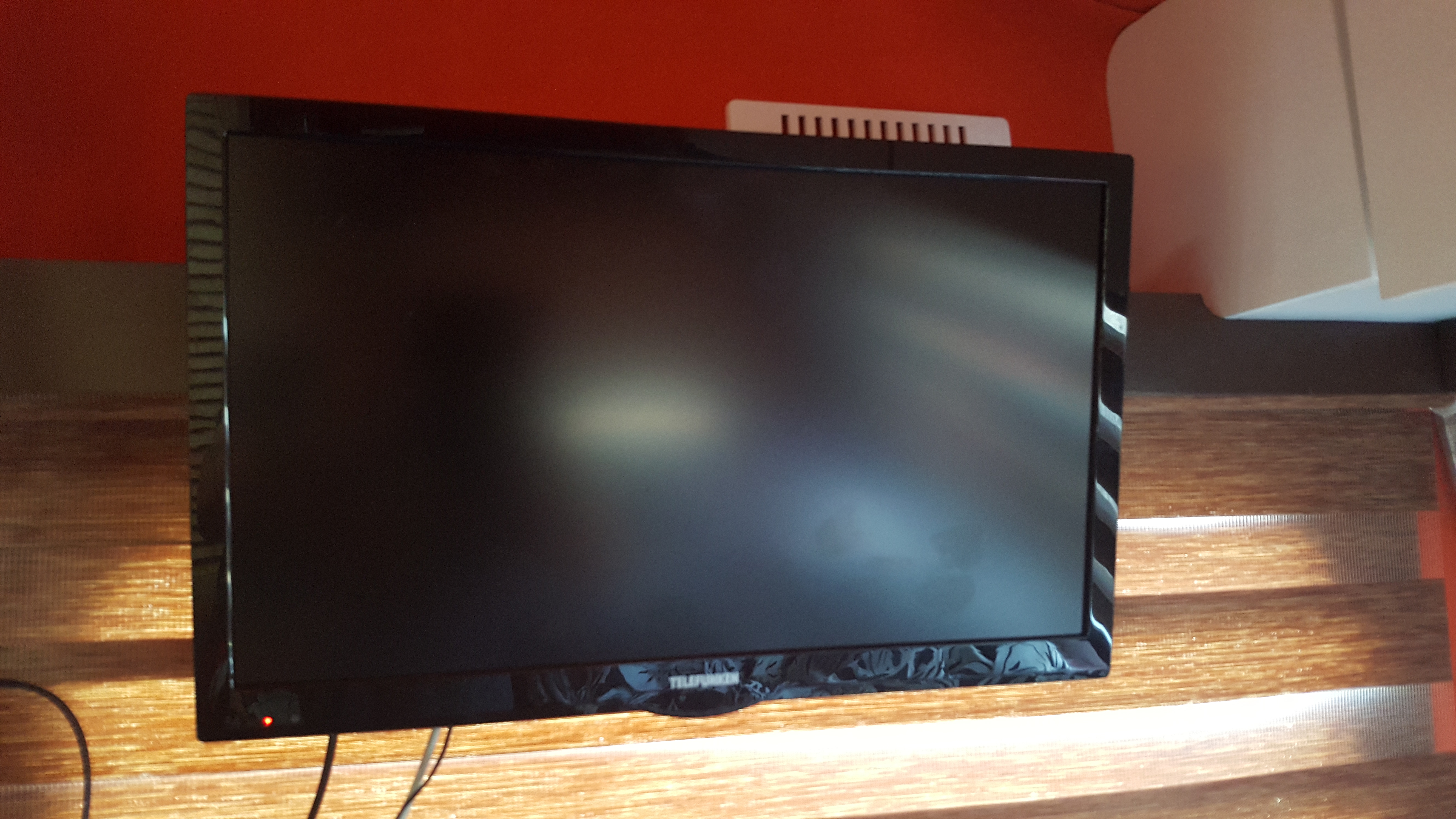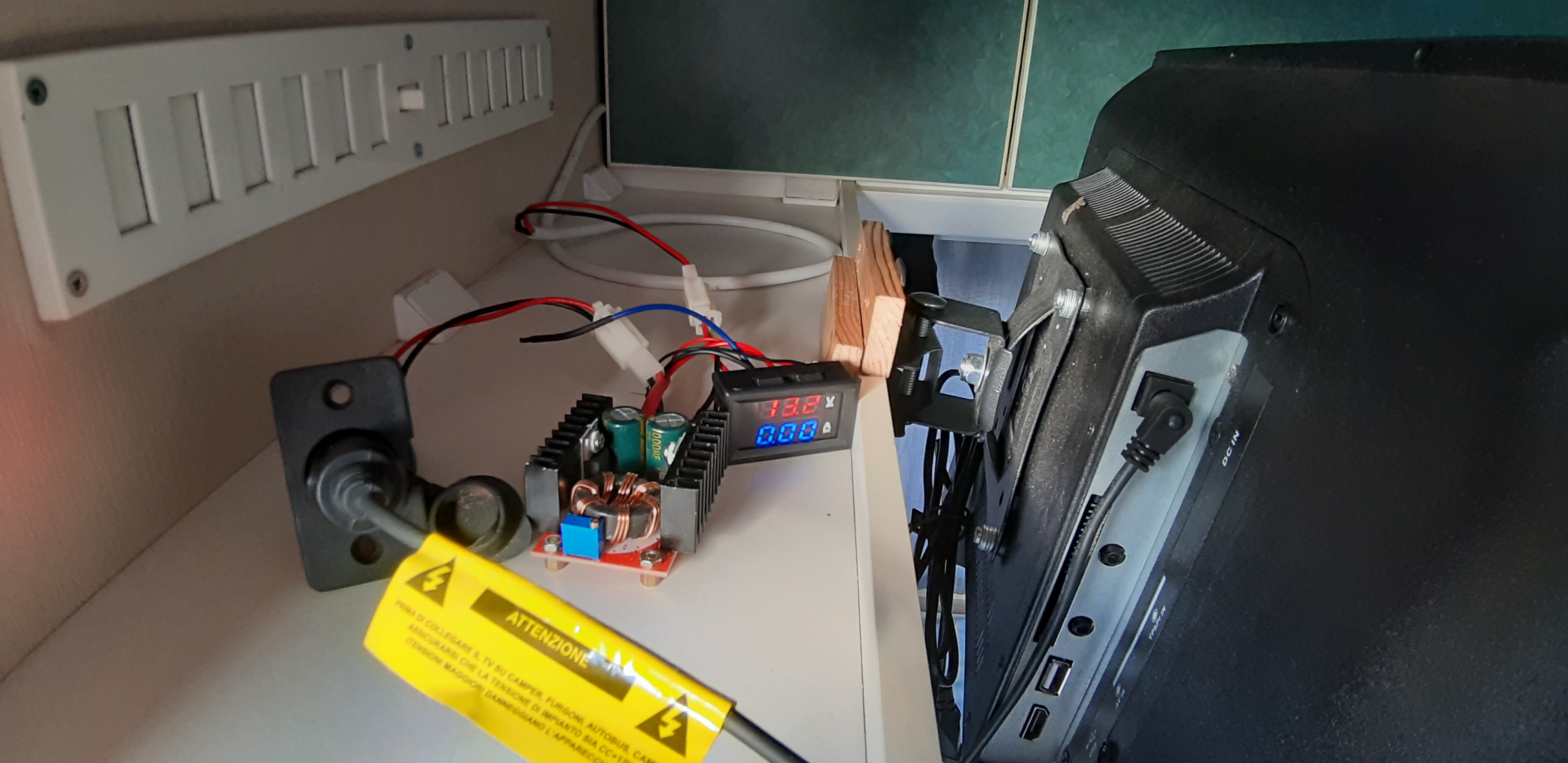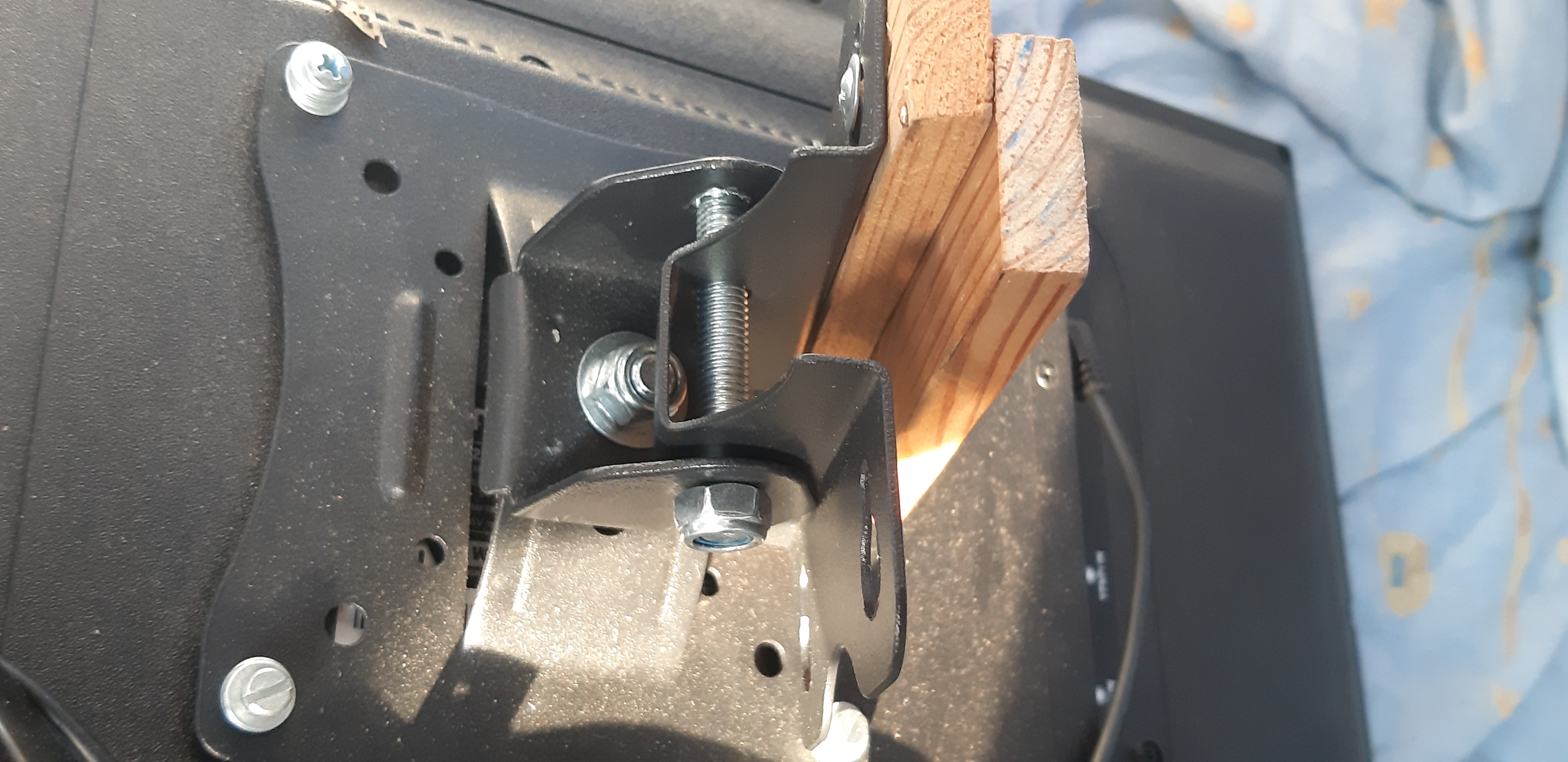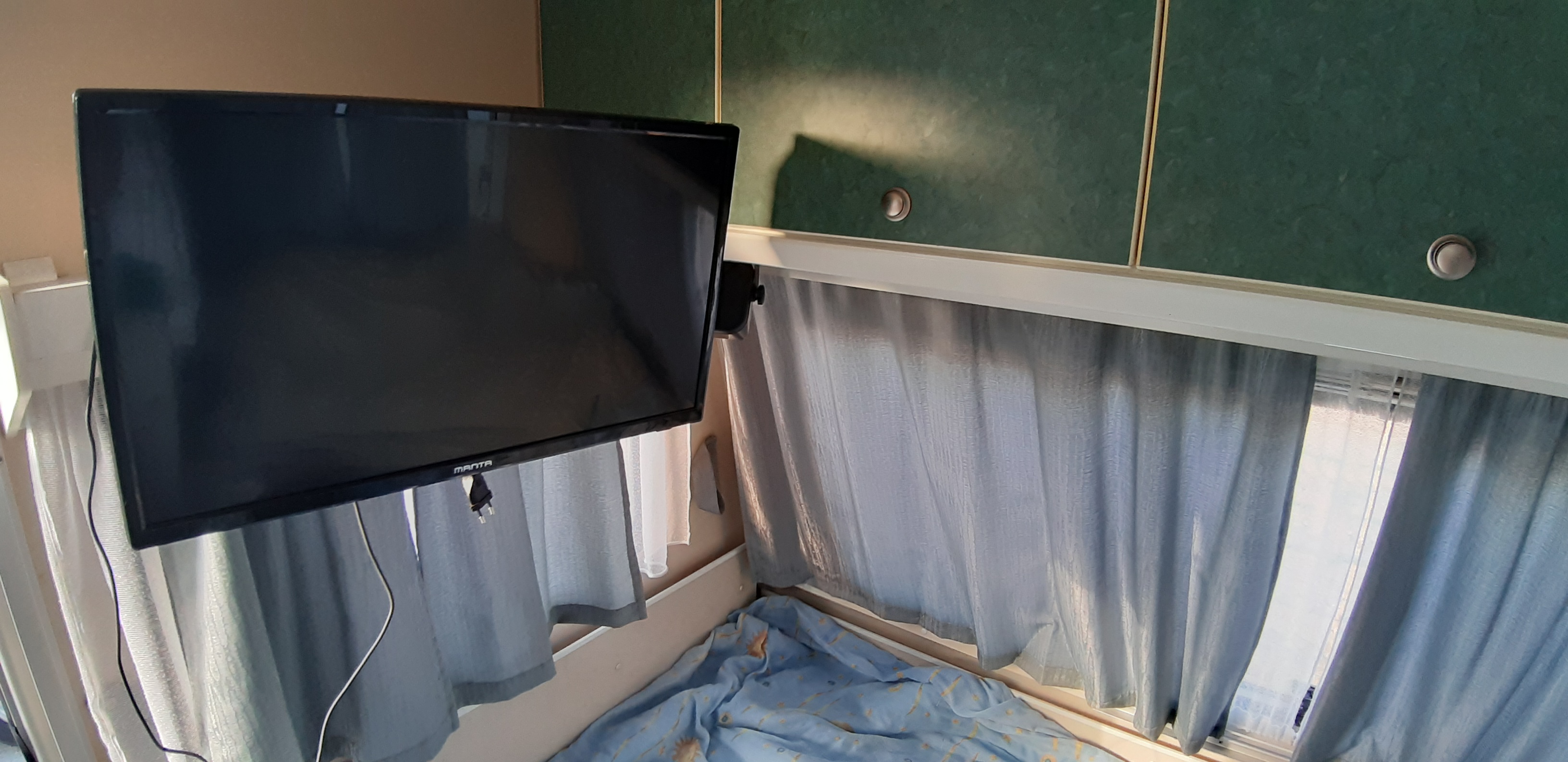 Uchwyt kupiłem, ale nie przyszedł na czas i zrobiłem swój. Chyba zostanie na dłużej, jest całkiem spoko. Tv wieszam na tej otwartej półce, po prostu zahaczam za krawędź w czasie jazdy jest zabezpieczony na łóżku.